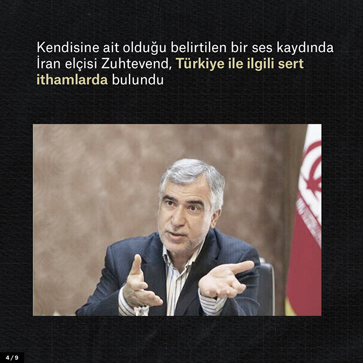Kendisine ait olduğu belirtilen bir ses kaydında İran elçisi Zuhtevend, Türkiye ile ilgili sert ithamlarda bulundu. Zuhtevend, Türkiye'yi karadan Kafkaslar ve Azerbaycan'a bağlayacak olan koridorla Kafkaslar ile bağlantısının kesilmek istendiğini öne sürdü