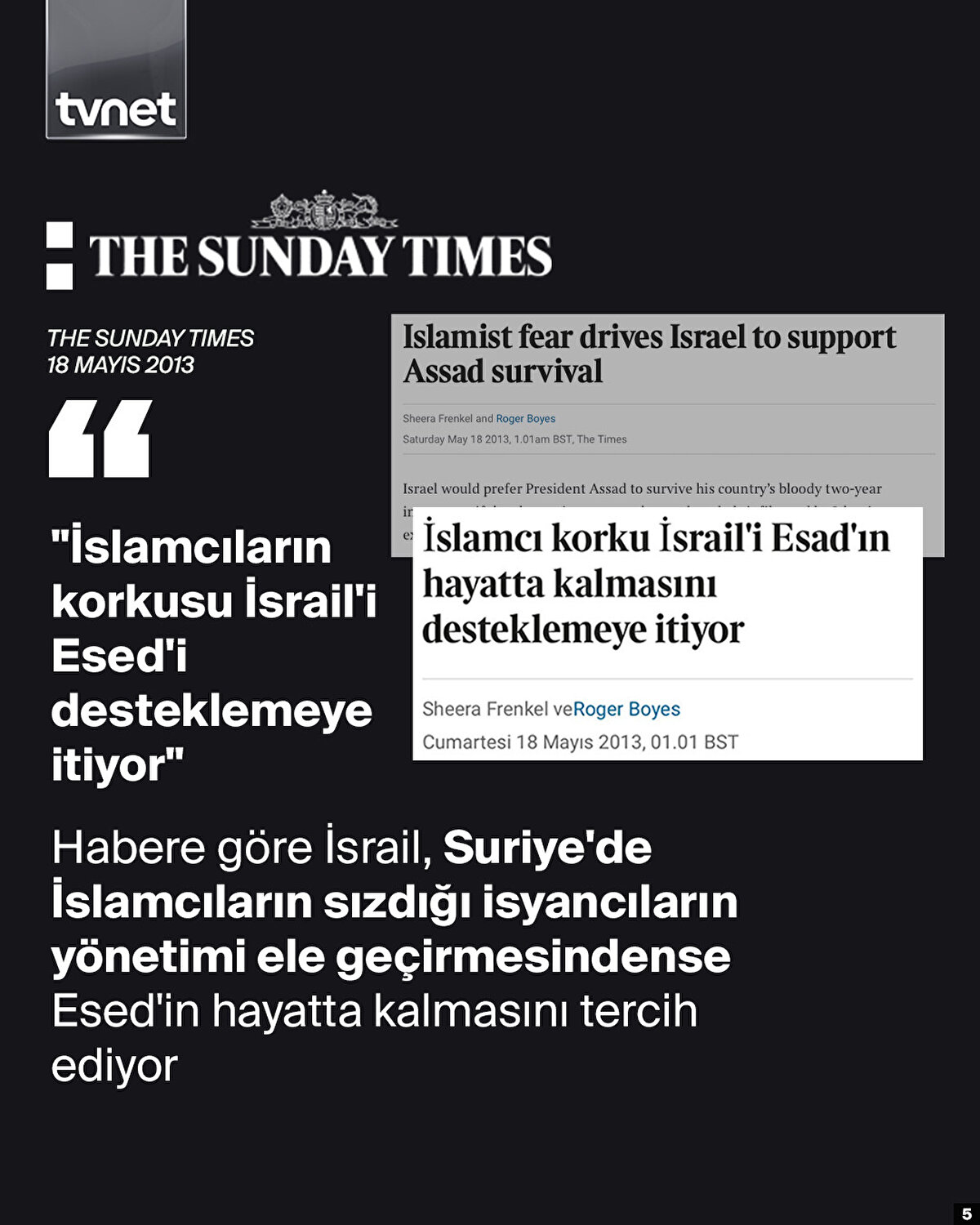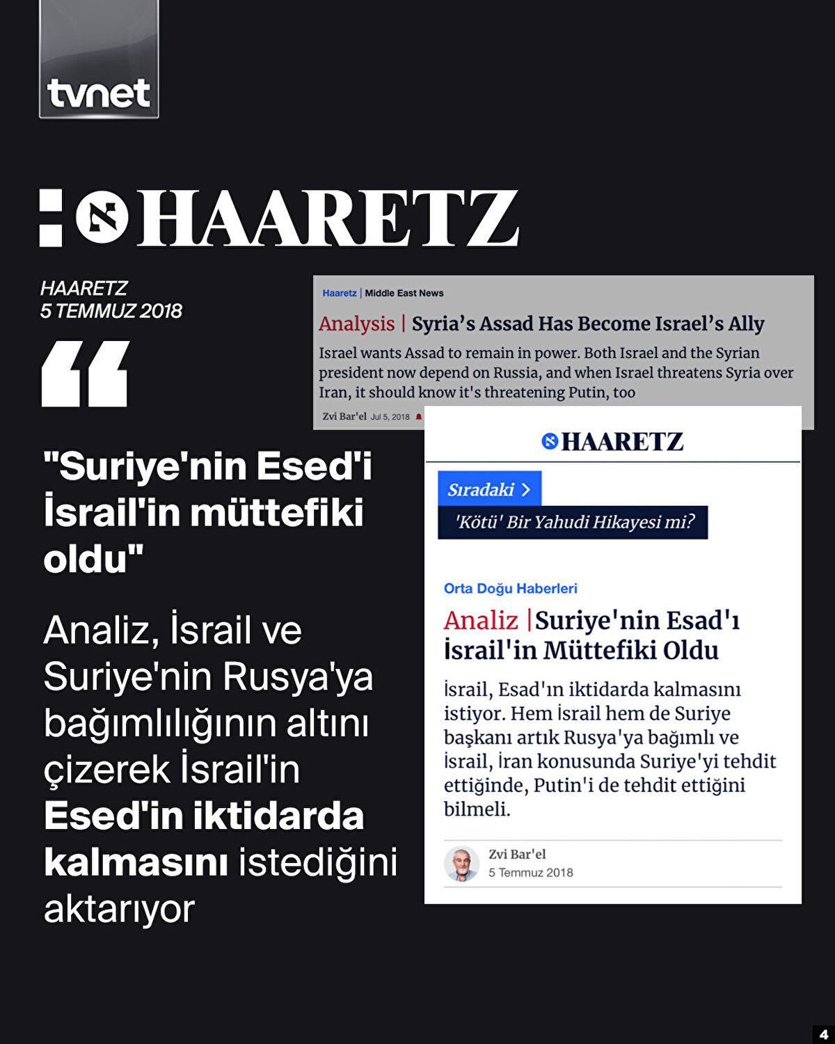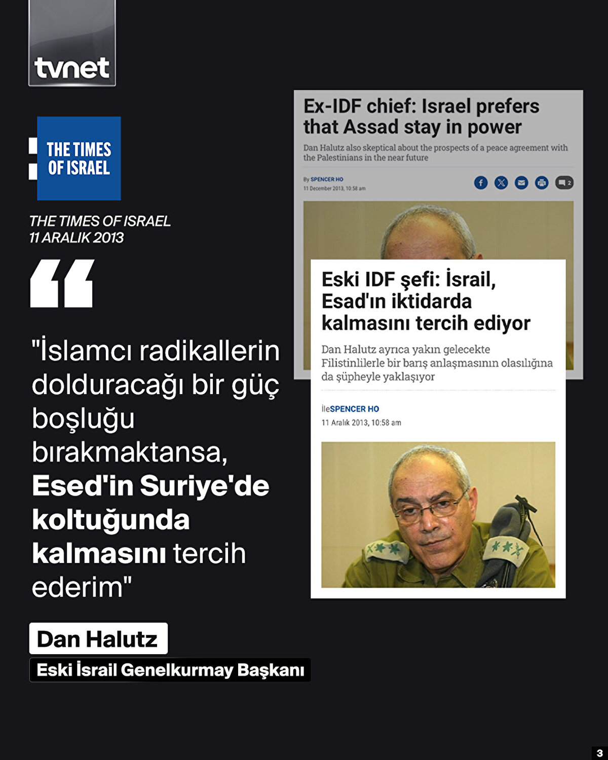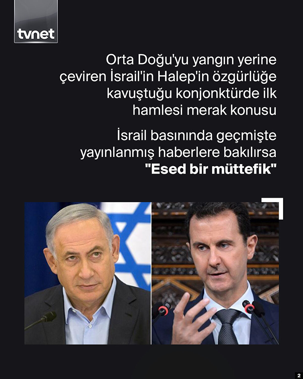 Orta Doğu'yu yangın yerine çeviren İsrail'in Halep'in özgürlüğe kavuştuğu konjonktürde ilk hamlesi merak konusu. İsrail basınında yayınlanmış geçmiş tarihli haber ve analizlere bakılırsa "Esed bir müttefik". Times of İsrael, Haaretz ve The Sunday Times gibi İsrail kaynaklı haber sitelerinde hükümetin yaklaşımı şu sözlerle ifade ediliyor: "İsrail Suriye'de İslamcı radikallerin dolduracağı bir güç boşluğundansa Esed'in koltuğunda kalmasını tercih eder."