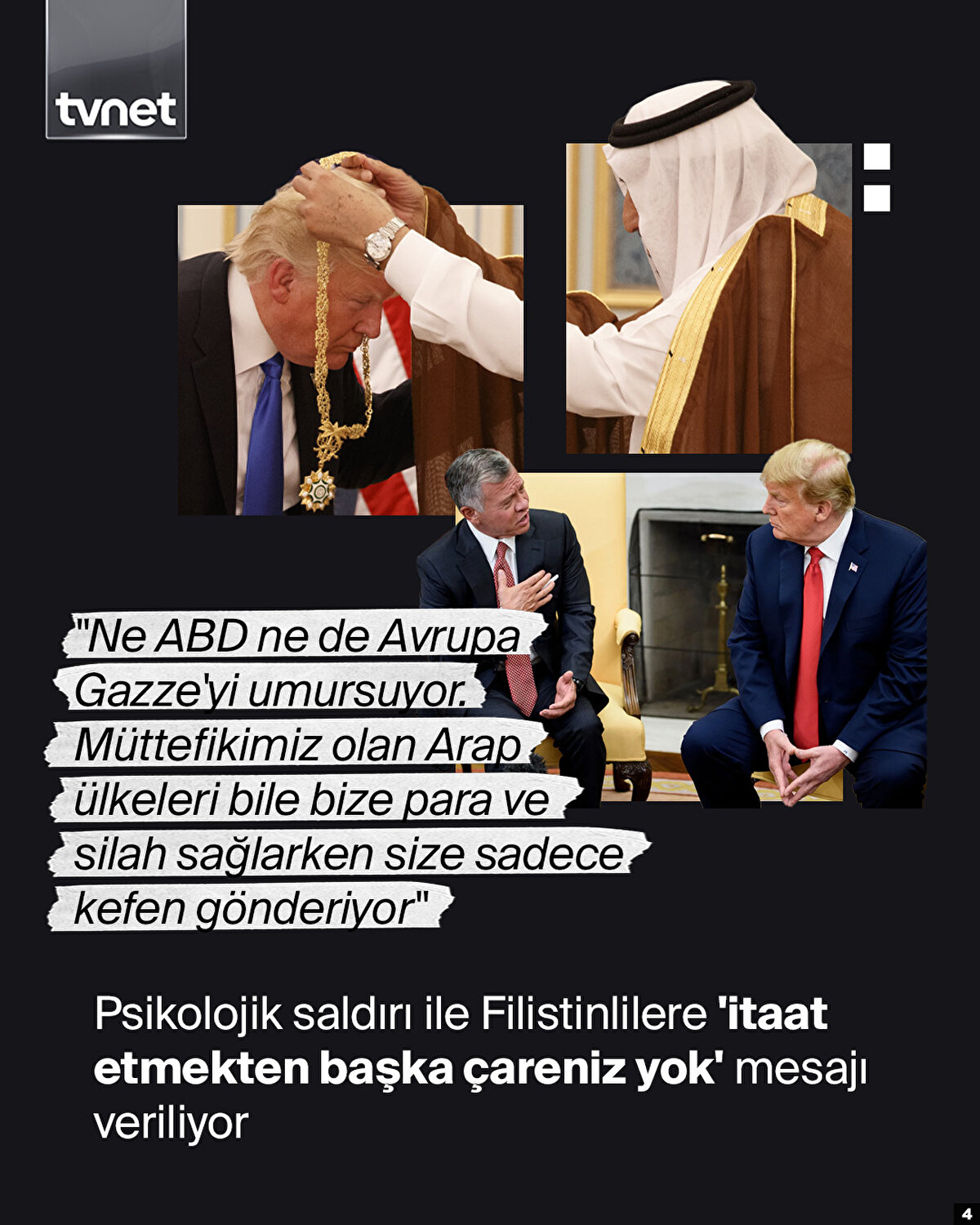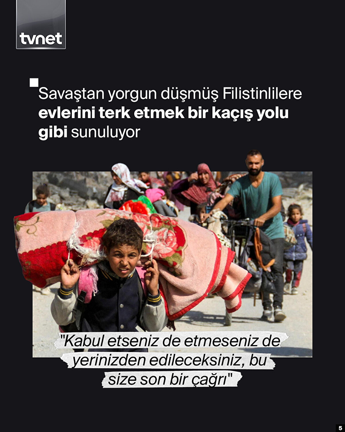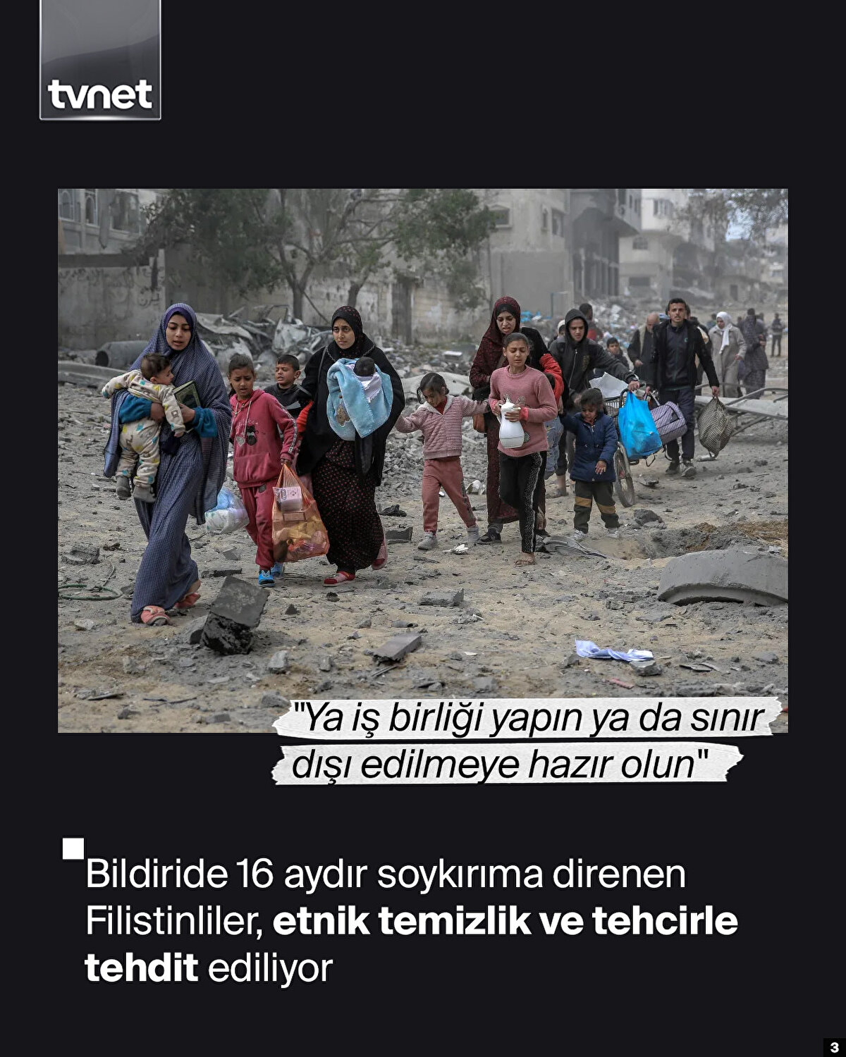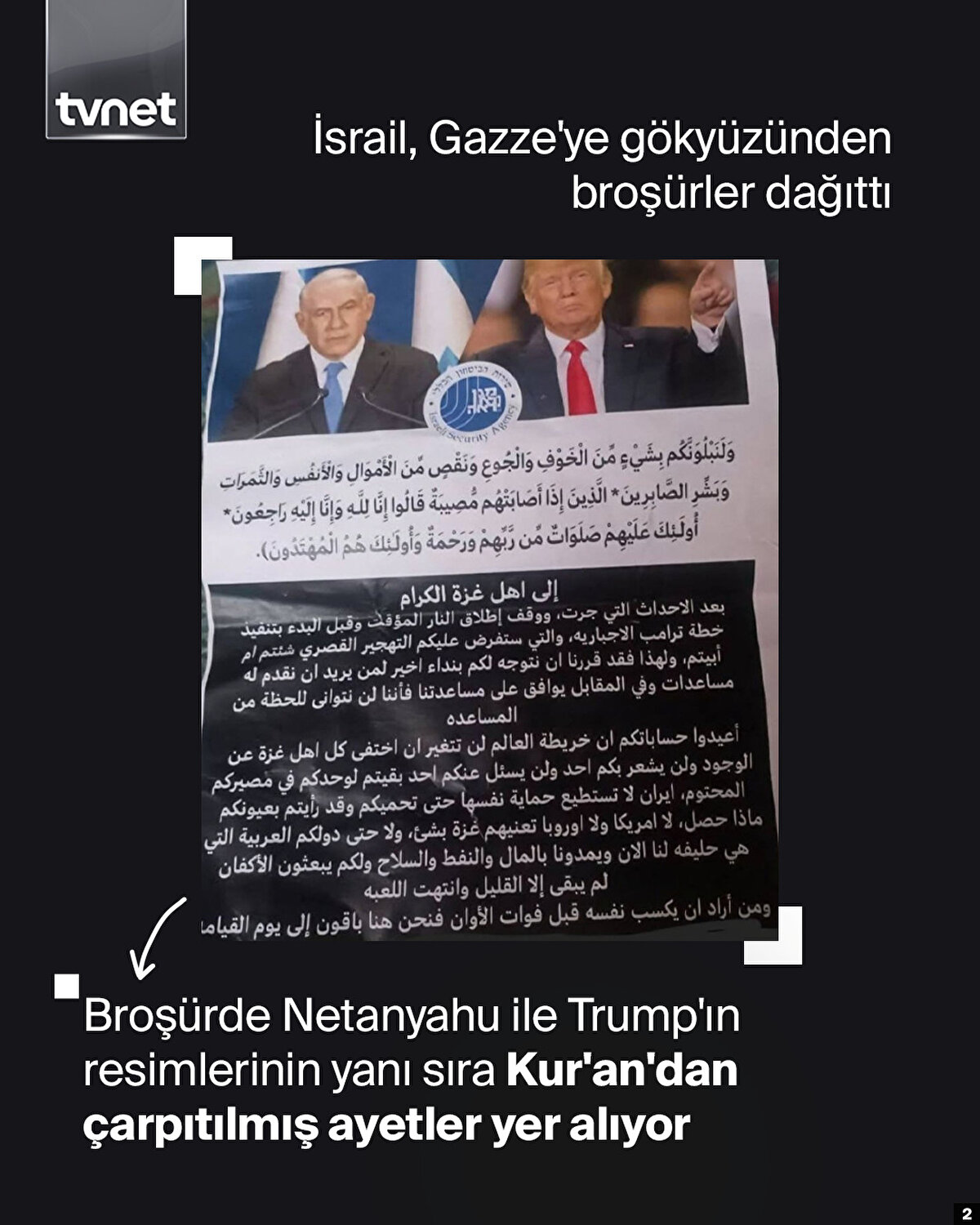 İsrail Gazze'ye havadan attığı broşürler aslında savaş suçlarının itirafı niteliğinde. Netanyahu ile Trump'ın resimlerinin yanı sıra Kuran'dan çarpıtılmış ayetlerin yazılı olduğu broşürle, 16 aydır soykırıma direnen Filistinliler, etnik temizlik ve tehcirle tehdit ediliyor. Bu psikolojik saldırının amacı, Filistinlilere 'itaat etmekten başka çareniz yok' mesajı vermek.
