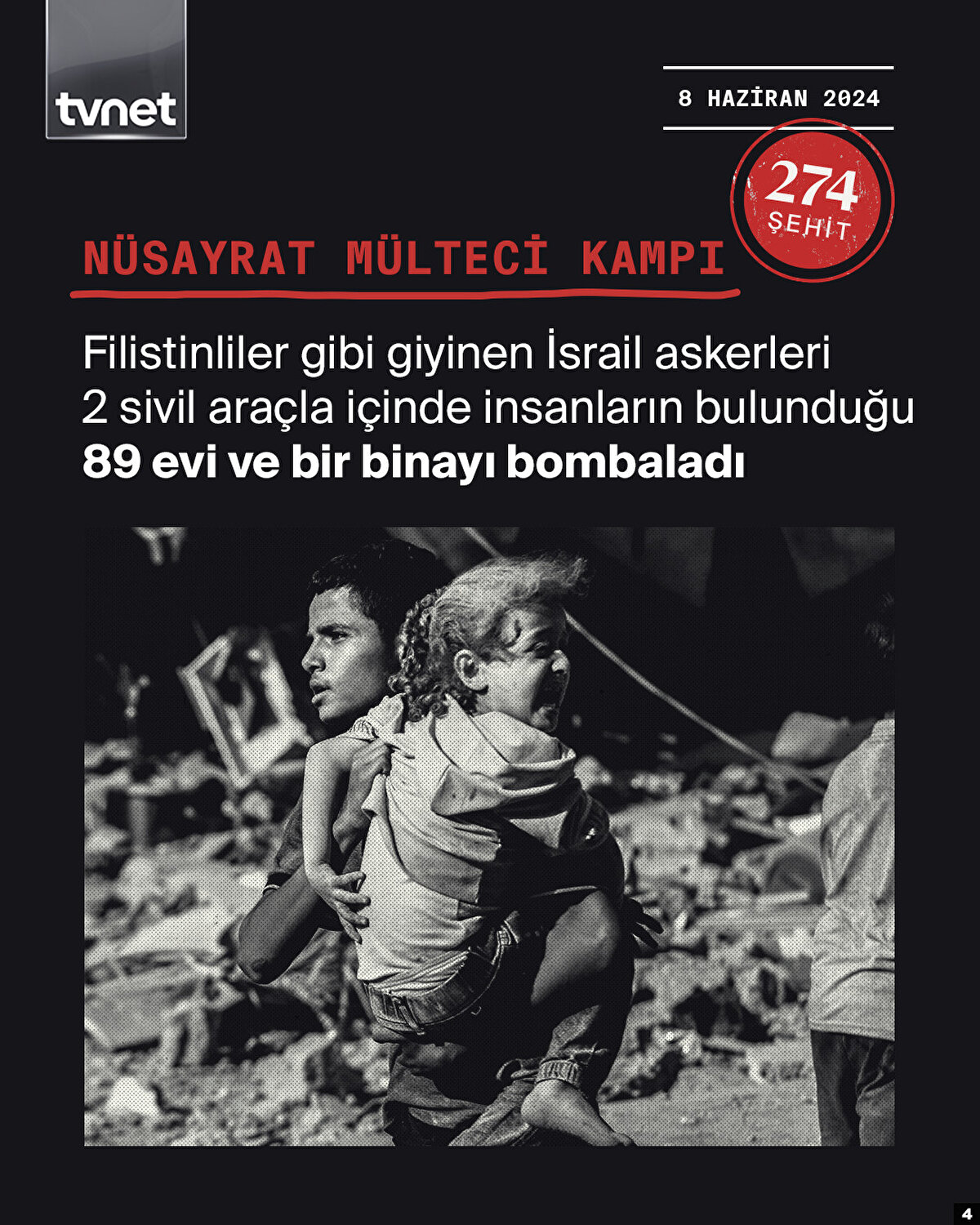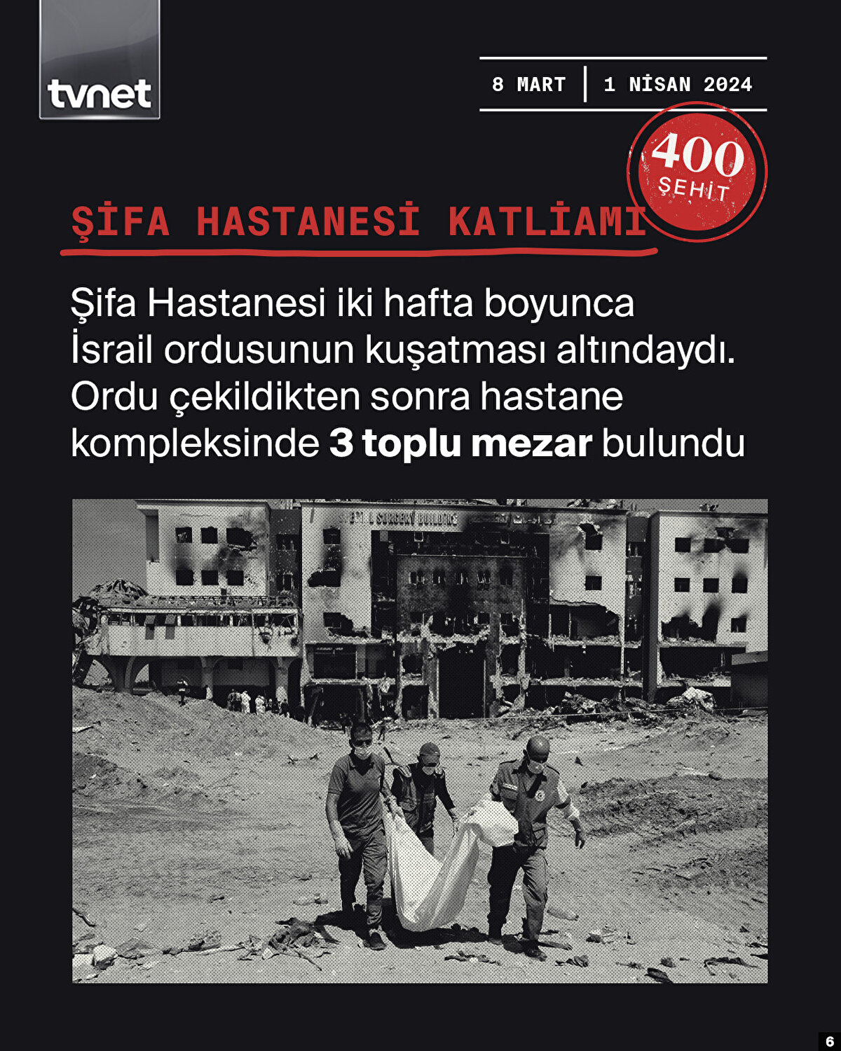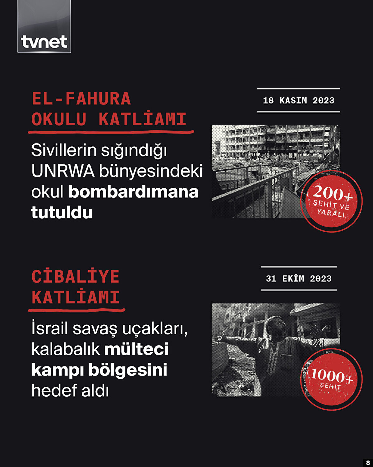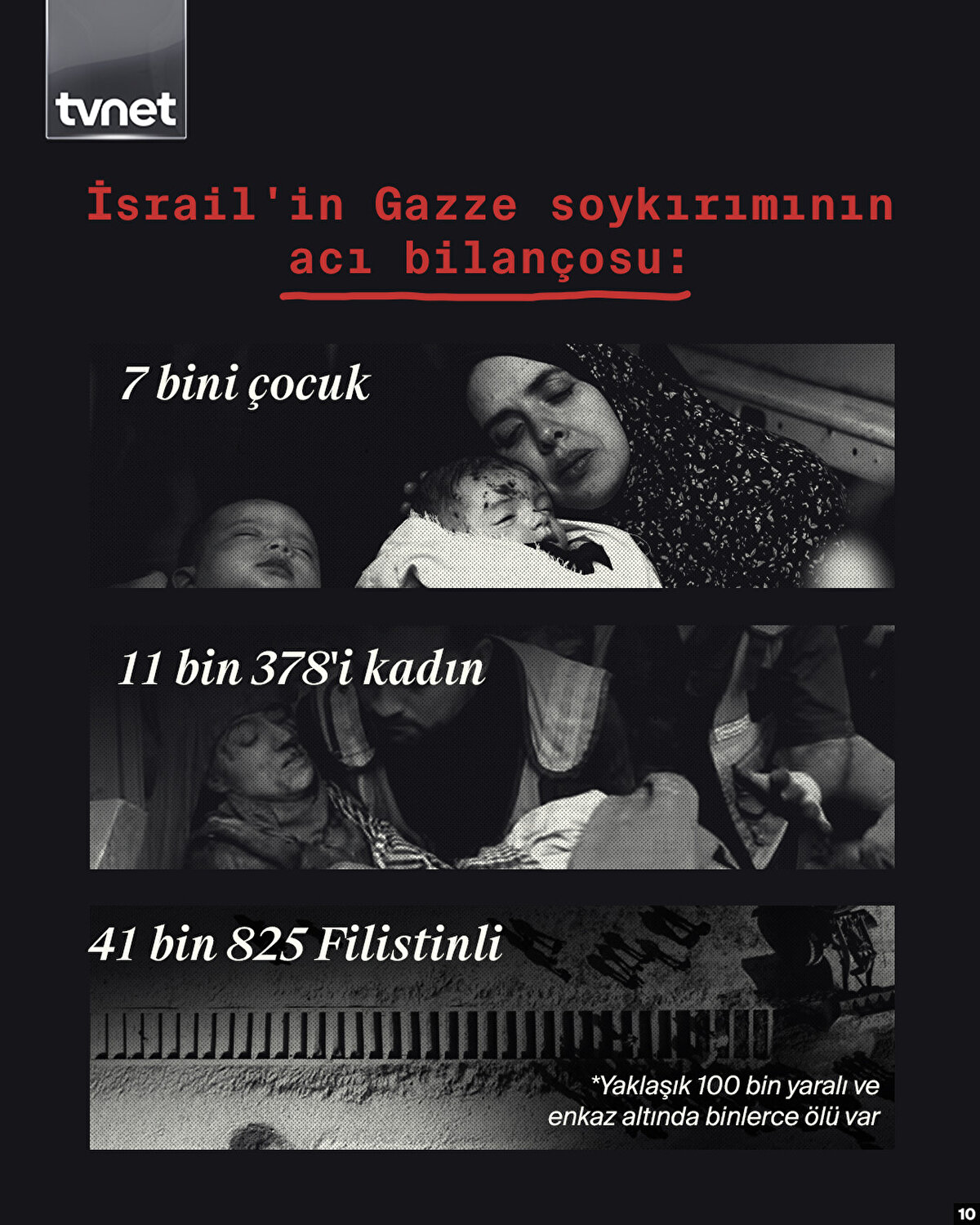İsrail, 7 Ekim 2023'ten bu yana, bir yıl boyunca Gazze'de Filistinlilere karşı insanlık tarihinin en acı soykırımlarından birini gerçekleştirdi. İnsanlığın ve tüm dünyanın gözleri önünde işlenen bu acı katliamda 17 bini çocuk, 11 bin 378'i kadın olmak üzere 41 bin 802 Filistinli öldü ve 100 bine yakın kişi yaralandı. Enkazlar altında ise hala binlerce can yatıyor.