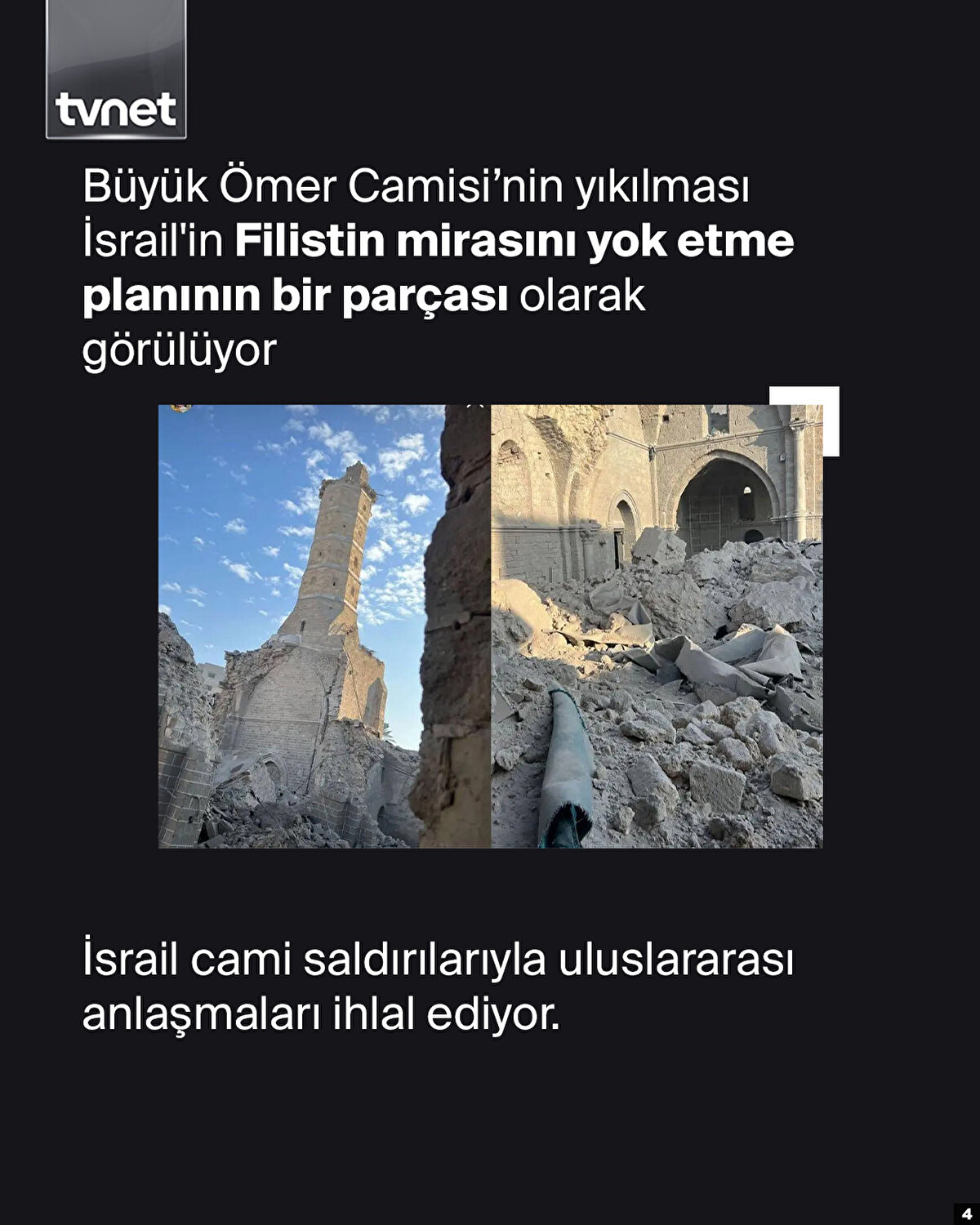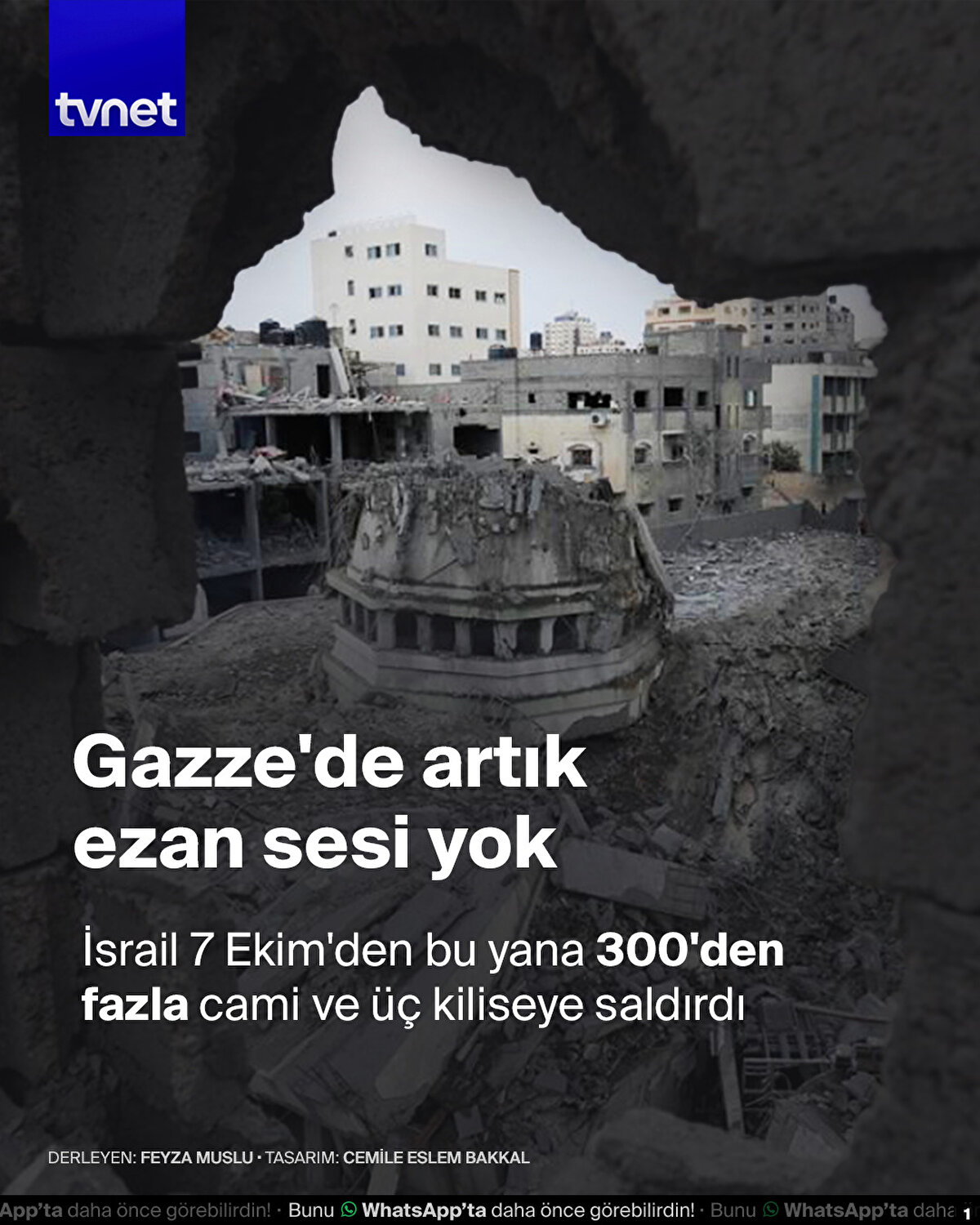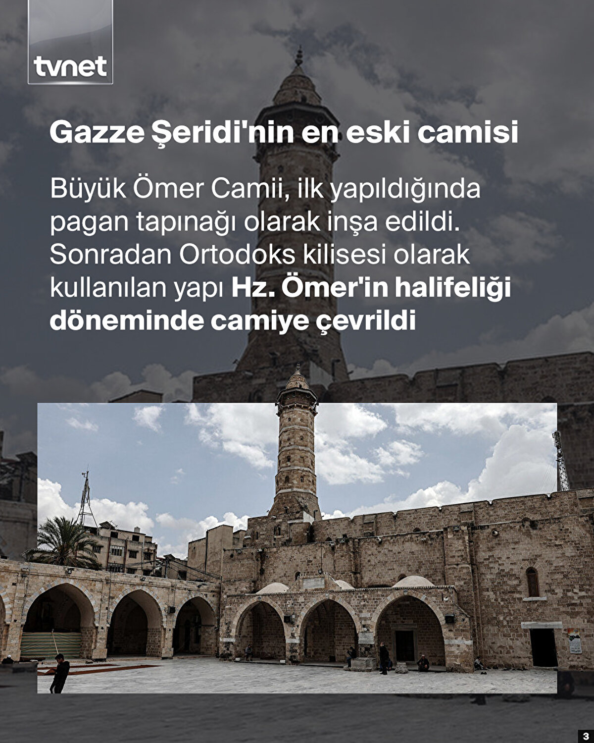 Gazze'de 7 Ekim'den bu yana 300'den fazla camii tahrip edildi. Gazzeli halkı yok etmek için her gün üzerlerine bomba yağdıran İsrail, aynı zamanda kültürel ve dini değerleri de yok etmeye uğraşıyor. Hz. Ömer'in hilafeti döneminde camiye çevrilen Büyük Ömer Camisi'ni de bombalayan İsrail'in bu yaptıkları Filistin mirasını yok etme planının bir parçası olarak görülüyor.