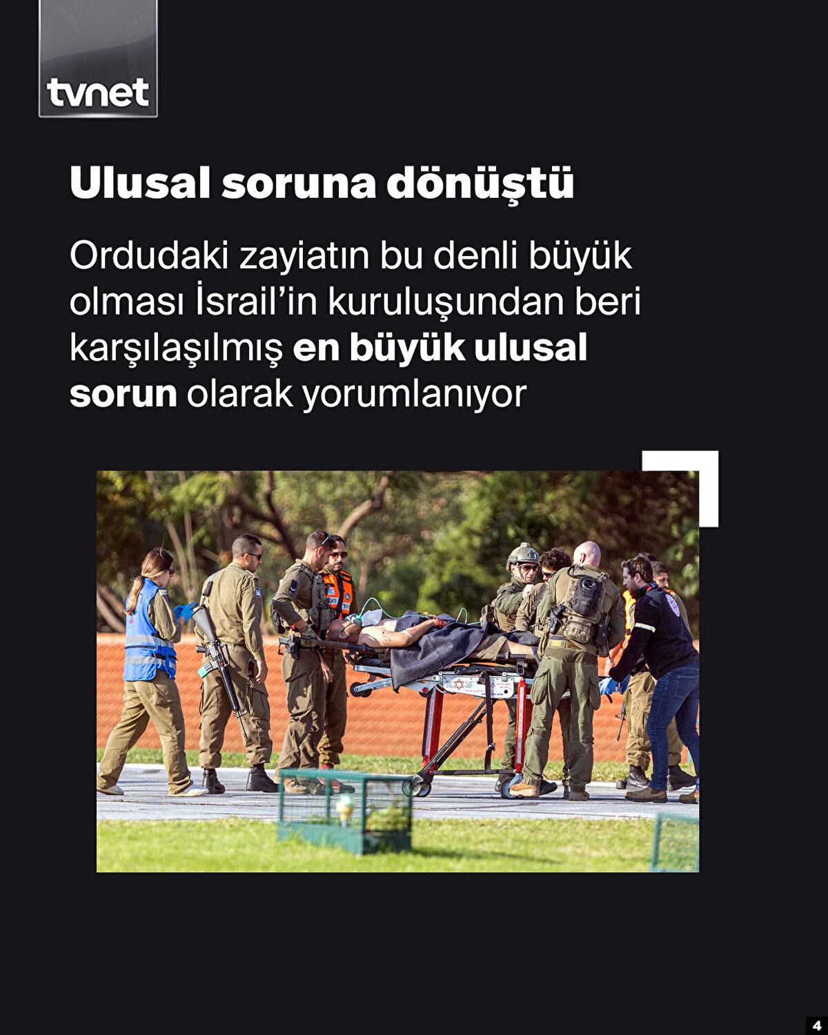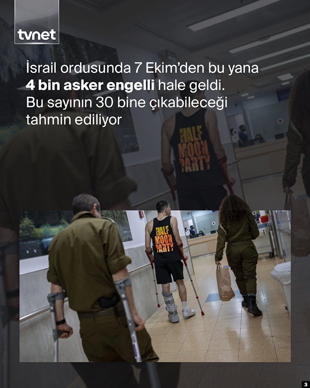 İsrail'in Gazze'de düzenlediği saldırılarda 7 Ekim bu yana 4 bin askerin engelli hale geldiği belirtildi. Bu sayısının 30 bine çıkabileceği tahmin ediliyor. İsrail Ordusu Engelliler Örgütü Başkanı Idan Kaliman'ın, "30 yıldır örgütün içindeyim, hiçbir zaman bu kadar çok sayıda ve durumu ağır yaralıyla karşılaşmadım. Uzuvları ampüte edilmiş, kör olmuş ya da felç geçirmiş çok sayıda yaralı var" açıklamalarında bulundu.