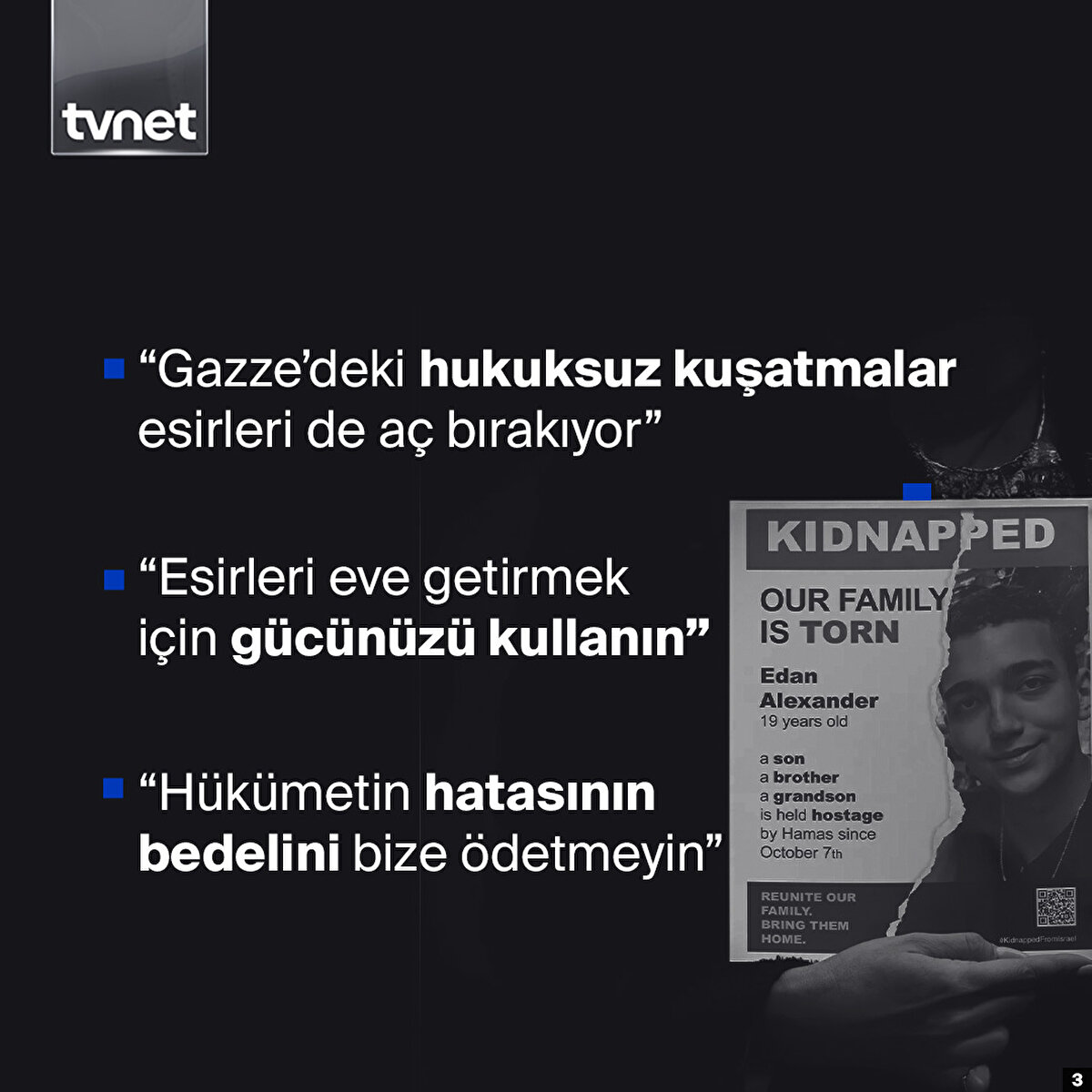 Hamas'ın askeri kanadı Kassam Tugayları 7 Ekim'de kaçırılan ve Gazze Şeridi'nde tutulan İsrailli esir Edan Alexander'ın görüntülerini paylaştı. Esir Alexander ABD'nin yeni seçilen Başkanı Donald Trump'tan Netanyahu'ya Gazze saldırılarına son vermesi için baskı yapmasını istedi. Trump'a “Lütfen Biden'ın yaptığı hatayı yapmayın” diyen İsrailli esir “Gönderdiğiniz silahlar şimdi bizi öldürüyor, kuşatmalar bizi aç bırakıyor” ifadelerini kullandı.