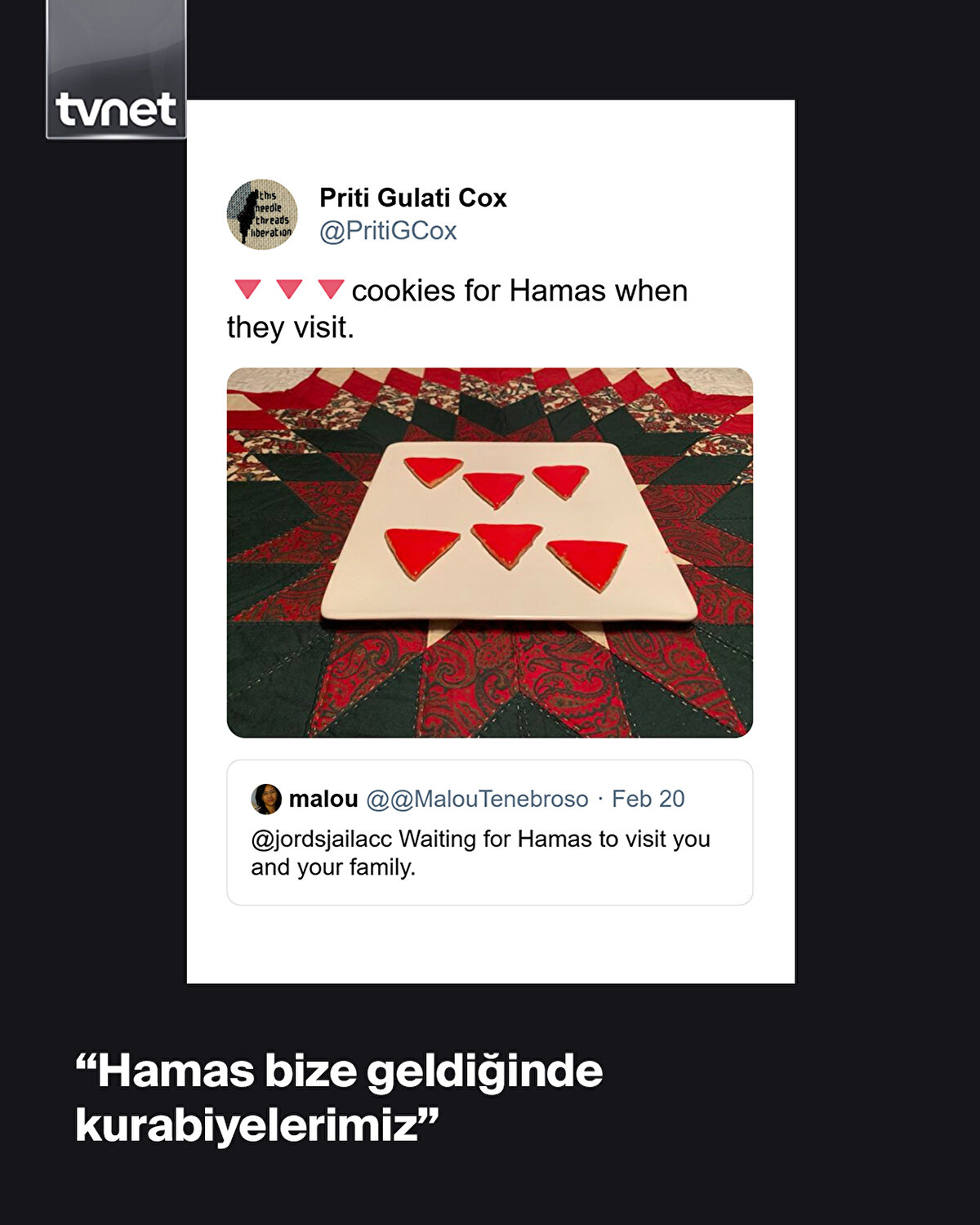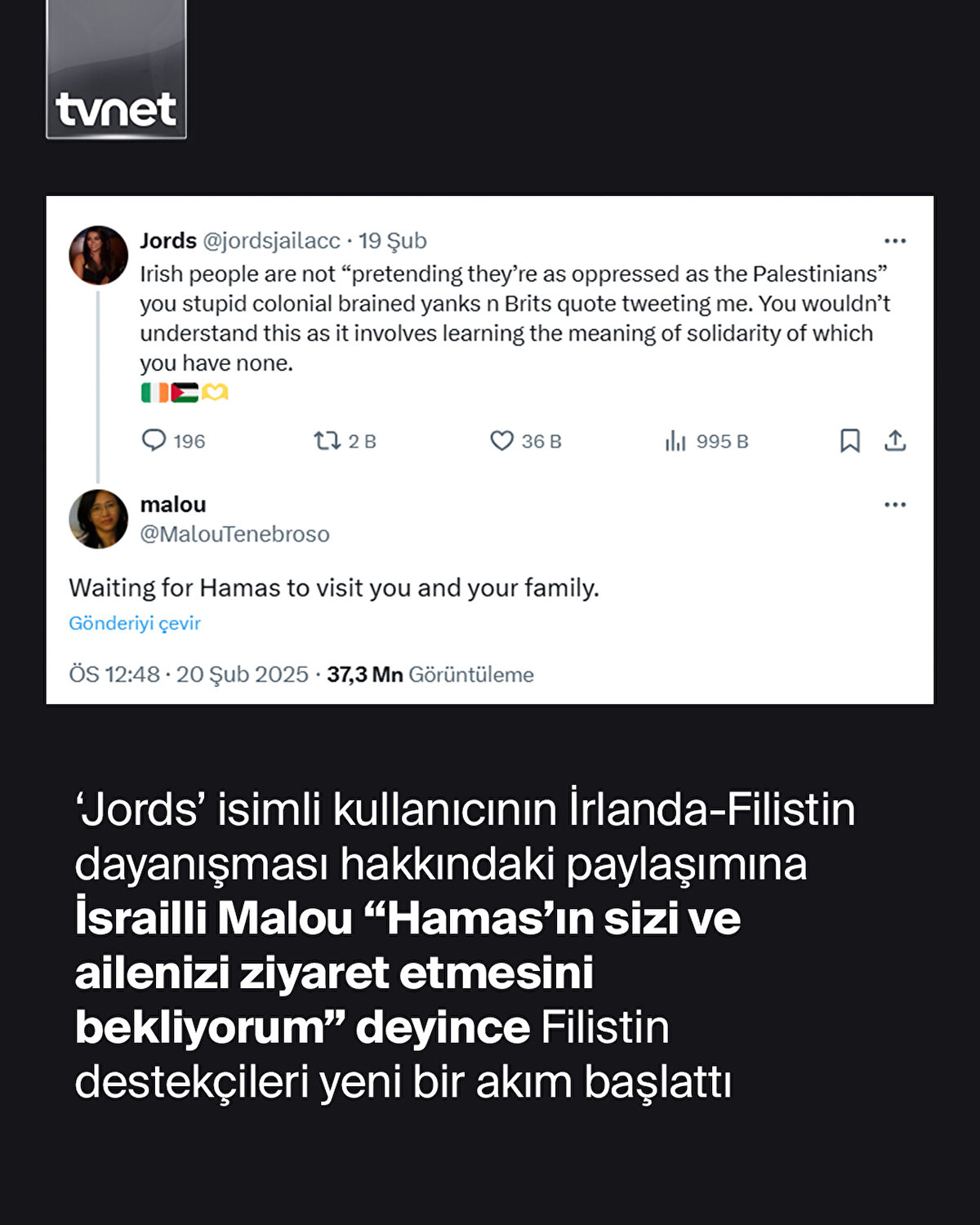 'Jords' isimli kullanıcının İrlanda-Filistin dayanışması hakkındaki paylaşımına İsrailli Malou “Hamas'ın sizi ve ailenizi ziyaret etmesini bekliyorum” deyince Filistin destekçileri yeni bir akım başlattı