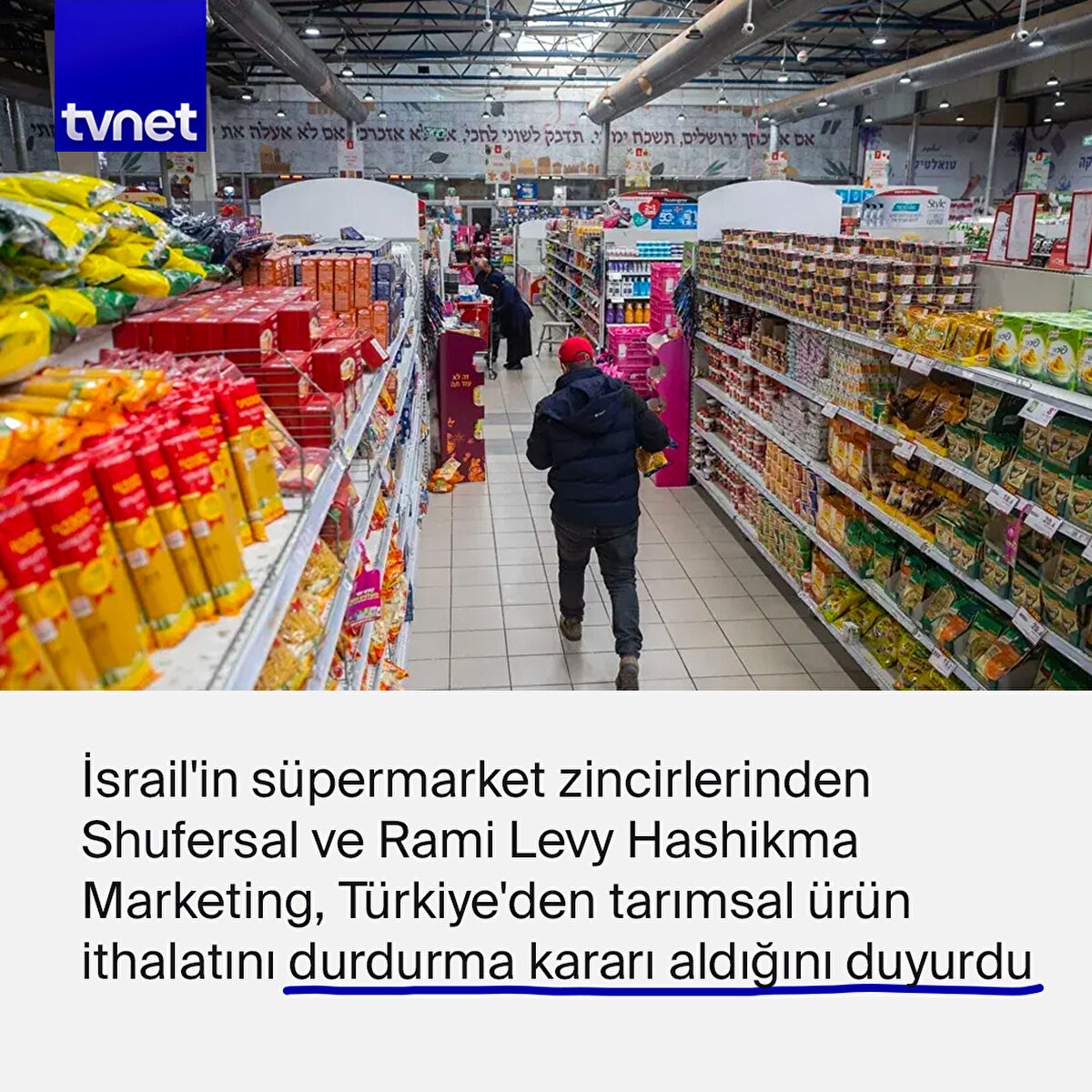 İsrail'in önde gelen iki süpermarket zinciri, Shufersal ve Rami Levy Hashikma Marketing, Türkiye'den tarım ürünleri ithalatını durdurma kararı aldıklarını açıkladı. BNN Breaking'in haberine göre boykot kararı iki ülke arasında gerginleşen ilişkilere ve Cumhurbaşkanı Recep Tayyip Erdoğan'ın Gazze'deki son savaşa ilişkin açıklamalarına karşı tepki olarak alındı. Yalnızca kurumsal kuruluşların değil, bireysel profesyonellerinin de yönettiği Türk ürünlerine yönelik de boykot uygulanacak. Boykotun tarımsal ürünlerle sınırlı kalmayıp giyim, elektronik ve hatta turizm dahil olmak üzere diğer Türk ürünlerine de sıçrayacağı ifade edildi.
