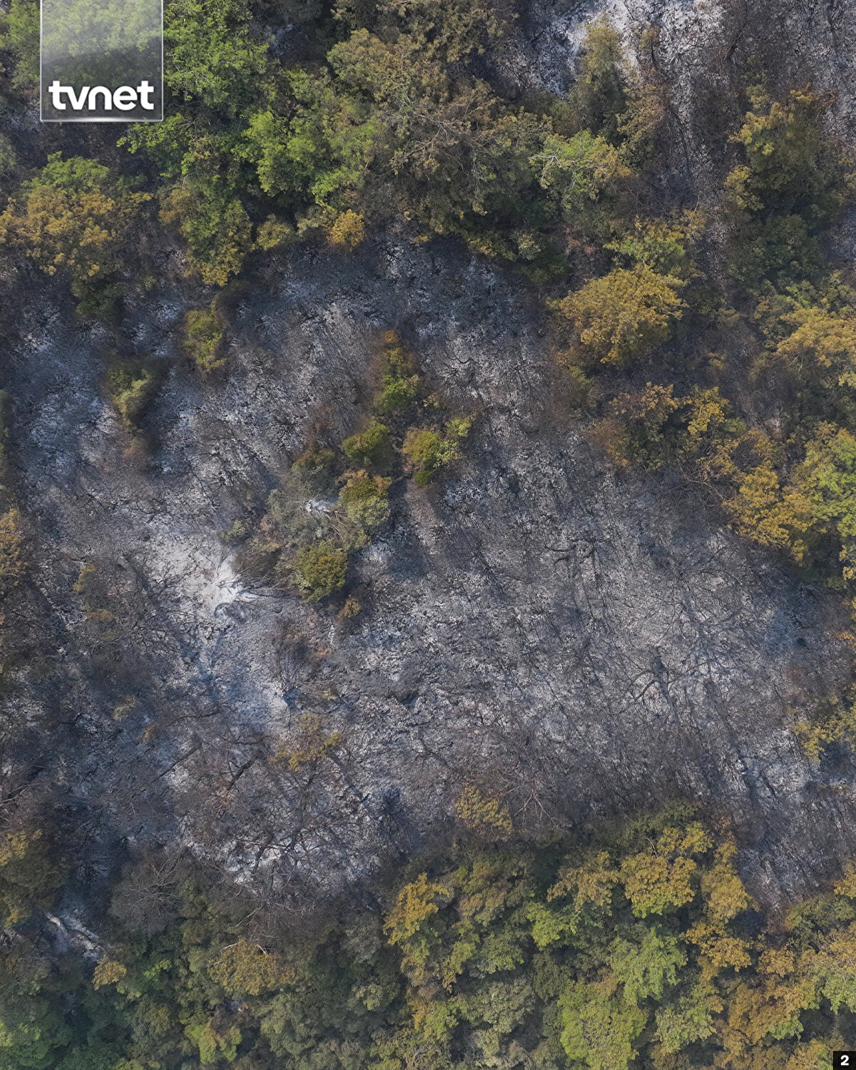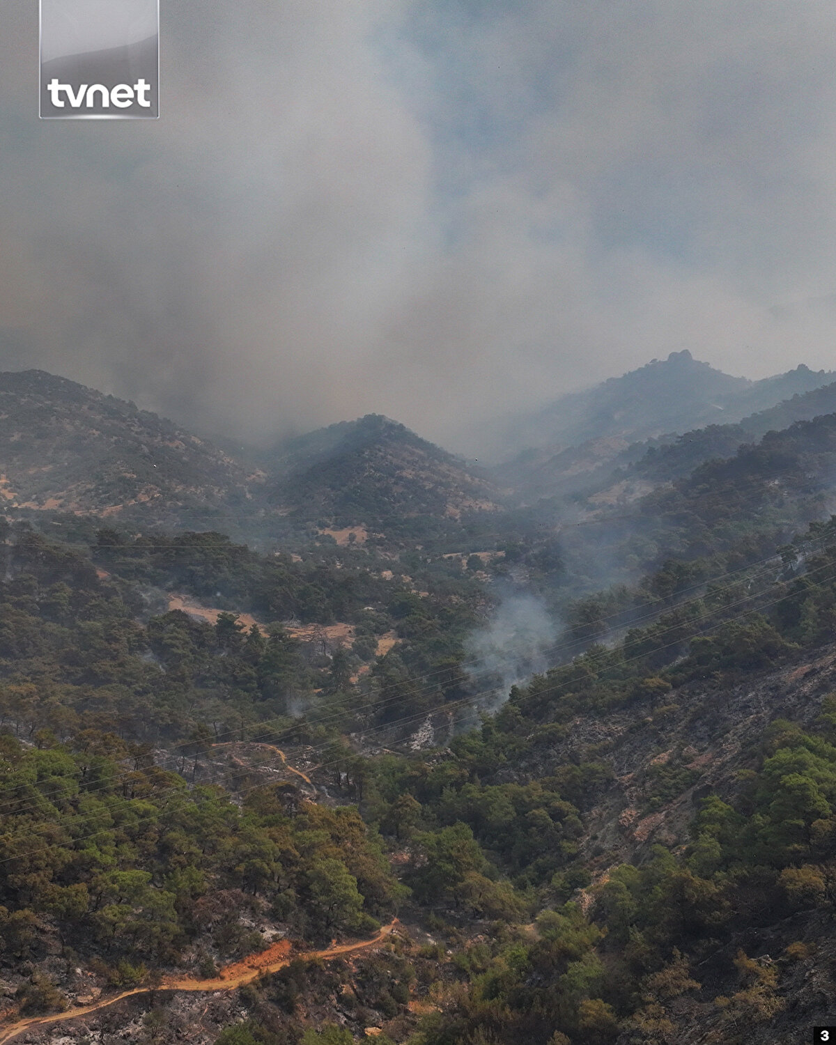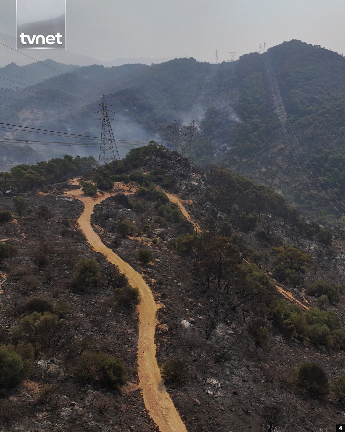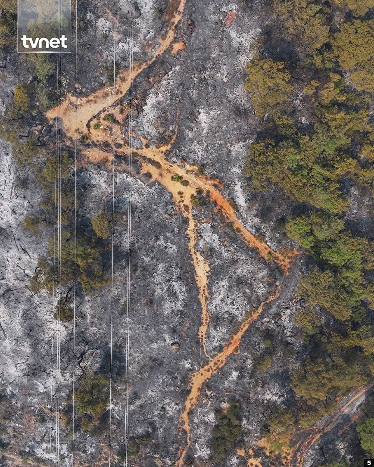 İzmir'in Karşıyaka ilçesindeki Yamanlar Karatepe bölgesinde orman yangınından etkilenen hasarlı alanların havadan görüntüsü alevlerin geniş bir alanı yok ettiği, yeşil örtünün büyük ölçüde zarar gördüğü ve çevrenin tahrip olduğunu gözler önüne seriyor.