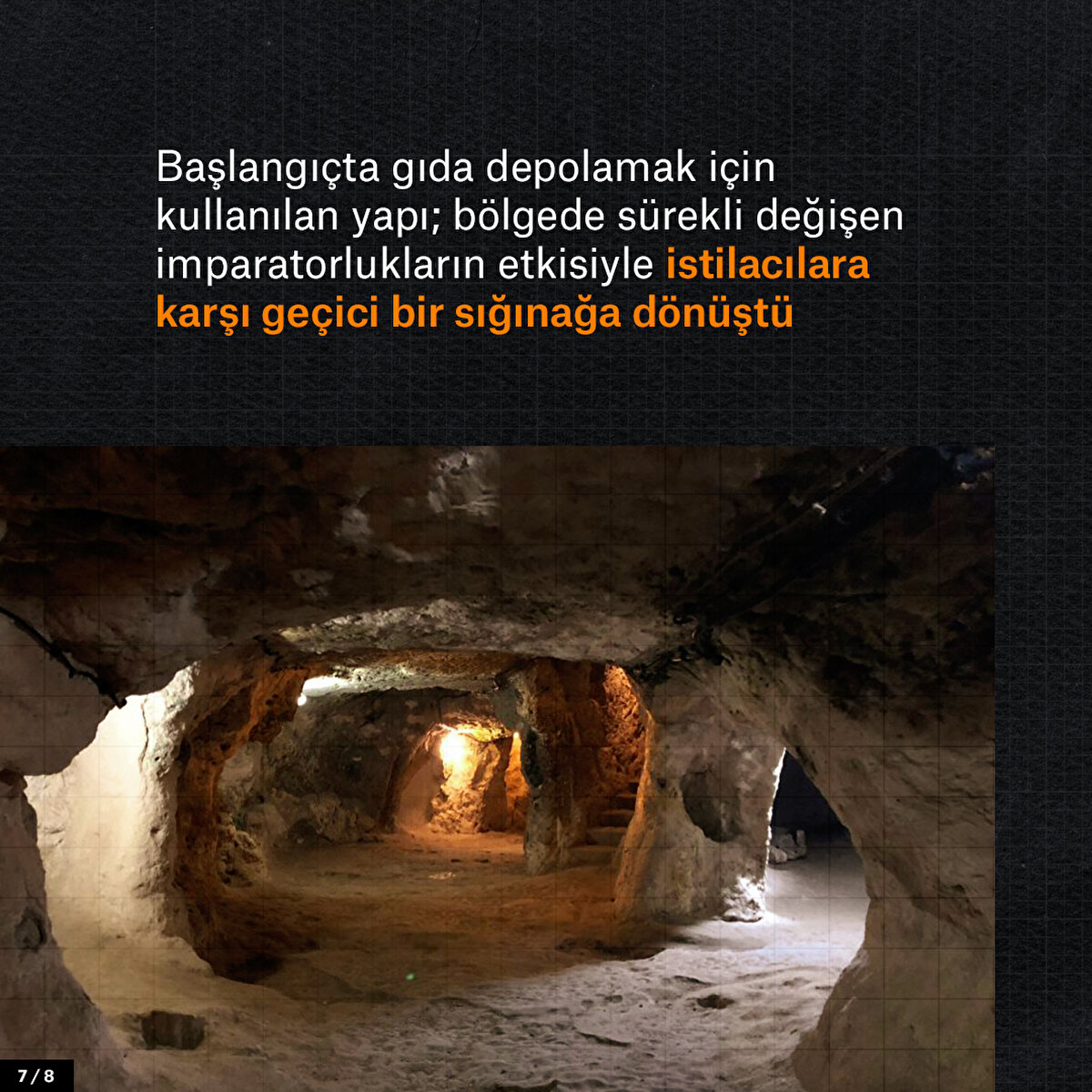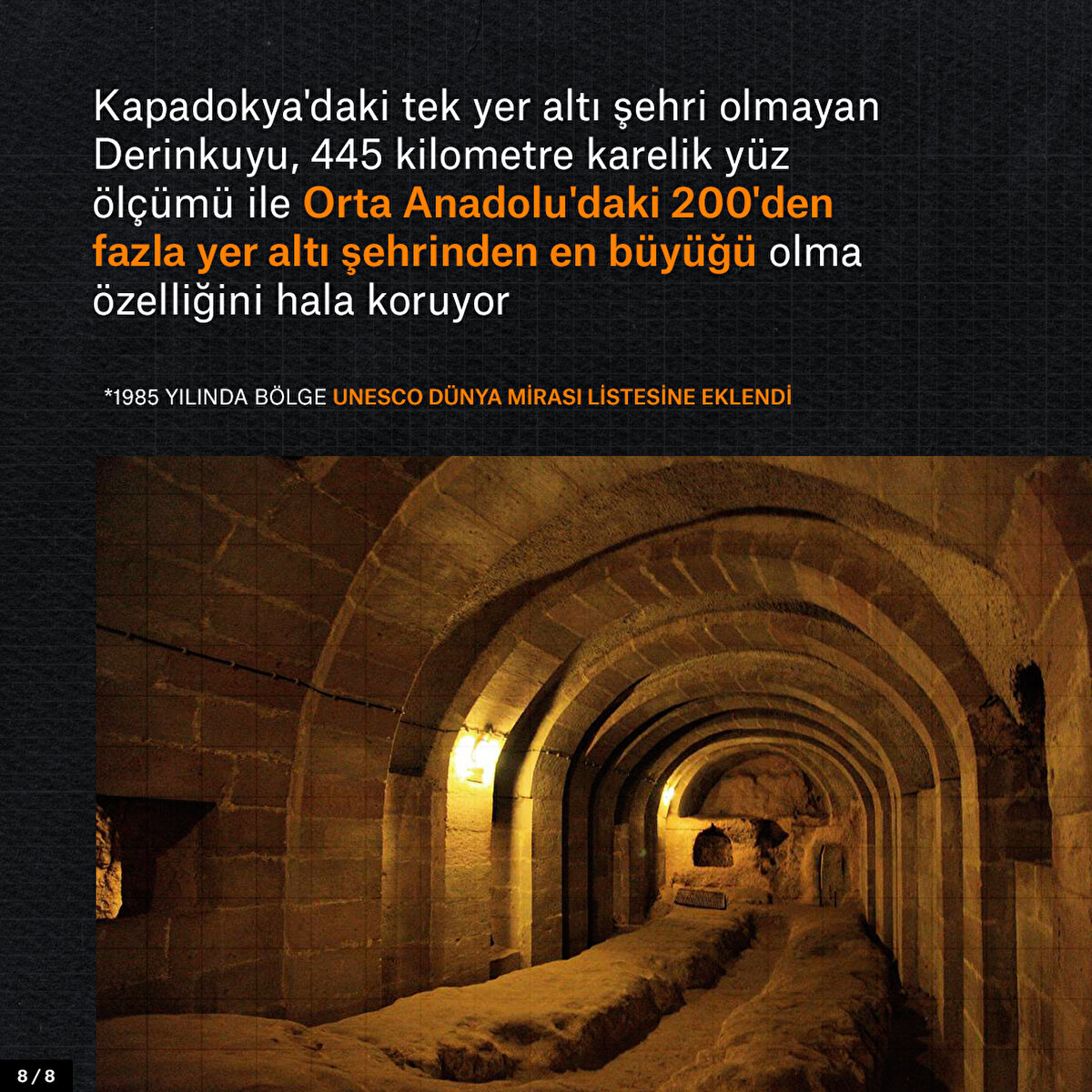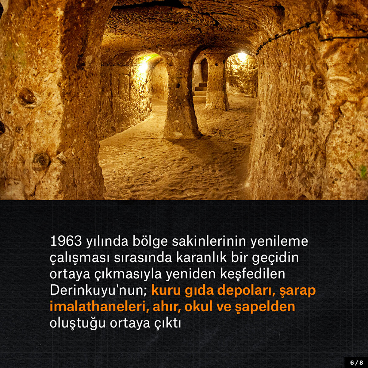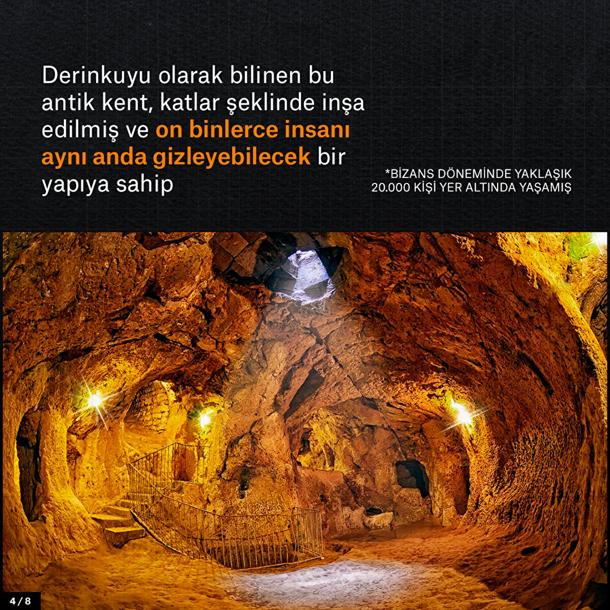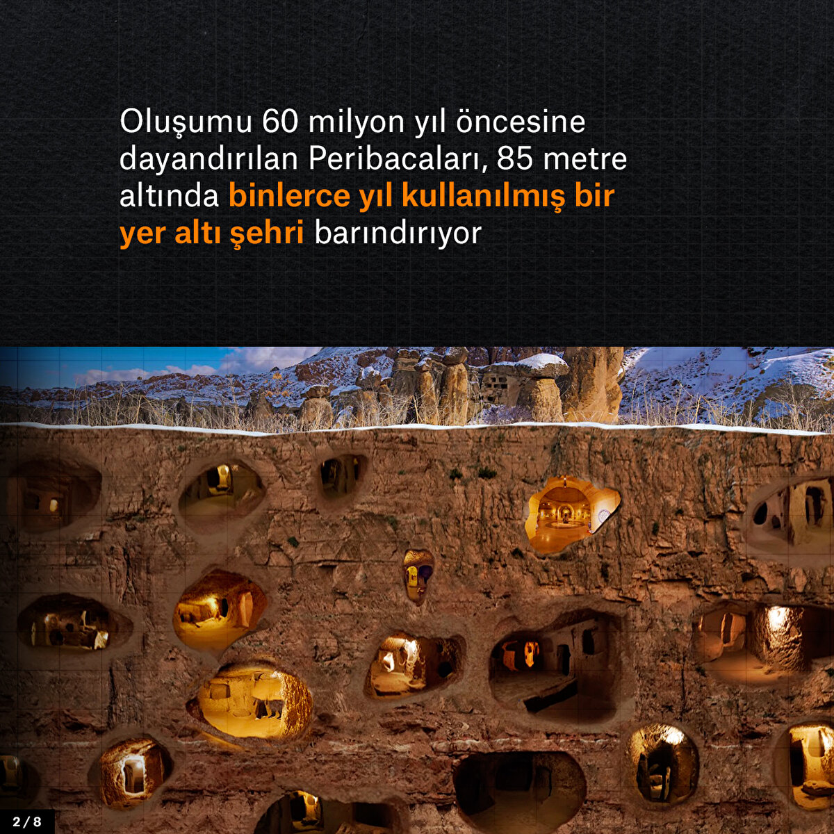 Peribacaları, 85 metre altında binlerce yıl kullanılmış bir yer altı şehri barındırıyor. Derinkuyu olarak bilinen bu antik kent Frigler, Persler ve Bizanslılar gibi pek çok medeniyete ev sahipliği de yaptı. Derinkuyu, Orta Anadolu'daki yer altı şehirlerinin en büyüğü olma özelliğini hala koruyor.