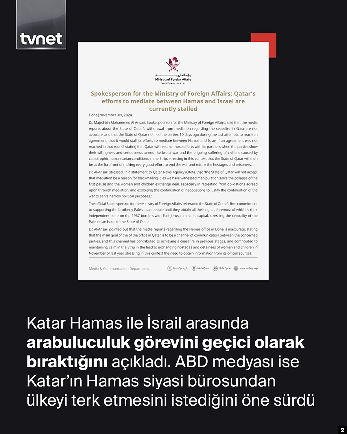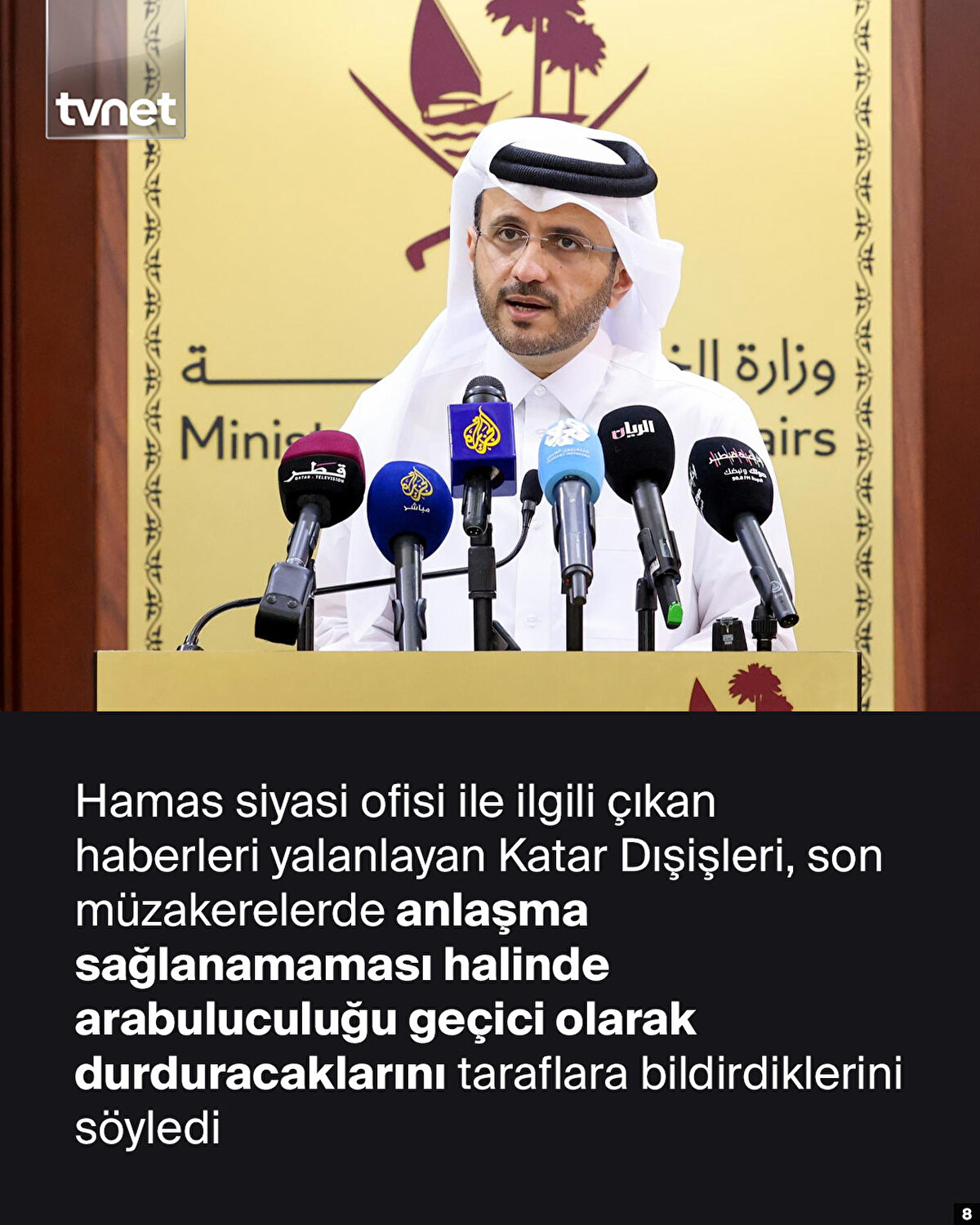 Katar, Hamas ile İsrail arasındaki arabuluculuk çabalarını, taraflar Gazze'deki savaşı sona erdirme konusunda "istek ve ciddiyetlerini" gösterene kadar askıya aldığını duyurdu .