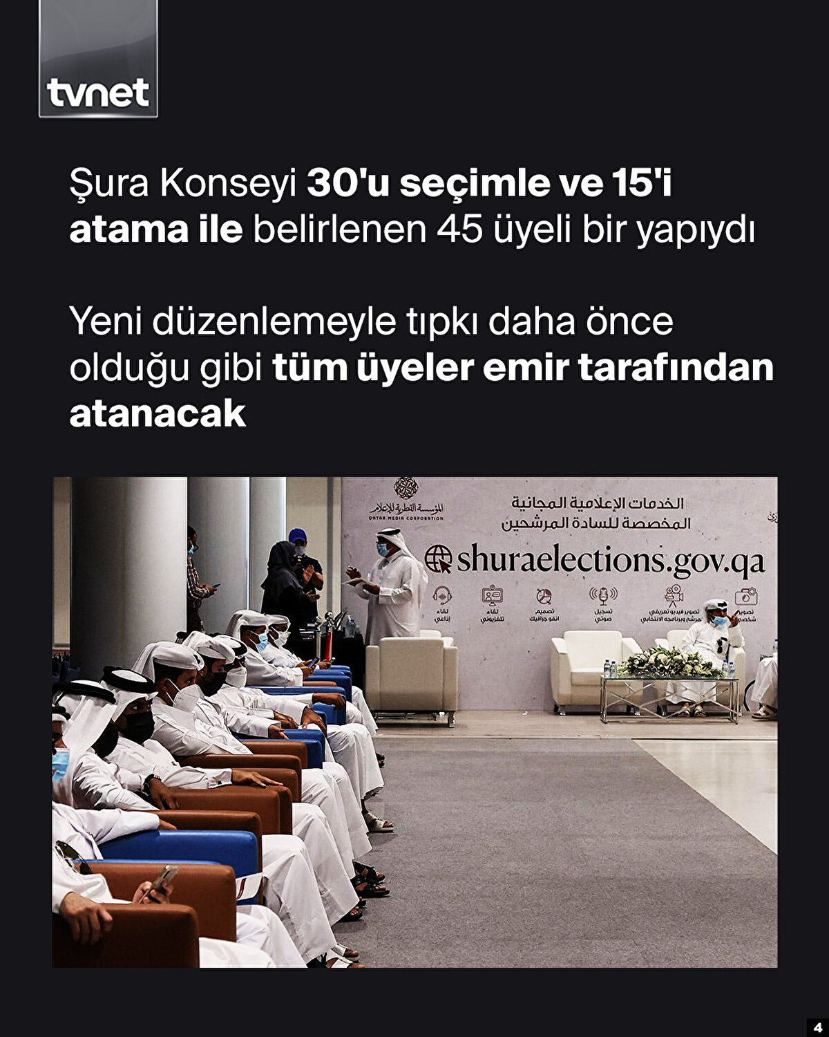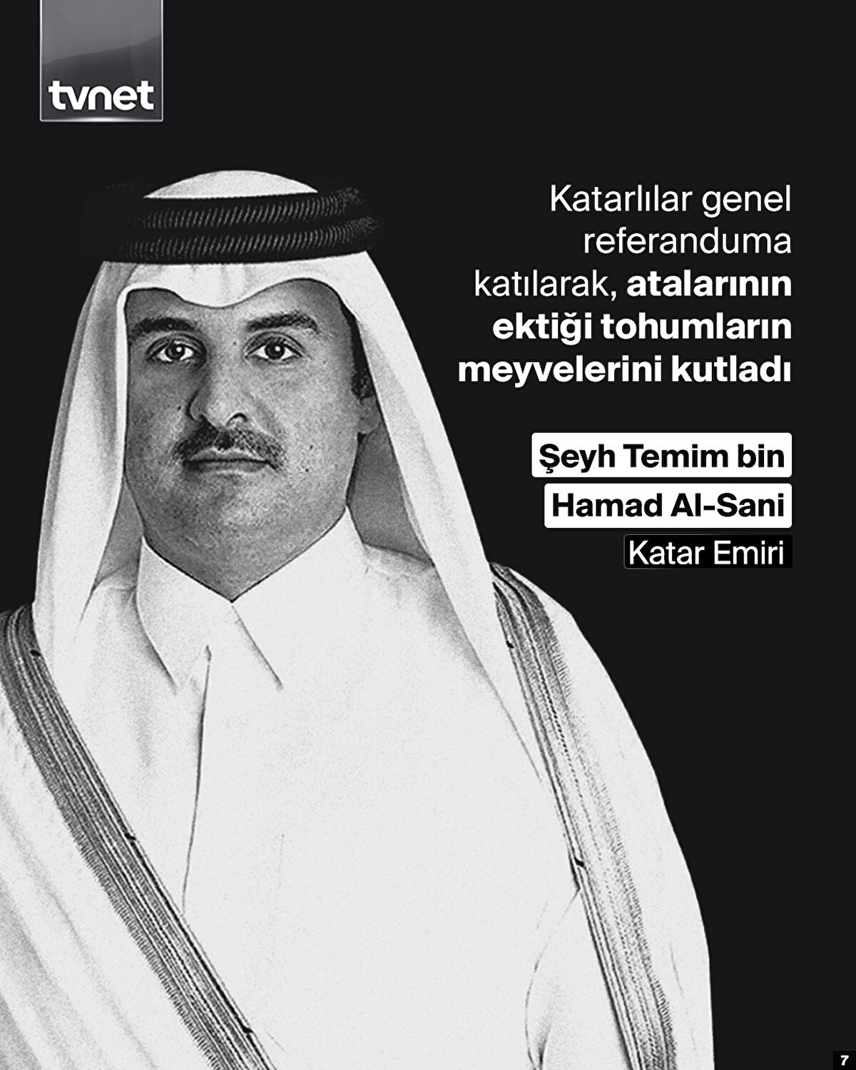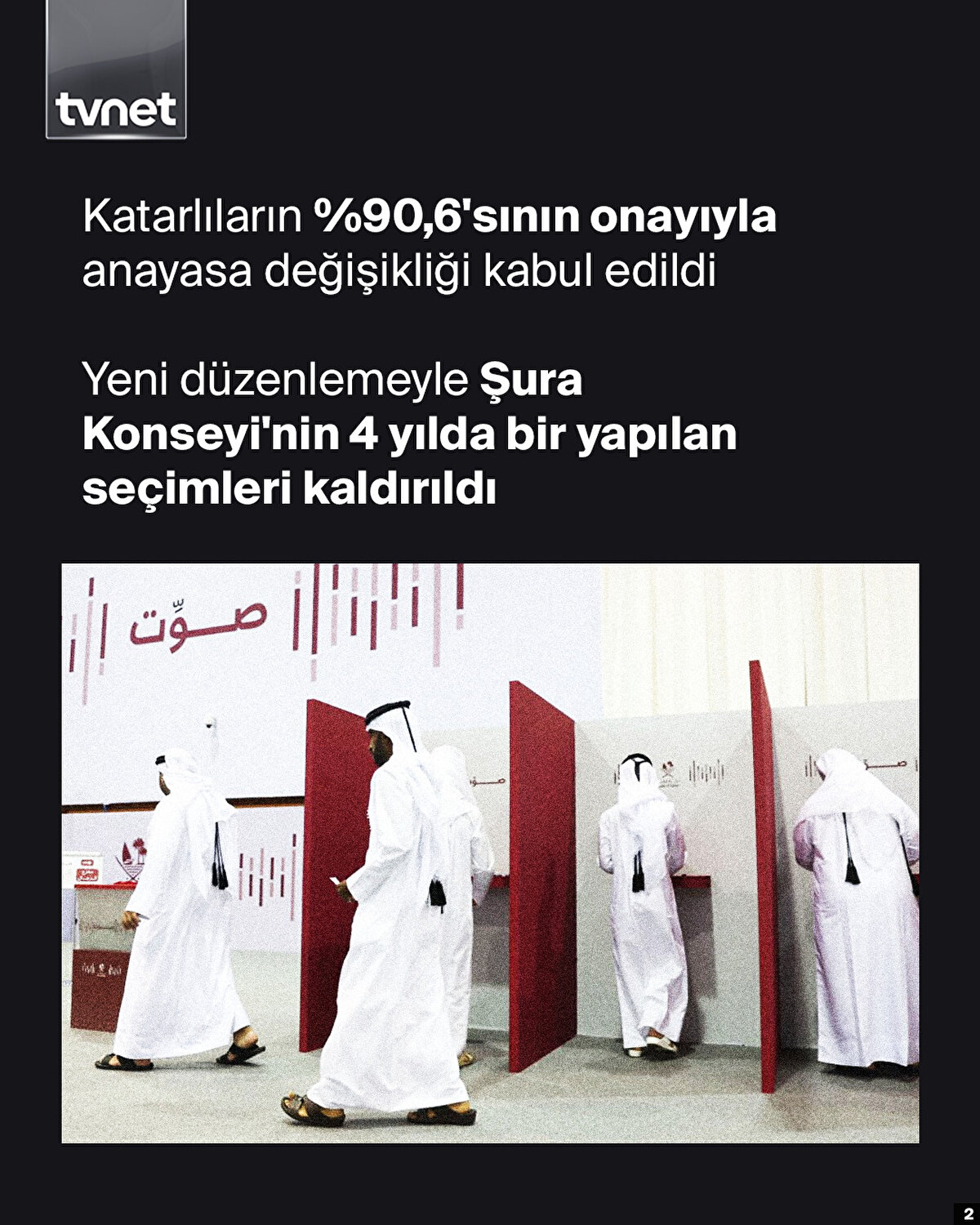 İçişleri Bakanı ve Genel Referandum Komitesi Başkanı Halife bin Hamed Al Sani, Katar Televizyonu'nda canlı yayınında referandum sonuçlarını açıkladı. Katarlıların % 84 katılımı ile geçerli oyların %90,6'sının anayasa değişikliklerini onayladığını duyurdu. Yeni düzenlemede Şura Meclisi üyelerinin tamamı emir tarafından atanacak. Katar Emiri Şeyh Temim bin Hamed Al Sani yaptığı açıklamada, "Bugün referanduma katılarak anayasa değişikliklerine 'evet' oyu veren Katarlılar, geçmişten gelen birlik, dayanışma ve vatan sevgisinin meyvelerini kutladılar." ifadelerini kullandı.