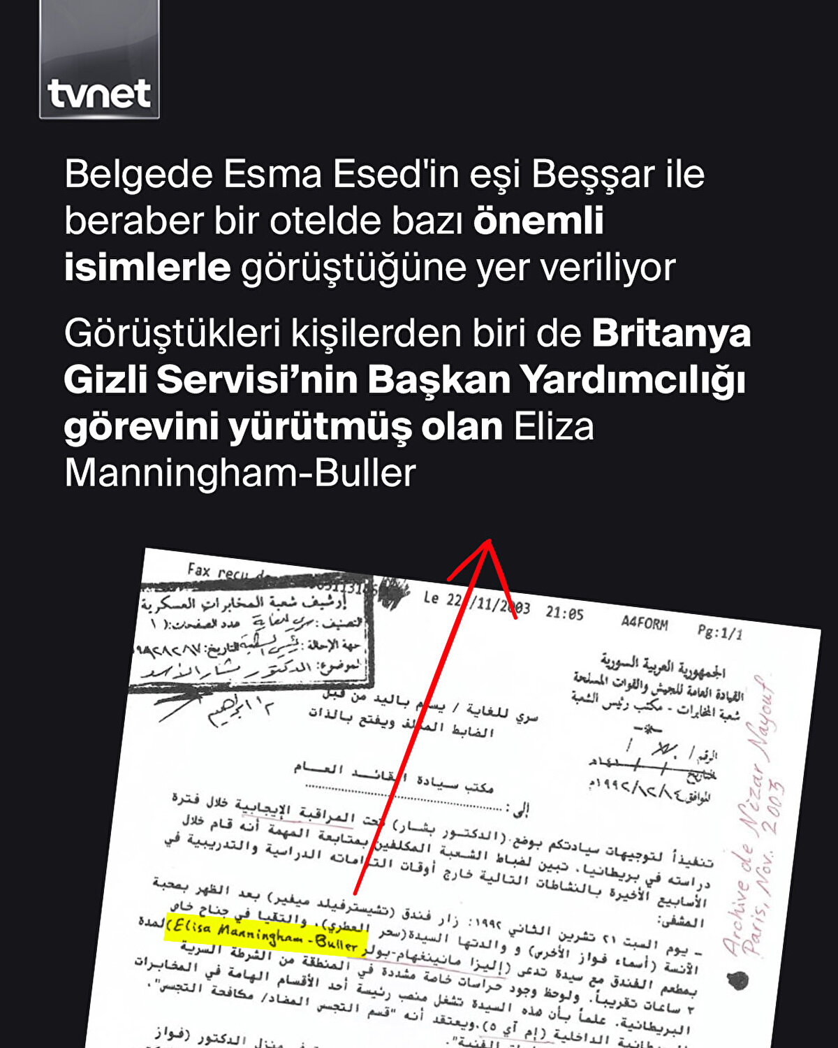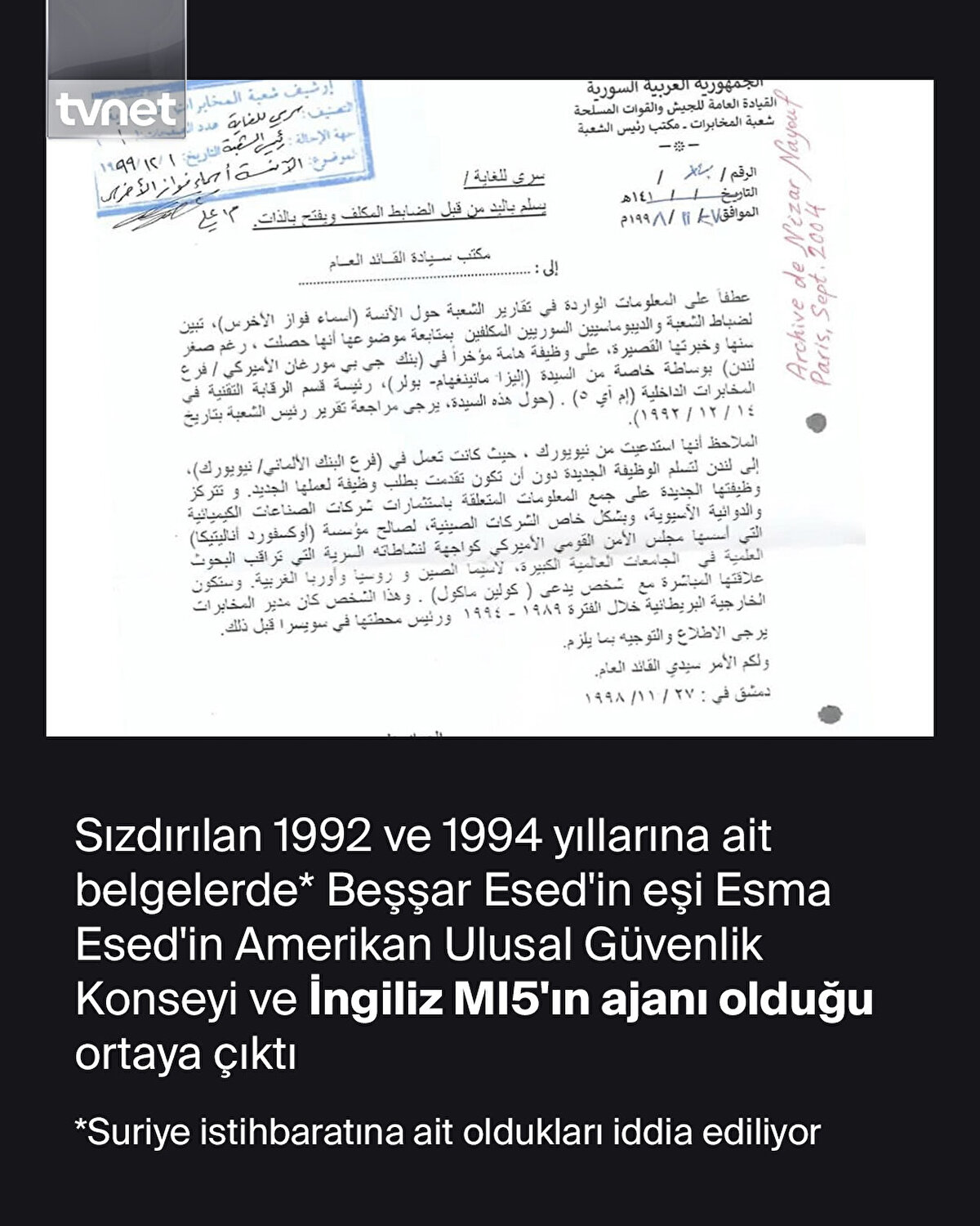 Sızdırılan 1992 ve 1994 yıllarına ait Suriye istihbaratı belgelerinde Beşşar Esed'in eşi Esma Esed'in Amerikan Ulusal Güvenlik Konseyi ve İngiliz MI5'ın ajanı olduğu ortaya çıktı.