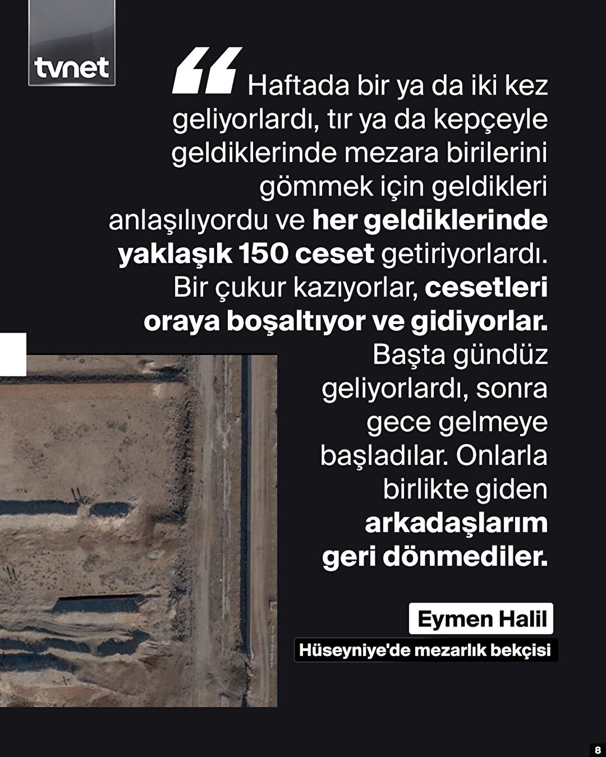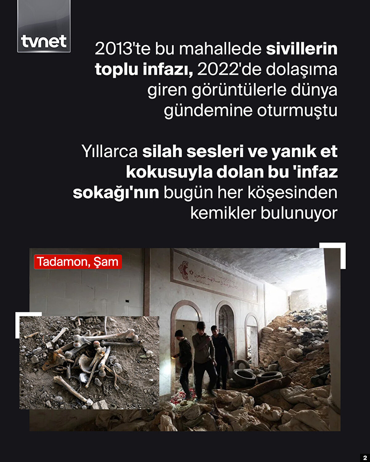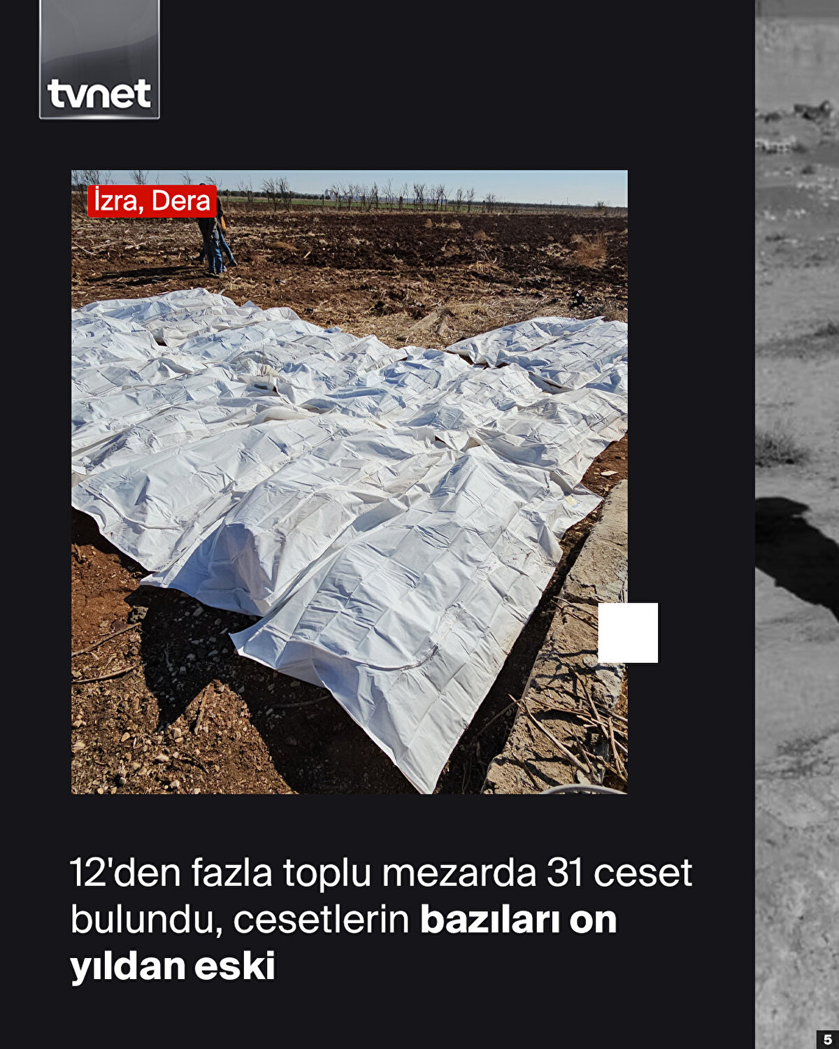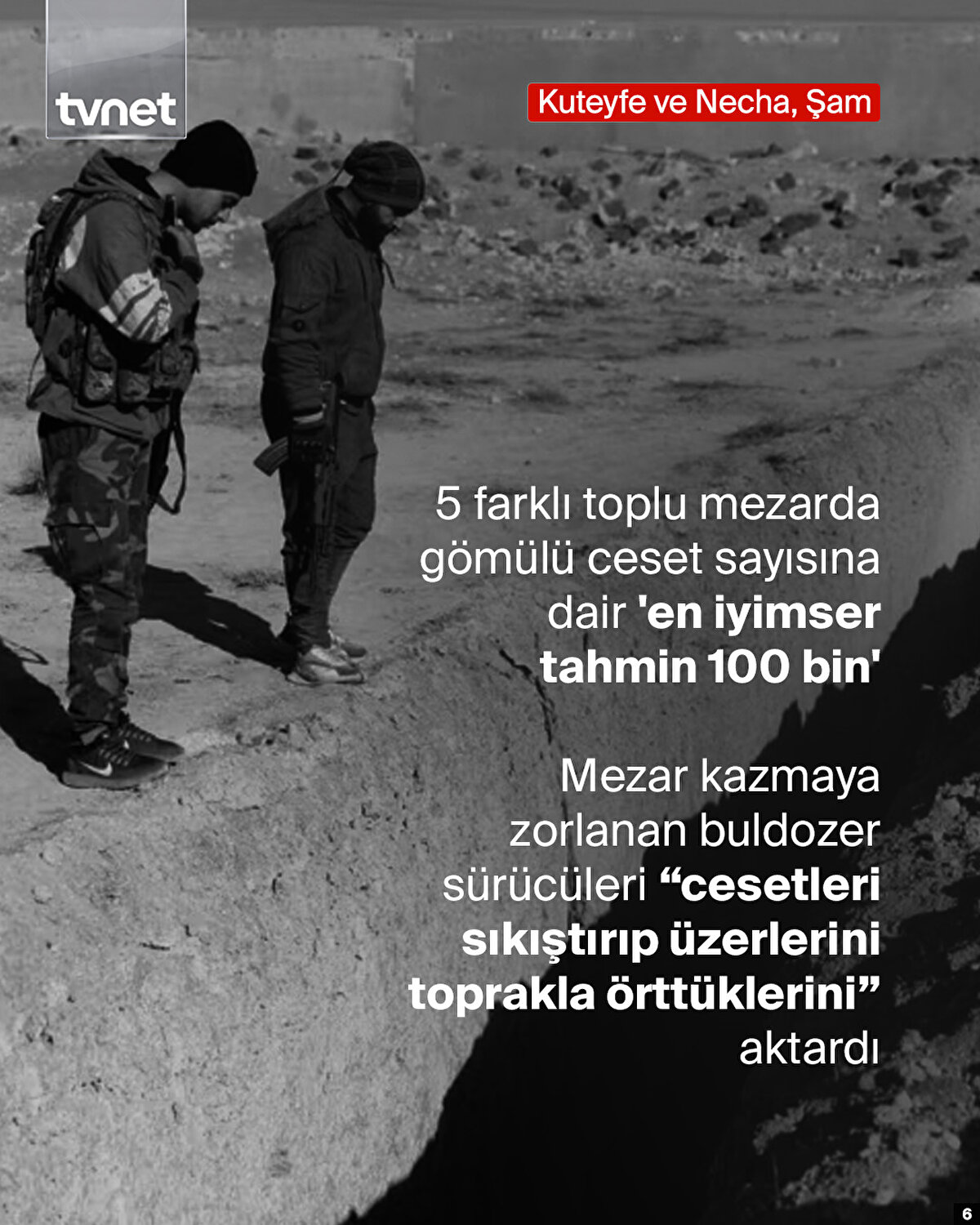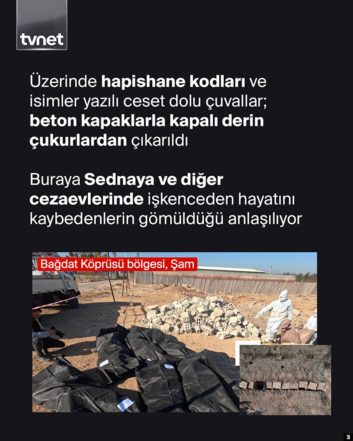 Baas Partisinin 61 yıllık iktidarı sona ererken diktatör Esed de başkentten kaçmıştı. Katil Hafız Esed ve Beşşar Esed'in diktatörlüklerinin kalıntıları ise bugün tek tek gün yüzüne çıkıyor. Ülke genelinde arama tarama faaliyetleri kapsamında toplu mezarlar ortaya çıkarılıyor.