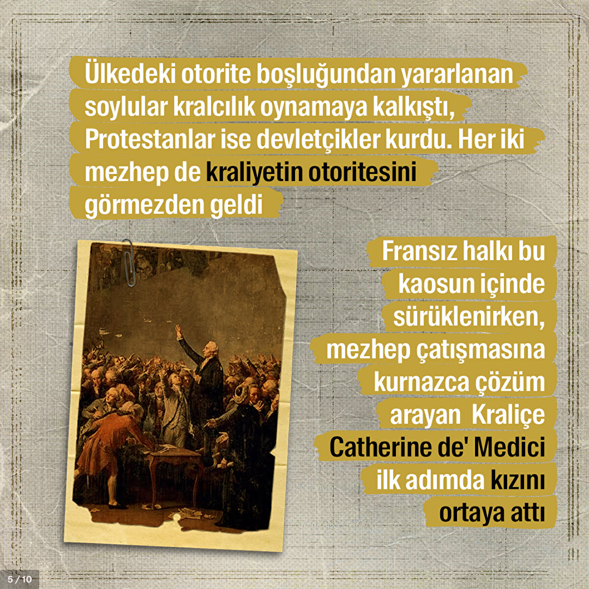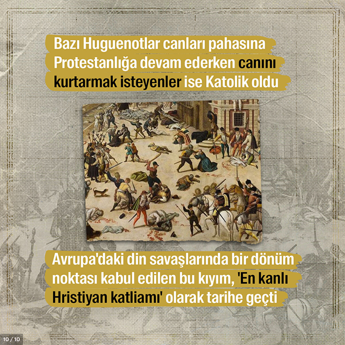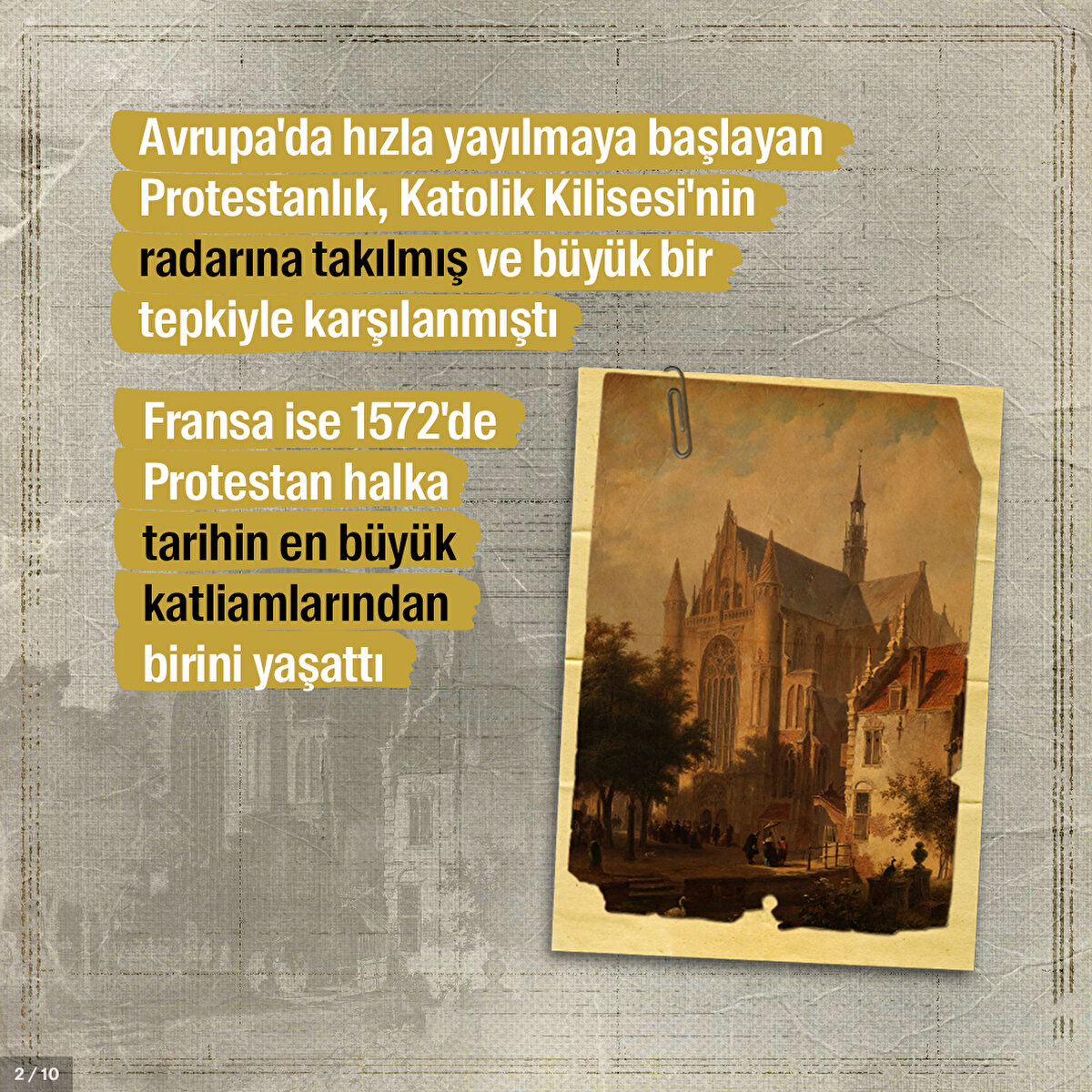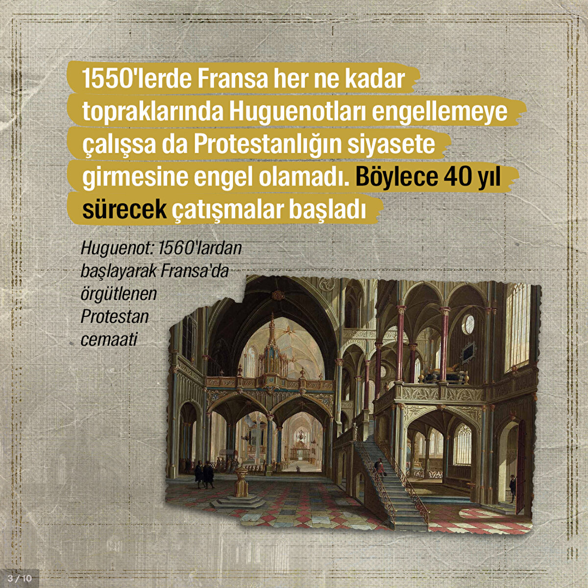 1520'li yıllarda Almanya'da Protestanlığın temelini oluşturan reformlar Fransa'da hızla karşılık bulmuştu. Ancak Protestanlar, Katolikler tarafından büyük bir tepkiyle karşılandı ve ülkedeki egemenlik mücadelesi yerini din savaşlarına bıraktı. Katolik ve Hristiyanlar arasındaki gerginlik 1572 yılında 30 bin Protestan'ın katledilmesini beraberinde getirdi. Öyle ki hayatta kalmayı başaran bazı Protestanlar canlarını kurtarmak için Katolikliği kabul etmek zorunda kaldı. Bir günde gerçekleşen bu vahşet Avrupa tarihinin 'en kanlı Hristiyan katliamı' olarak tarihe geçti.