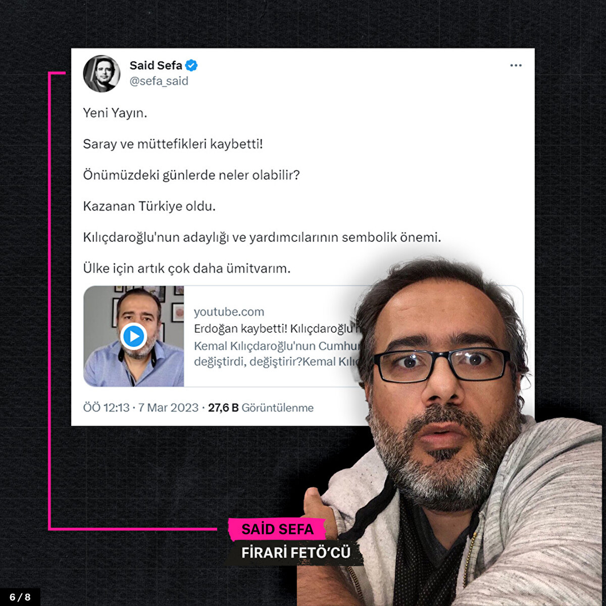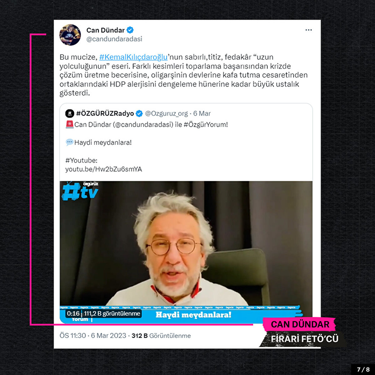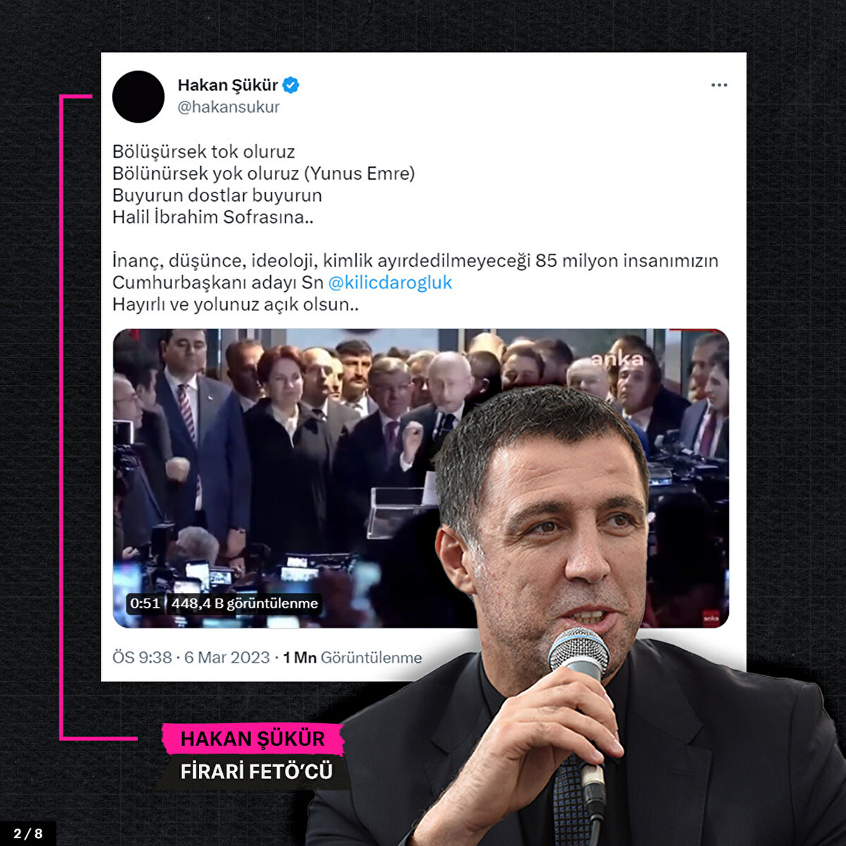 CHP Genel Başkanı Kemal Kılıçdaroğlu'nun adaylığını ilan etmesinin ardından firari FETÖ'cülerden açıklamalar geldi. Hakan Şükür, “85 milyon insanımızın cumhurbaşkanı adayı Sayın Kılıçdaroğlu hayırlı ve yolunuz açık olsun" ifadesinde bulundu.