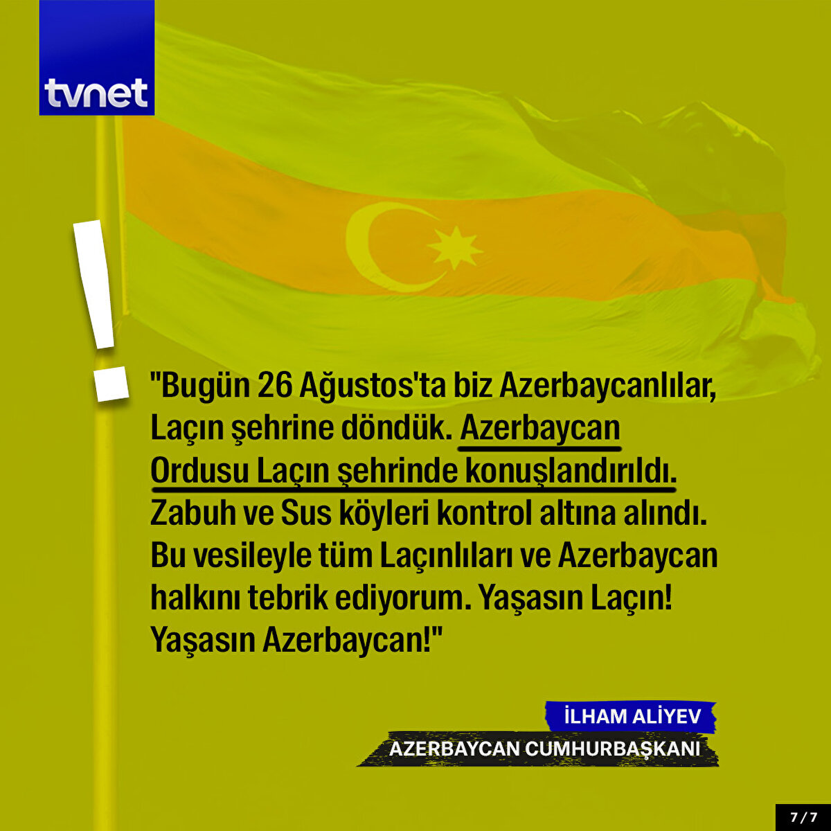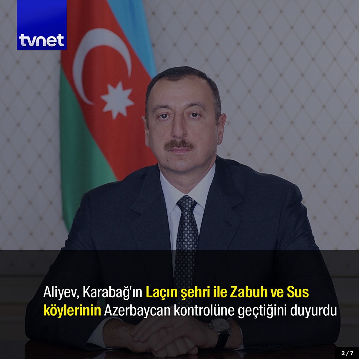 Azerbaycan Cumhurbaşkanı İlham Aliyev, Karabağ'ın Laçın şehri ile Zabuh ve Sus köylerinin Azerbaycan kontrolüne geçtiğini duyurdu.