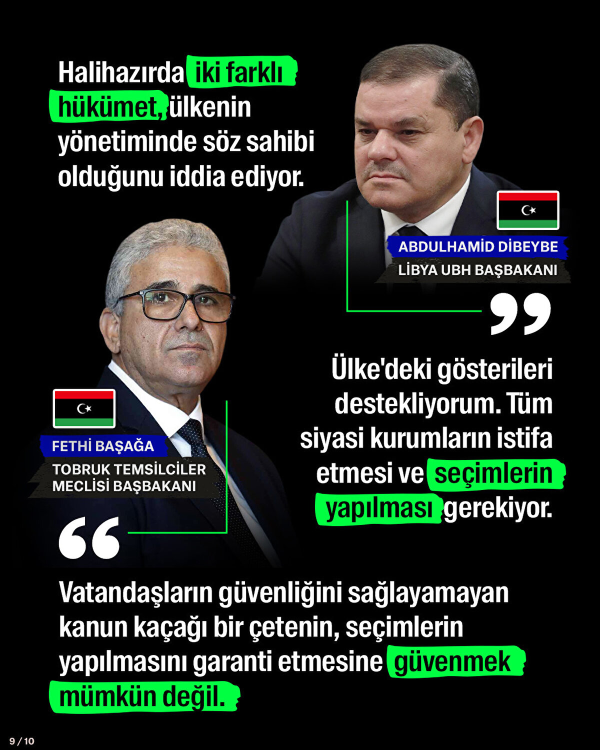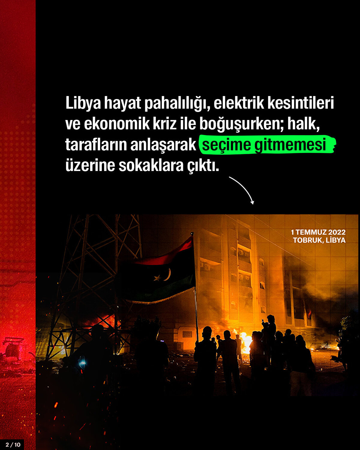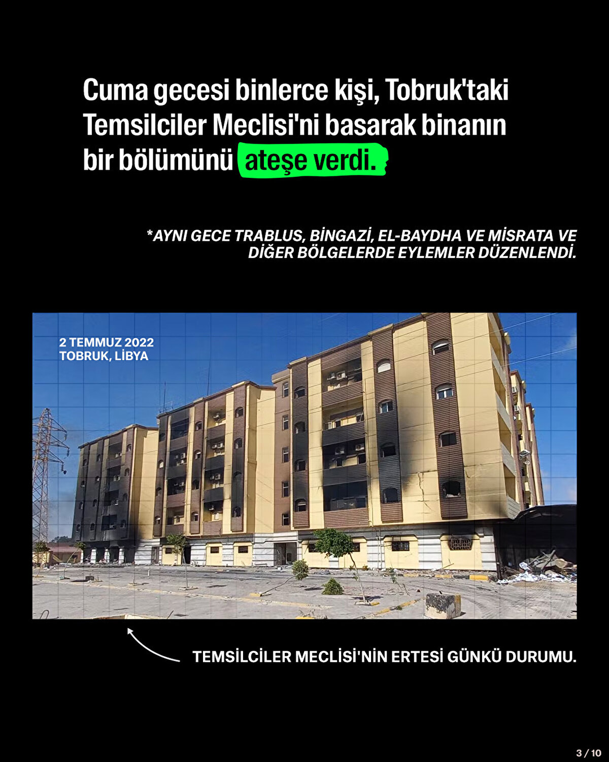 Libya hayat pahalılığı, elektrik kesintileri ve ekonomik kriz ile boğuşurken; halk, tarafların anlaşarak seçime gitmemesi üzerine sokaklara çıktı. Cuma gecesi binlerce kişi, Tobruk'taki Temsilciler Meclisi'ni basarak binanın bir bölümünü ateşe verdi. Protestocular, seçimlere kadar durmayacaklarını açıkladı.
