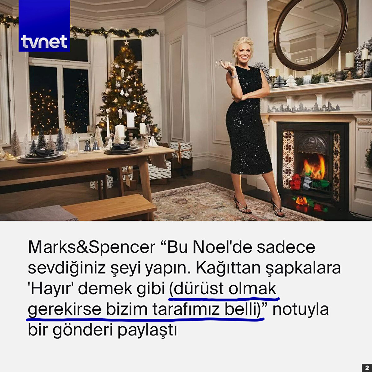 İngiltere merkezli giyim merkezi Marks&Spencer, bu yılki Noel reklamında Filistin bayrağının renklerinde yanan kağıt şapkalara yer verdi. Paylaşımda “Dürüst olmak gerekirse bizim tarafımız belli” notunun yer alması da dikkat çekti. Marka, gelen tepkiler üzerine özür dileyerek gönderiyi sildi; “Niyetimiz, bazı insanların Noel sezonunda kağıttan Noel şapkaları takmaktan hoşlanmadığını göstermekti” açıklamasını yaptı.