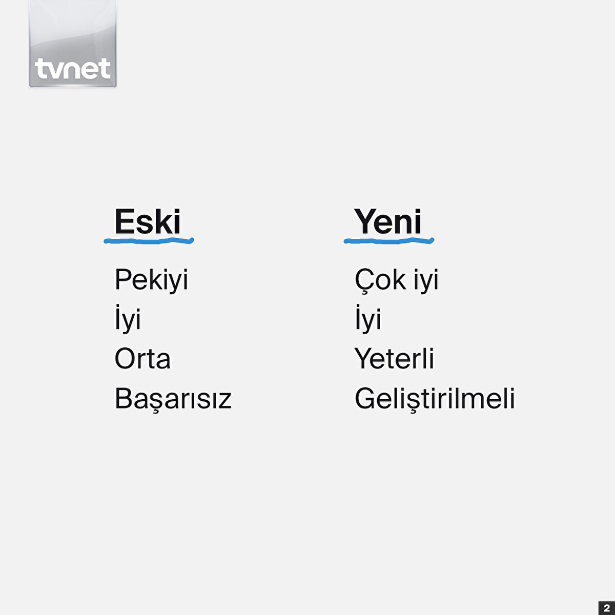 Yeni değerlendirme terimlerini içeren 44 maddelik yönetmelik değişikliği, Resmi Gazete aracılığıyla kamuoyuna duyurdu. Buna göre, ilkokul düzeyindeki öğrencilerin karnelerinde pekiyi, iyi, orta, geçer, ve başarısız yerine çok iyi, iyi, yeterli, ve geliştirilmeli ifadeleri kullanılacak.