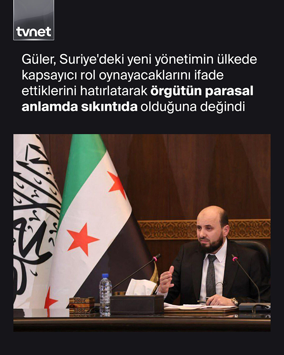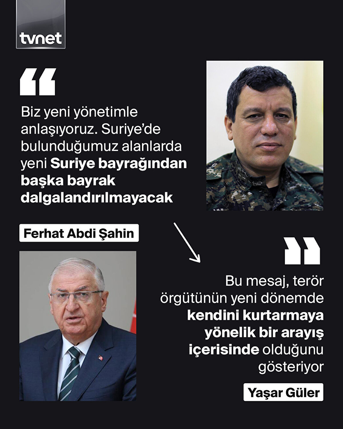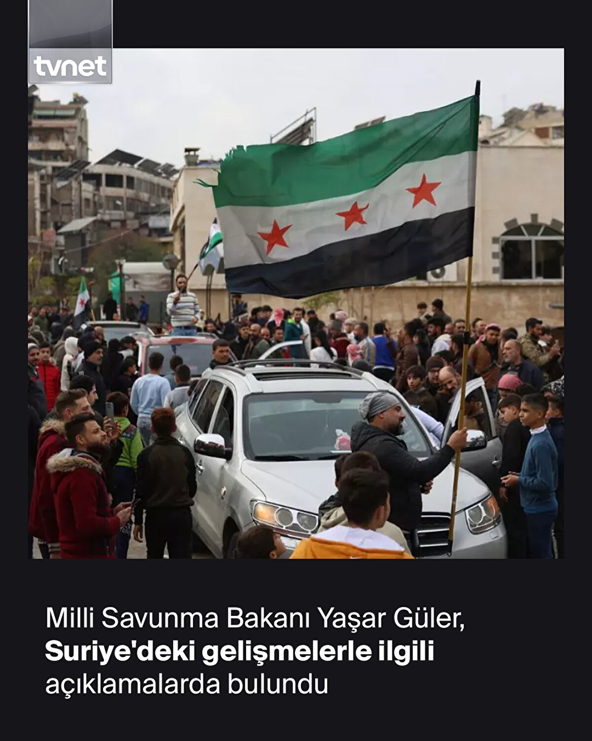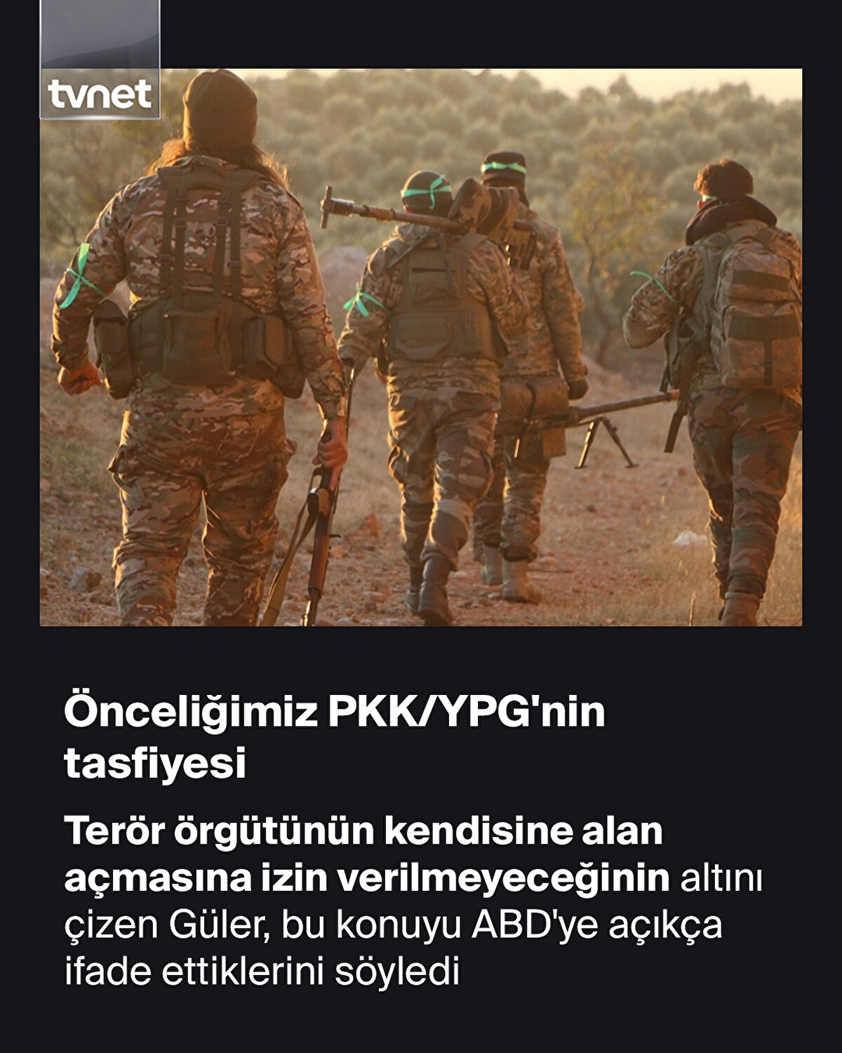 Milli Savunma Bakanı Yaşar Güler, Suriye'deki gelişmelerle ilgili açıklamalarda bulundu. Güler, "PKK/YPG terör örgütünün artık tek başına hareket etmesine ve kendisine alan açmasına ne Suriye halkının, ne yeni yönetimin ne de bizim müsaade etmemiz söz konusu değildir. Öncelikli konumuz PKK/YPG terör örgütünün tasfiyesidir. Bunu ABD'li dostlarımıza da açık ve net şekilde ifade ettik. Onların da pozisyonlarını tekrar değerlendirmelerini bekliyoruz" ifadelerini kullandı.