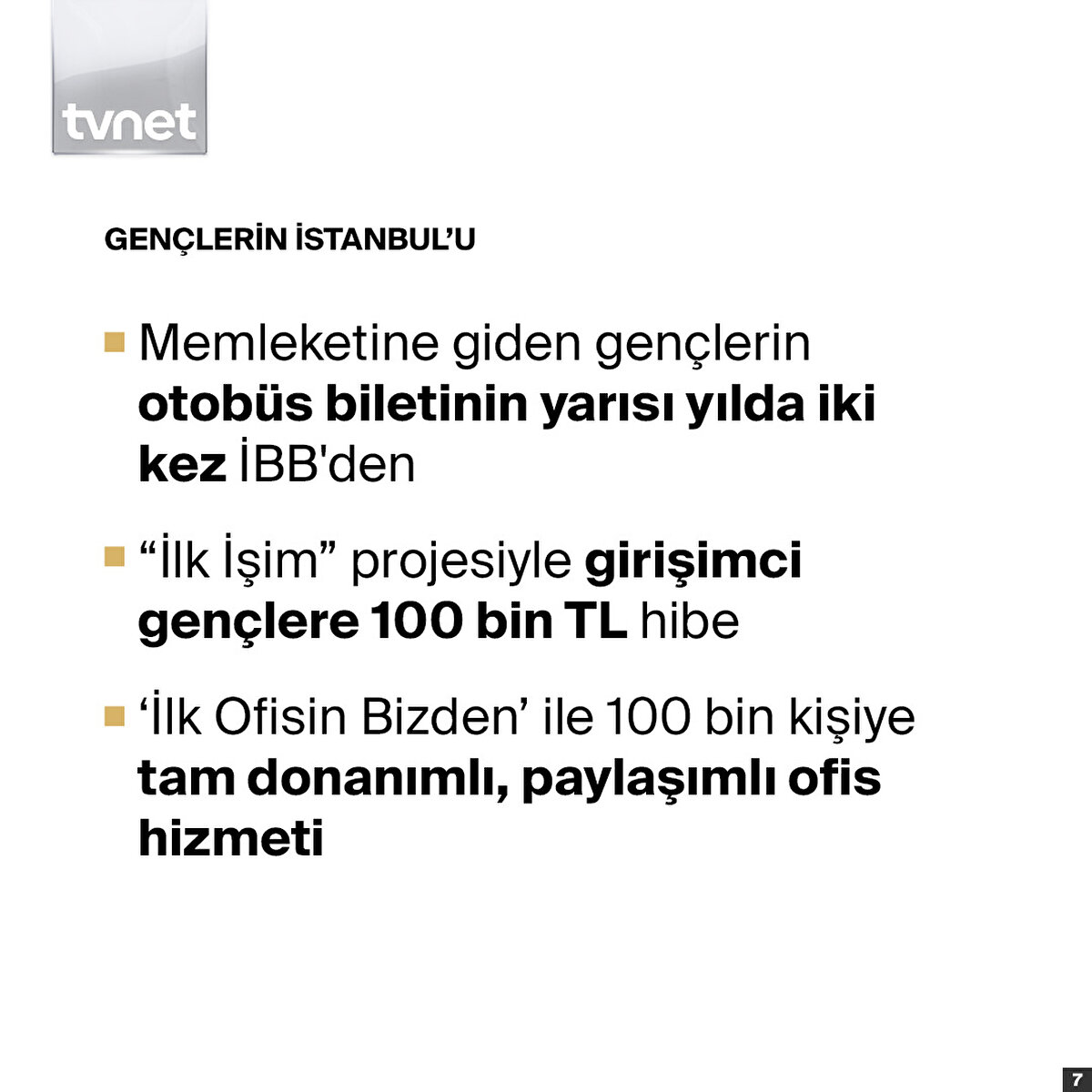 İBB Başkan Adayı Murat Kurum, düzenlenen "Türkiye Yüzyılı İstanbul Vizyonu" toplantısıyla projelerini açıkladı. Toplu ulaşım için, ortalama yolculuk süresi 64 dakikadan 39 dakikaya düşeceğini vaat eden Kurum, metrobüs hattının Silivri'ye kadar uzayacağını söyledi. Vaatler arasında raylı sistemin uzunluğunu ilk 5 yılda iki katına, 2034 yılında ise 1004 kilometreye çıkması da var. İstanbulluların otopark sorununu da projelerine ekleyen Kurum, 250 bin araçlık yeni otopark projesi vaadinde bulundu. Ayrıca İspark ücretlerine %25 indirim de yapılacak.