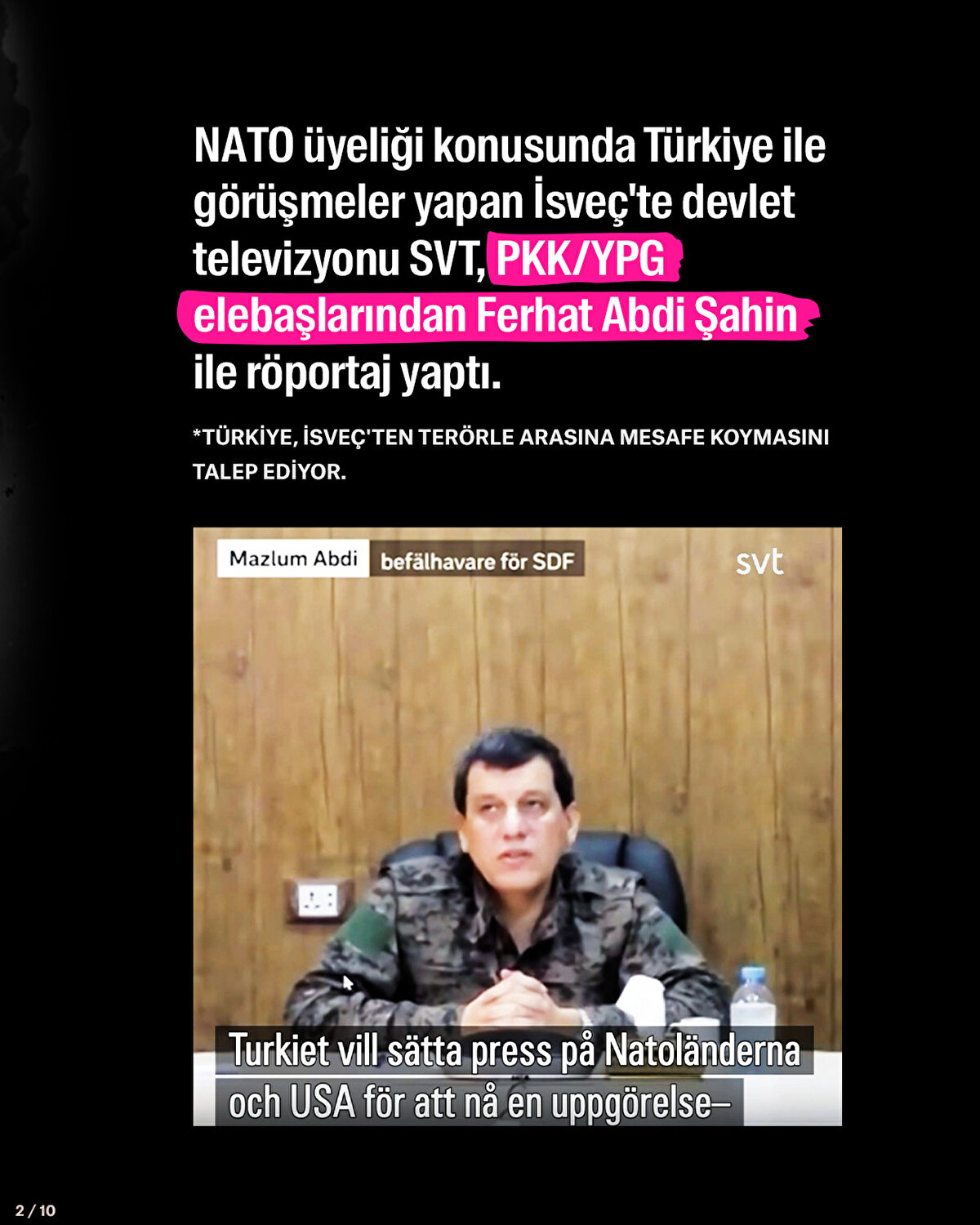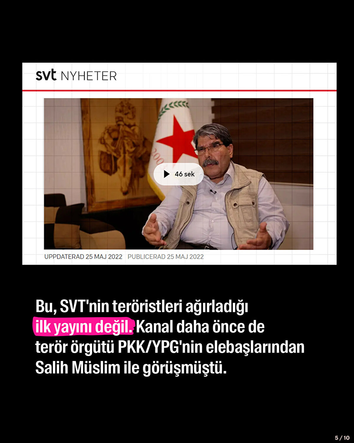 NATO üyeliği konusunda Türkiye ile görüşmeler yapan İsveç'te devlet televizyonu SVT, PKK/YPG elebaşlarından Ferhat Abdi Şahin ile röportaj yaptı. Bu, SVT'nin teröristleri ağırladığı ilk yayını değil. Kanal daha önce de terör örgütü PKK/YPG'nin elebaşlarından Salih Müslim ile görüşmüştü. İsveç ve Finlandiya'nın NATO üyelik başvurusu 28-30 Haziran'da Madrid'in ev sahipliğinde yapılacak NATO Zirvesi'nde görüşülecek.