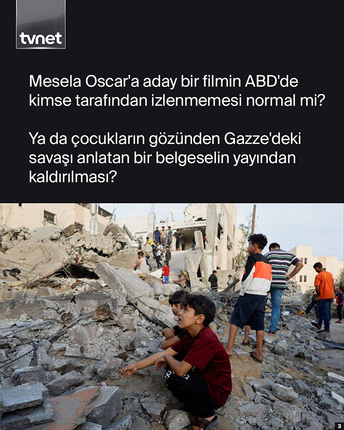 Soykırımda can veren Filistinlilerin direnişi, Batı'nın sektörel hegemonyası altında sistematik olarak görünmez kılınıyor. Mesela Oscar'a aday bir filmin ABD'de kimse tarafından izlenmemesi normal mi? Ya da çocukların gözünden Gazze'deki savaşı anlatan bir belgeselin yayından kaldırılması?