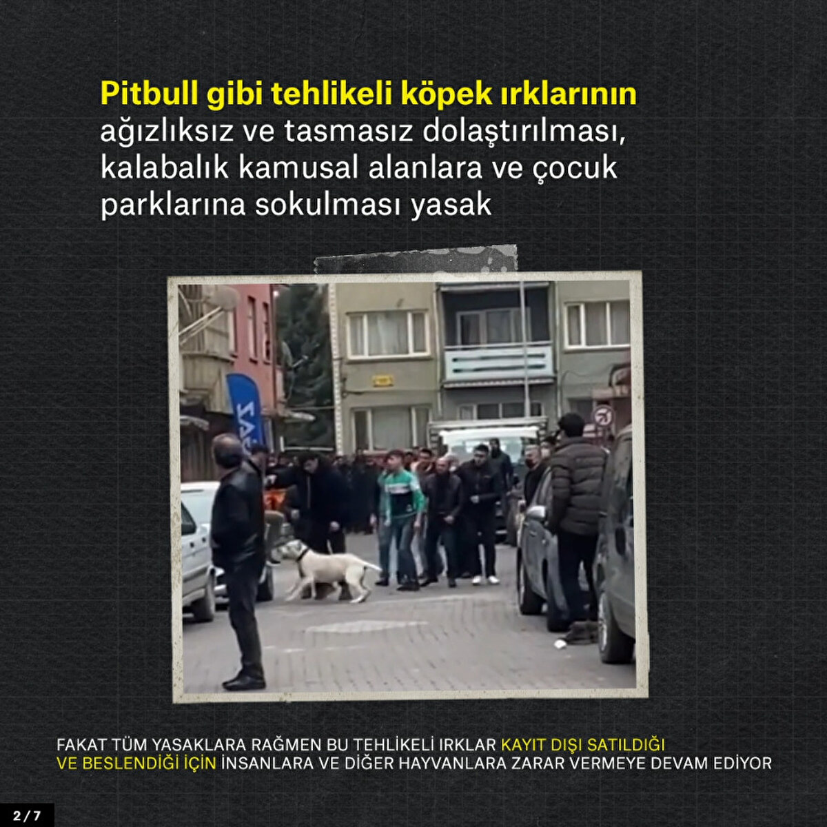 Pitbull gibi tehlikeli köpek ırklarının ağızlıksız ve tasmasız dolaştırılması, kalabalık kamusal alanlara ve çocuk parklarına sokulması yasak. Fakat tüm yasaklara rağmen bu tehlikeli ırklar kayıt dışı satıldığı ve beslendiği için insanlara ve diğer hayvanlara zarar vermeye devam ediyor.
