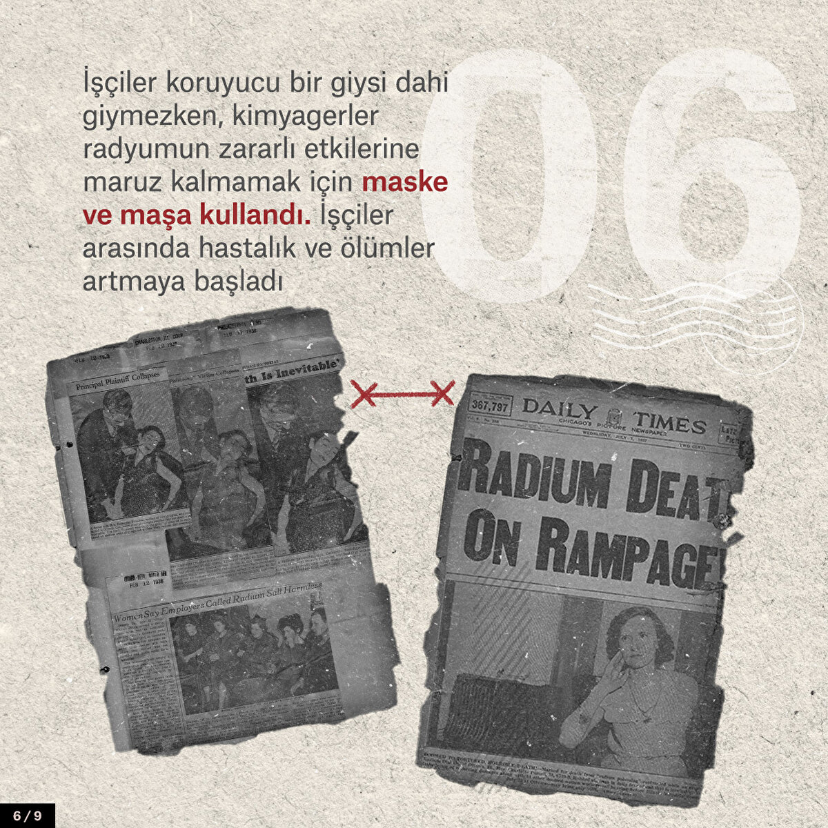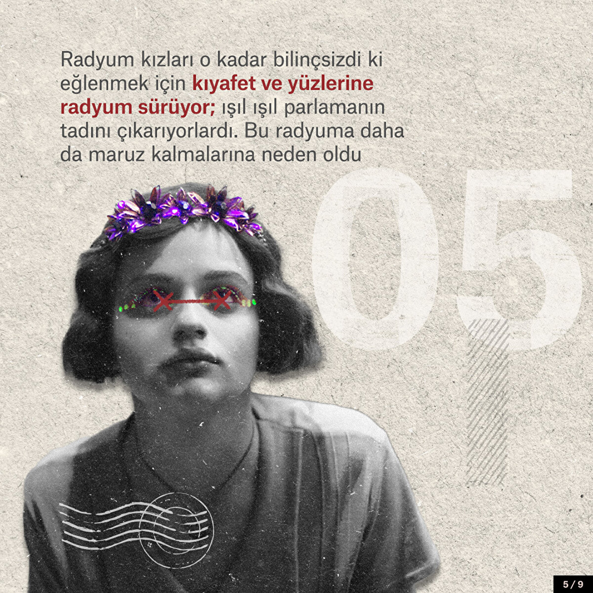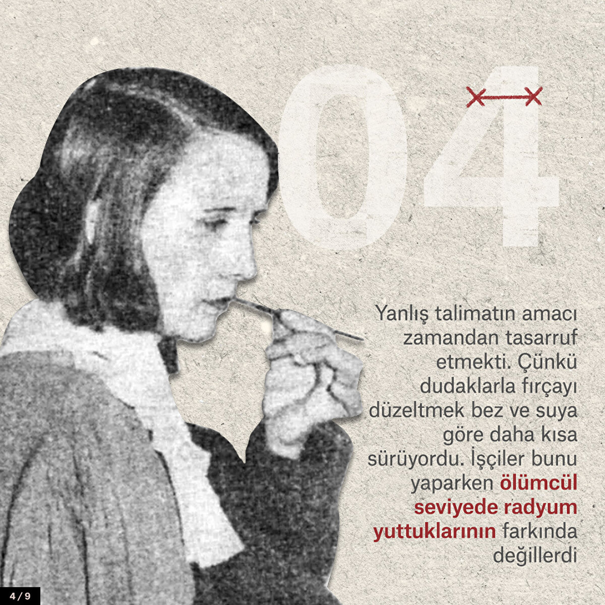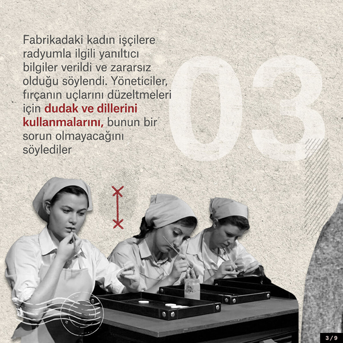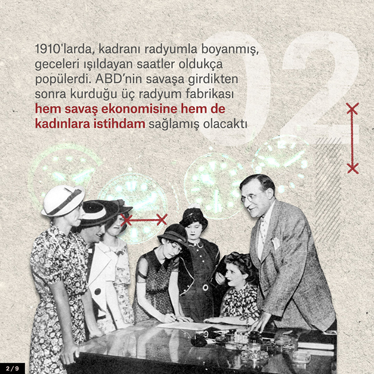 1910'larda, kadranı radyumla boyanmış, geceleri ışıldayan saatler oldukça popülerdi. Fabrikadaki kadın işçilere radyumla ilgili yanıltıcı bilgiler verildi ve zararsız olduğu söylendi. Radyum kızları o kadar bilinçsizdi ki eğlenmek için kıyafet ve yüzlerine radyum sürüyor; ışıl ışıl parlamanın tadını çıkarıyorlardı. Bu radyuma daha da maruz kalmalarına neden oldu