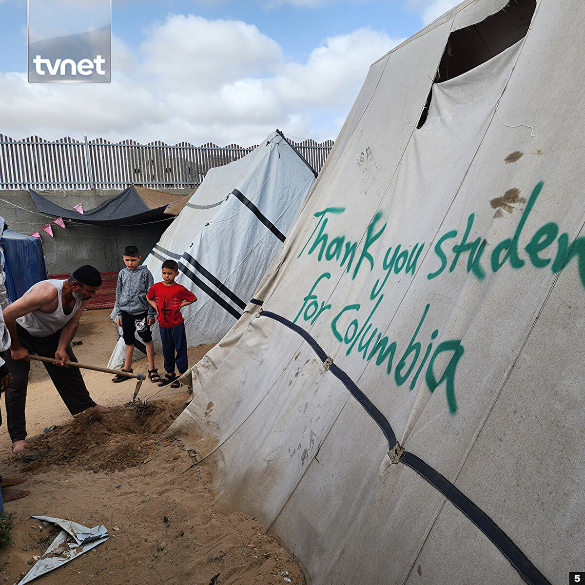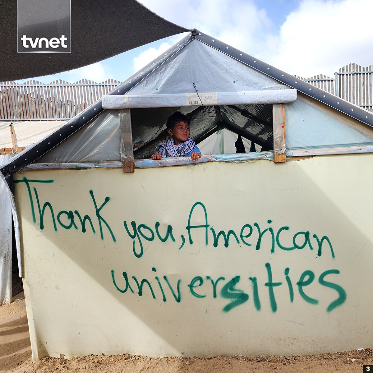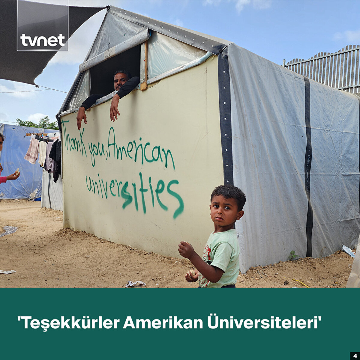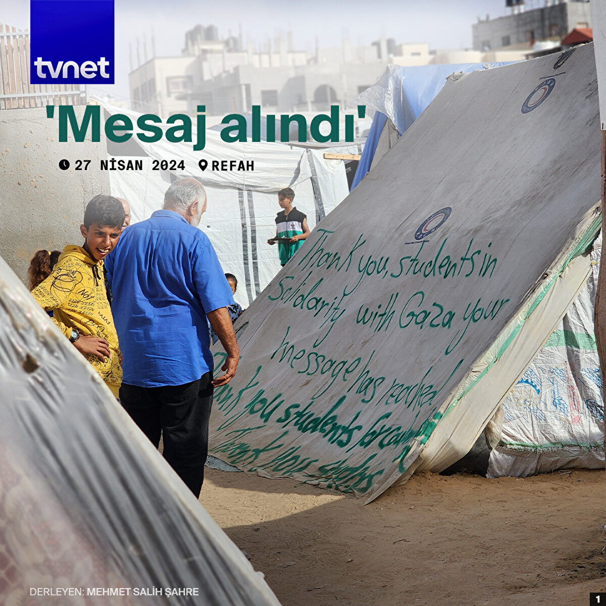 Refah'a sığınan 43 yaşındaki Ebu Yusuf Hamed, ABD'de Columbia Üniversitesinde başlayan ve dünya genelinde birçok üniversiteye yayılan Gazze'ye destek gösterilerine sessiz kalmadı.Hamed, Refah'taki çadırların üzerine sprey boyayla İngilizce “Gazze ile dayanışma içinde olan öğrencilere teşekkür ediyoruz. Mesaj ulaştı”, “Teşekkürler ABD üniversiteleri” ve “Teşekkürler Columbia öğrencileri” ibarelerini yazdı.