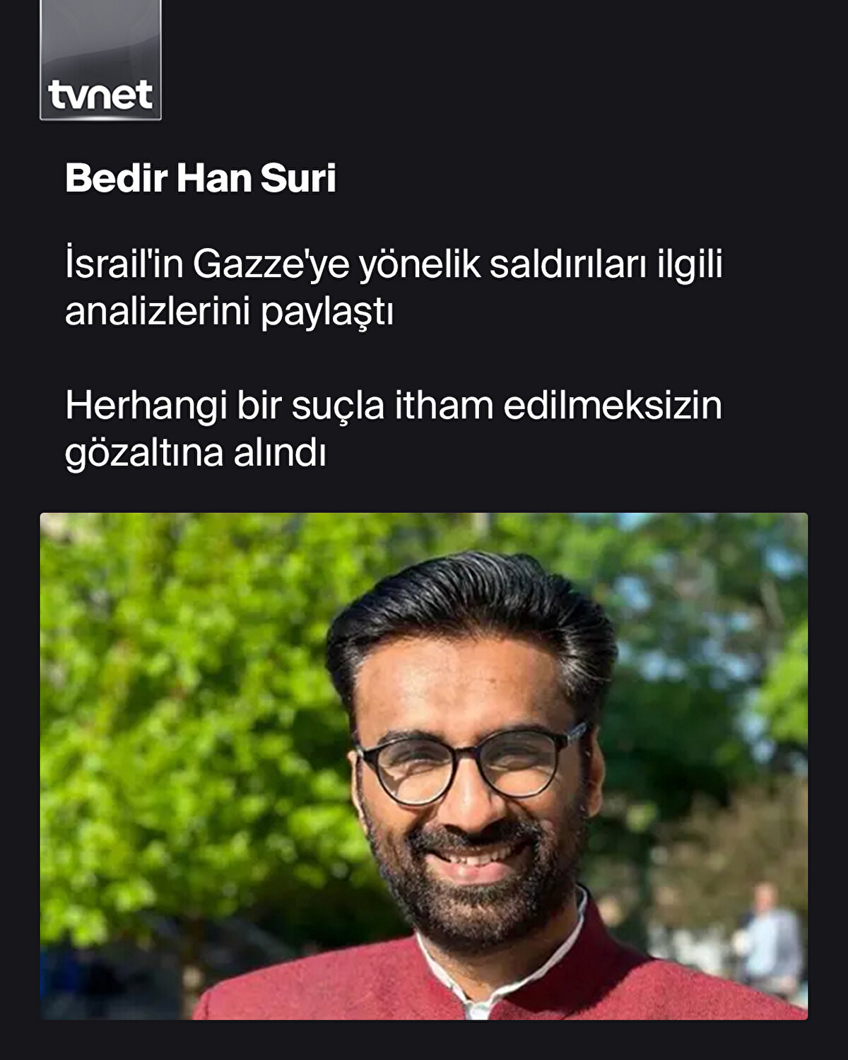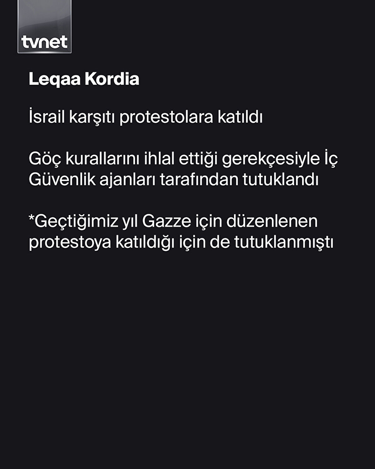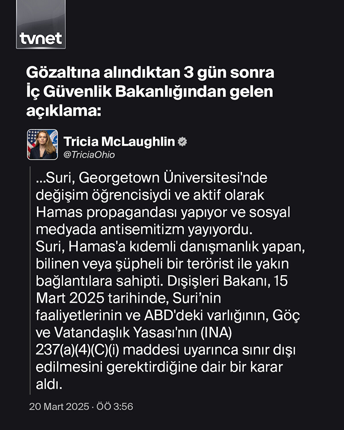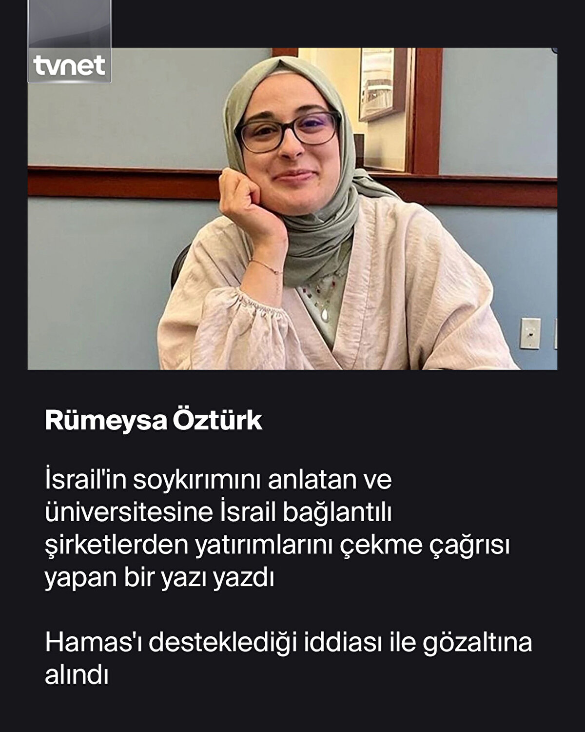 Tufts Üniversitesi'nde doktora yapan Türk öğrenci Rümeysa Öztürk, 25 Mart akşamı iftara gitmek için evinden çıktığı sırada Gümrük Muhafaza Dairesi görevlilerince gözaltına alındı.Rümeysa'ya yapılan Trump yönetimin Filistin destekçisi öğrenciler ve akademisyenlere karşı baskı uyguladığı bir dönemde gerçekleşti. Zira Rümeysa mağdur edilen öğrencilerden sadece biri. Trump yönetimi Filistin'e destek veren birçok öğrenci ve akademisyeni ya tutuklatıyor ya da sınır dışı ediyor.