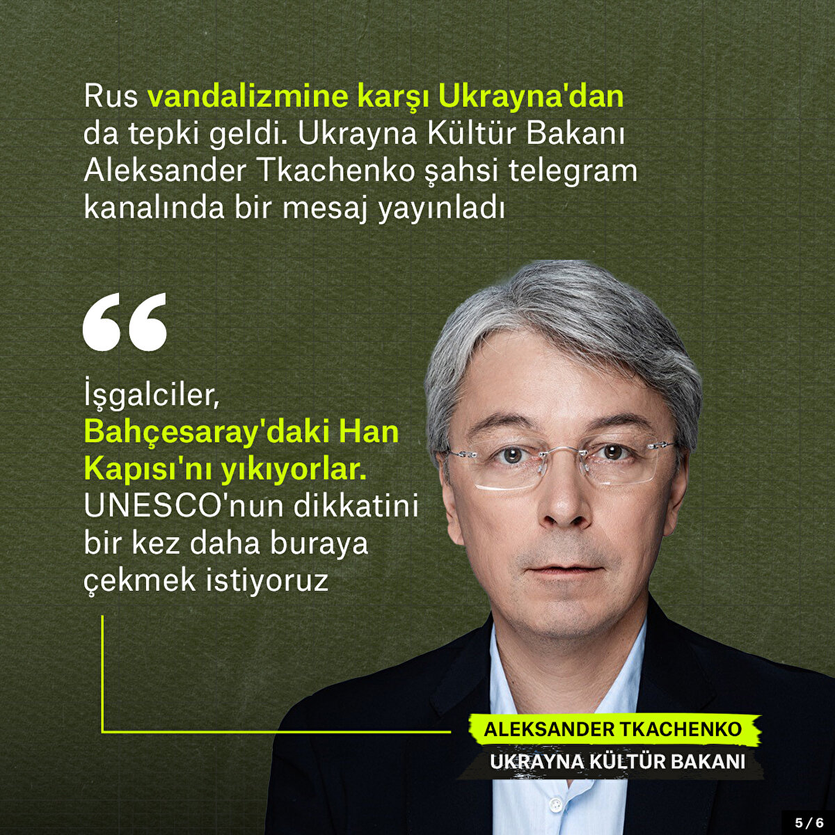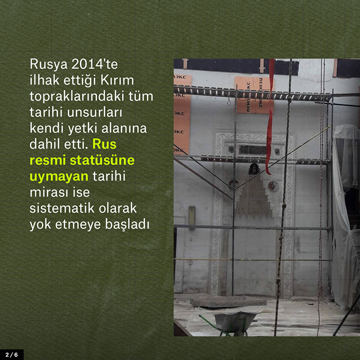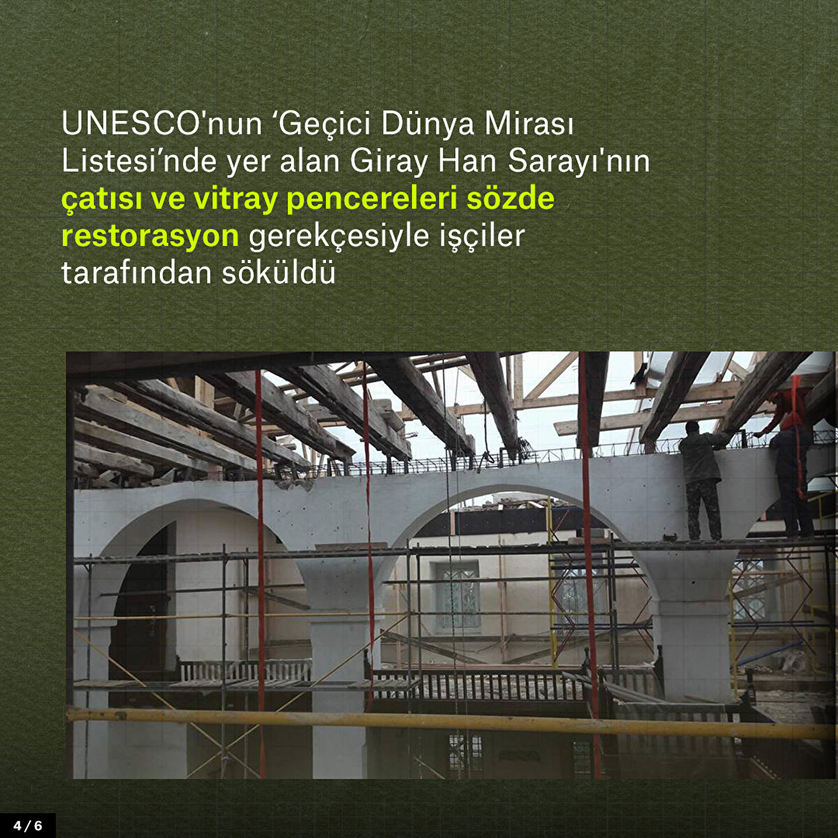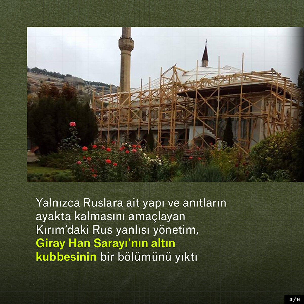 Rus yönetimi 2014'te ilhak ettiği toprakların tarihi yapılarını yok ediyor. Yönetim, Giray Han Sarayı'nın altın kubbesinin bir bölümü yıktı. UNESCO'nun 'Geçici Dünya Mirası Listesi'nde yer alan sarayın çatısı ve vitray pencereleri restore bahanesiyle söküldü