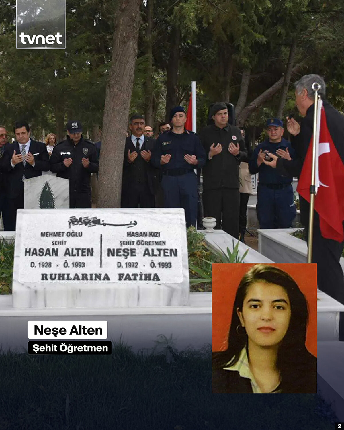 Terör örgütü PKK tarafından şehit edilen Şenay Aybüke Yalçın, Necmettin Yılmaz ve Neşe Alten mezarı başında anıldı. Şenay Aybüke Yalçın PKK'nın Batman Kozluk Belediye Başkanı'na yönelik saldırısı sırasında vücuduna mermi isabet etmesi sonucu şehit oldu. Müzik öğretmeniydi ve daha 22 yaşındaydı. Necmettin Yılmaz Şanlıurfa'nın Siverek ilçesinde öğretmenlik yaparken 2017 yılında ailesini ziyarete gittiği sırada hain terör örgütü PKK tarafından Tunceli'de kaçırıldı. Şehit edildiğinde meslektaşı Yalçın'la aynı yaştaydı. Şehit Neşe öğretmen ve kendisini yalnız bırakmak istemediği için birlikte Diyarbakır'ın Bismil ilçesine gelen babası Hasan Alten de 26 Ekim 1993 gecesi PKK'lı teröristler tarafından haince katledildi. İlk görev yerine giden şehit Alten henüz 21 yaşındaydı.