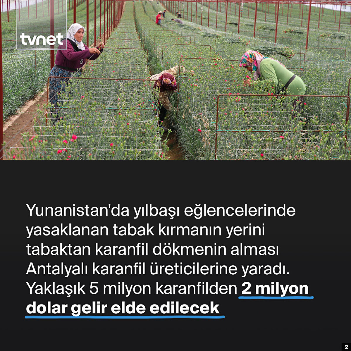 Maliyetinden dolayı tabak kırmanın yasaklandığı Yunanistan'da sirtaki dansının vazgeçilmezi haline gelen bir gelenek Türkiye'den ihraç edilen karanfille çözüme kavuştu. Artık tabaklar kırılmayacak, yerine Türkiye'nin güzelliklerinden olan karanfil çiçeğiyle kutlamalar yapılacak. Türkiye'den ithal edilen karanfil çiçeklerinin sadece kafa kısmının kullanılması özellikle yılbaşı kutlamalarında tavernalarda popüler hale geldi. Bu çözüm sadece Yunanistan'da değil, Türkiye'de de karanfil üreticileri için olumlu bir etki yaratıyor. Yaklaşık 5 milyon karanfilden elde edilen 2 milyon dolar gelir, Türk karanfil ihracatının artmasına katkı sağlıyor.