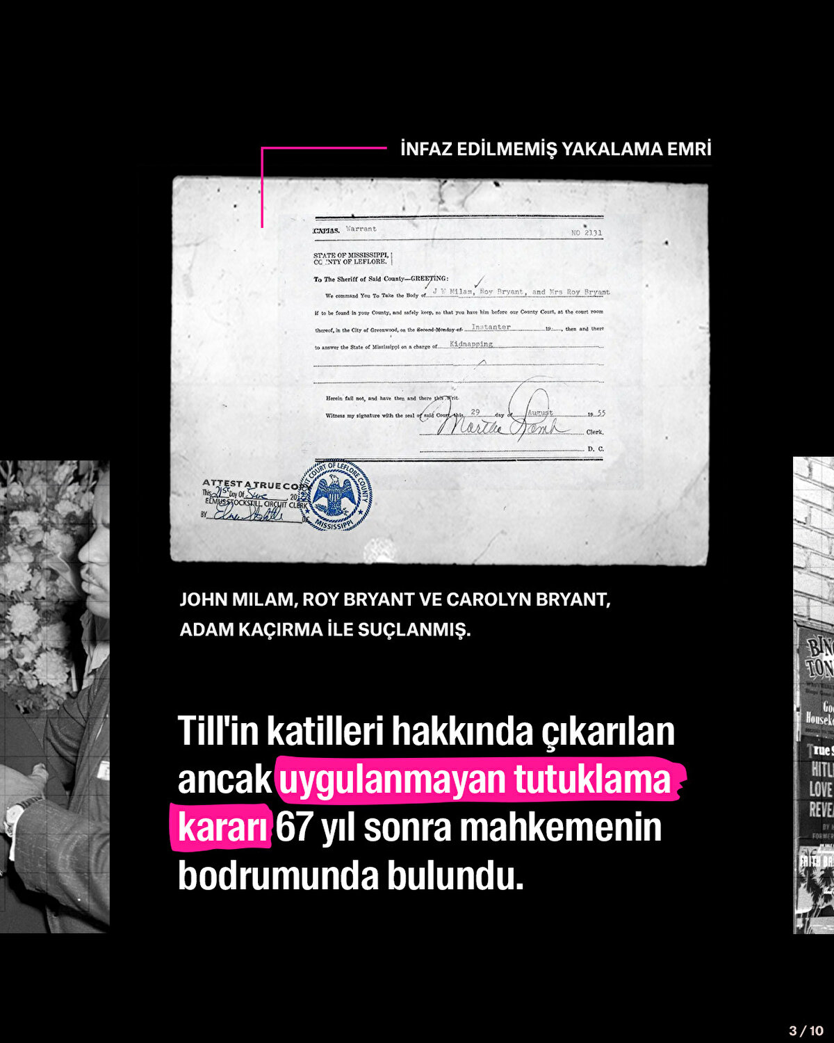1955'te ABD'de öldürülen 14 yaşındaki siyahi Emmett Till'in akrabaları da dahil olmak üzere bir soruşturma ekibi, cinayete dair yeni bir kanıta ulaştı. Till'in katilleri hakkında çıkarılan ancak uygulanmayan tutuklama kararı 67 yıl sonra mahkemenin bodrumunda bulundu. Till'in katilleri tüm delillere karşın, tamamı beyazlardan oluşan jüri tarafından suçsuz bulunmuş, cezalandırılmamıştı.