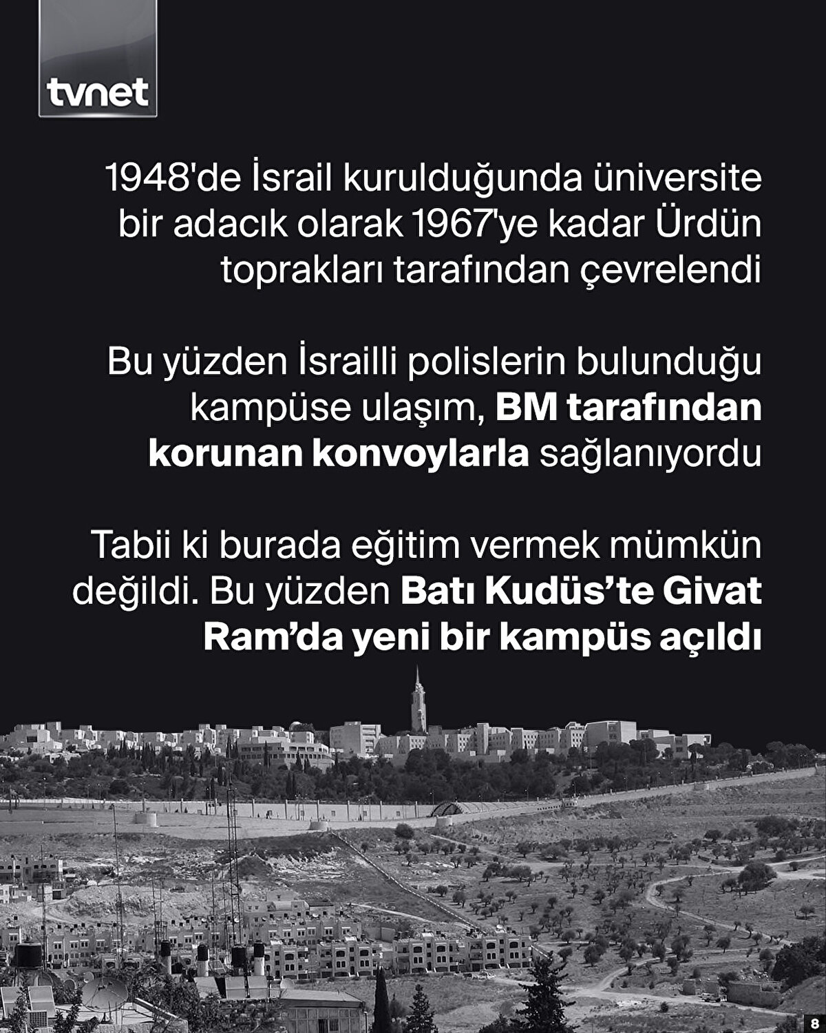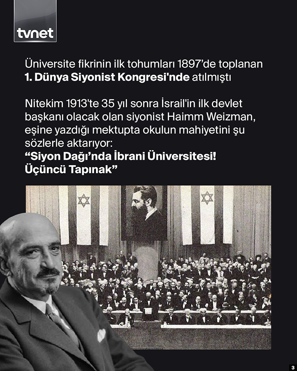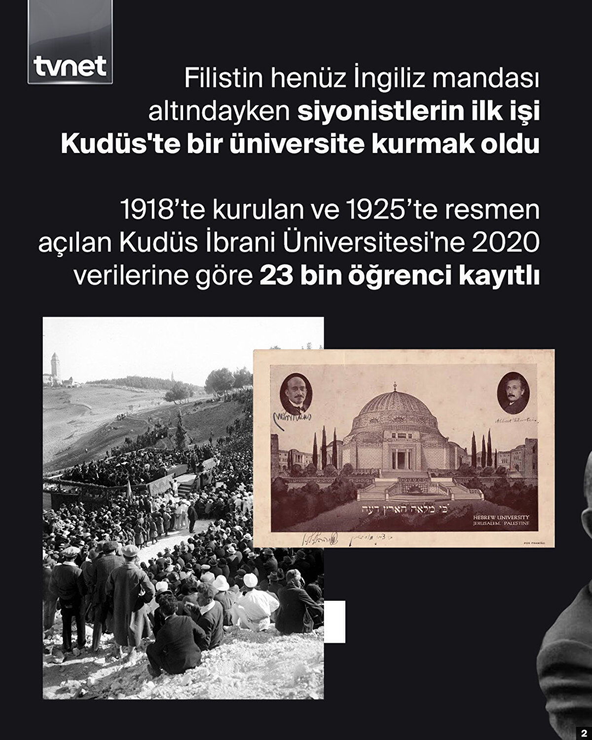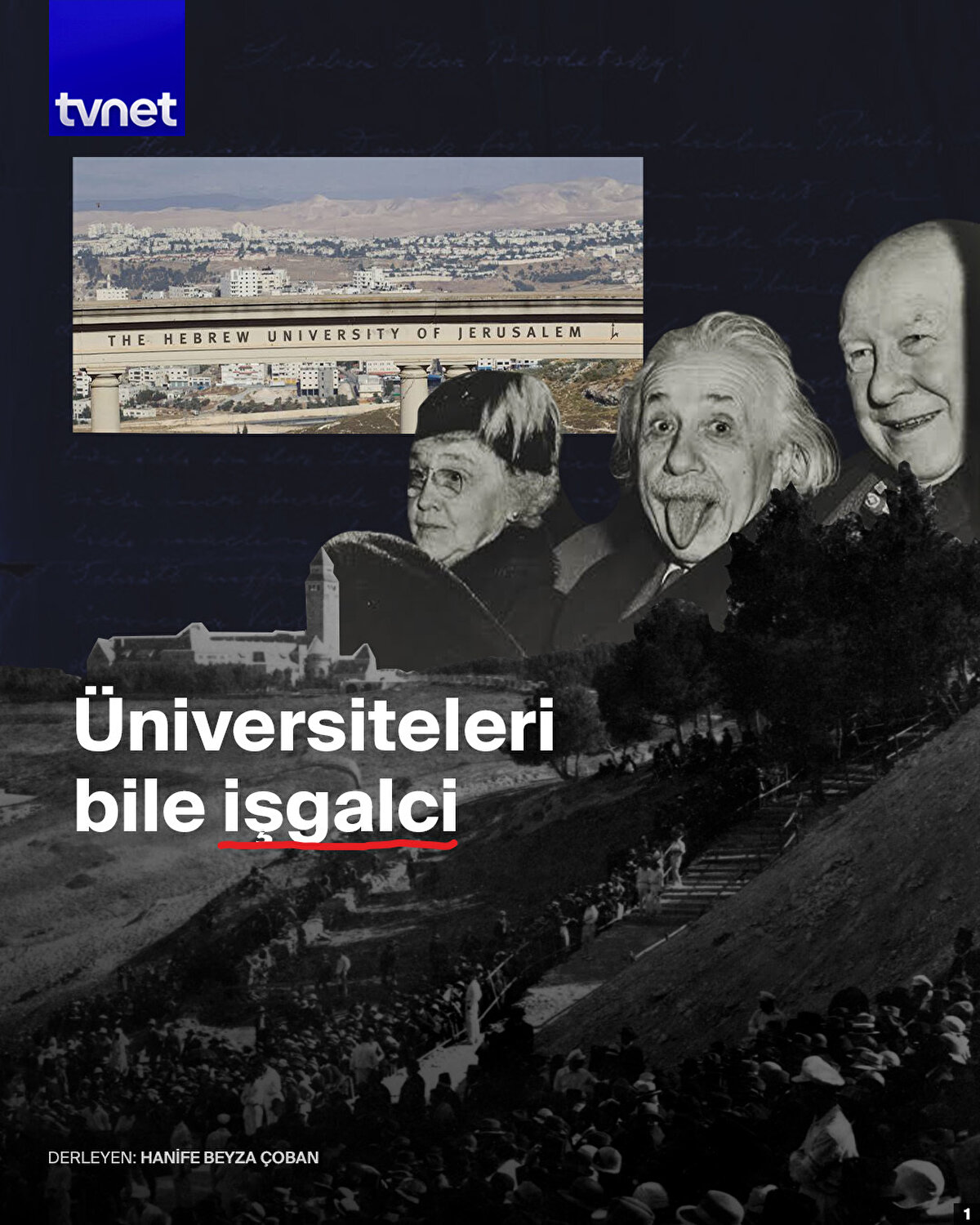 Yahudilerin bir ülkesi dahi yokken, Filistin henüz İngiliz mandası altındayken siyonistlerin ilk işi Kudüs'te bir üniversite kurmak oldu. 1918'te kurulan ve 1925'te resmen açılan Kudüs İbrani Üniversitesi'ne 2020 verilerine göre 23 bin öğrenci kayıtlı. Siyonist aklı nesilden nesile aktarmak onlar için işgalin ilk adımıydı. Nitekim üniversite sıralarında bugün yürüttükleri soykırımın hayalini kuran nesilleri yetiştirdiler. Üniversite fikrinin ilk tohumları 1897'de toplanan 1. Dünya Siyonist Kongresi'nde atılmıştı. 1913'de 35 yıl sonra İsrail'in ilk devlet başkanı olacak olan siyonist Haimm Weizman, eşine yazdığı mektupta okulun mahiyetini şu sözlerle aktarıyor: “Siyon Dağında İbrani Üniversitesi! Üçüncü Tapınak”.