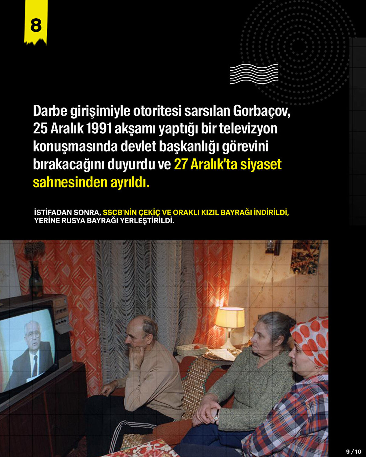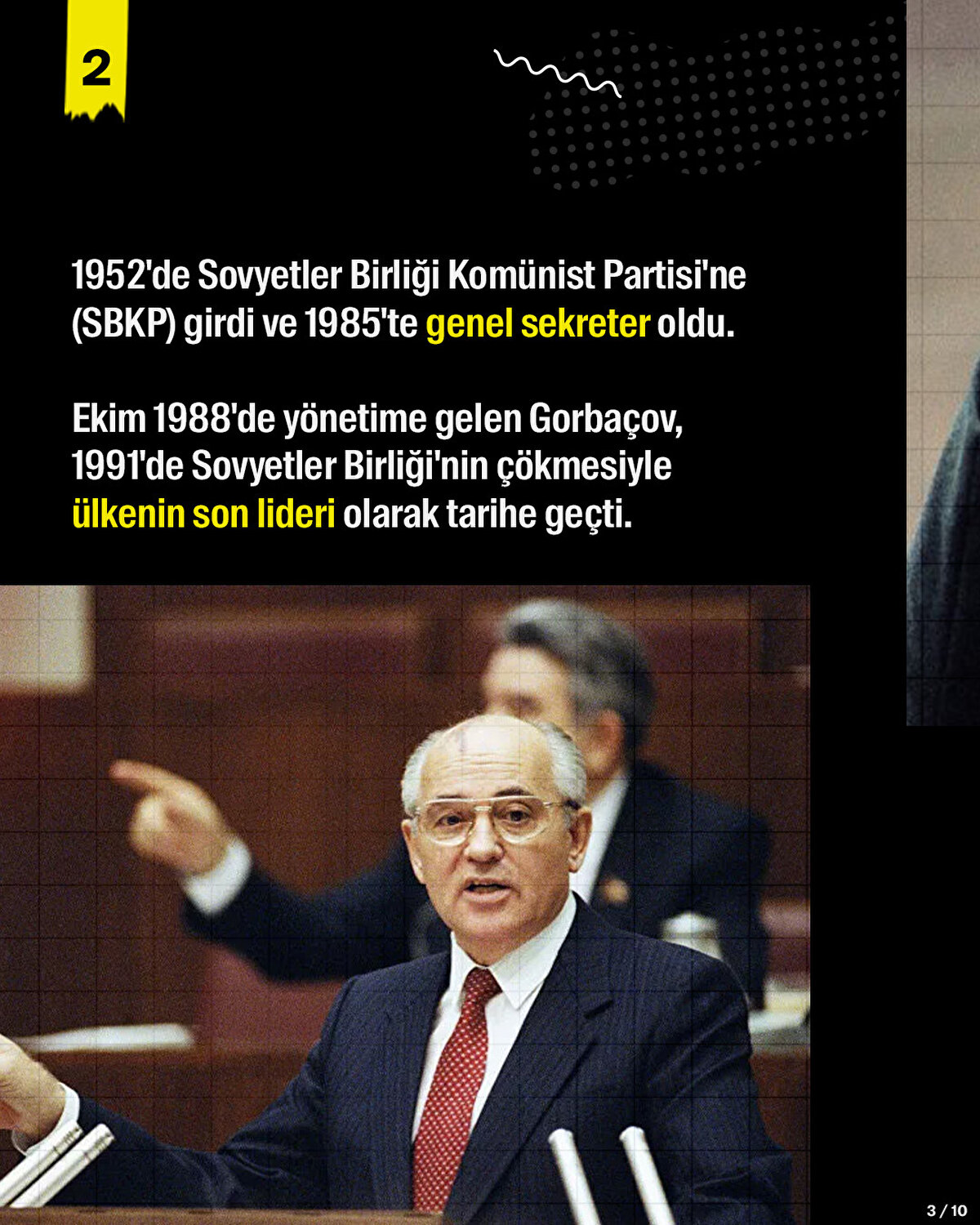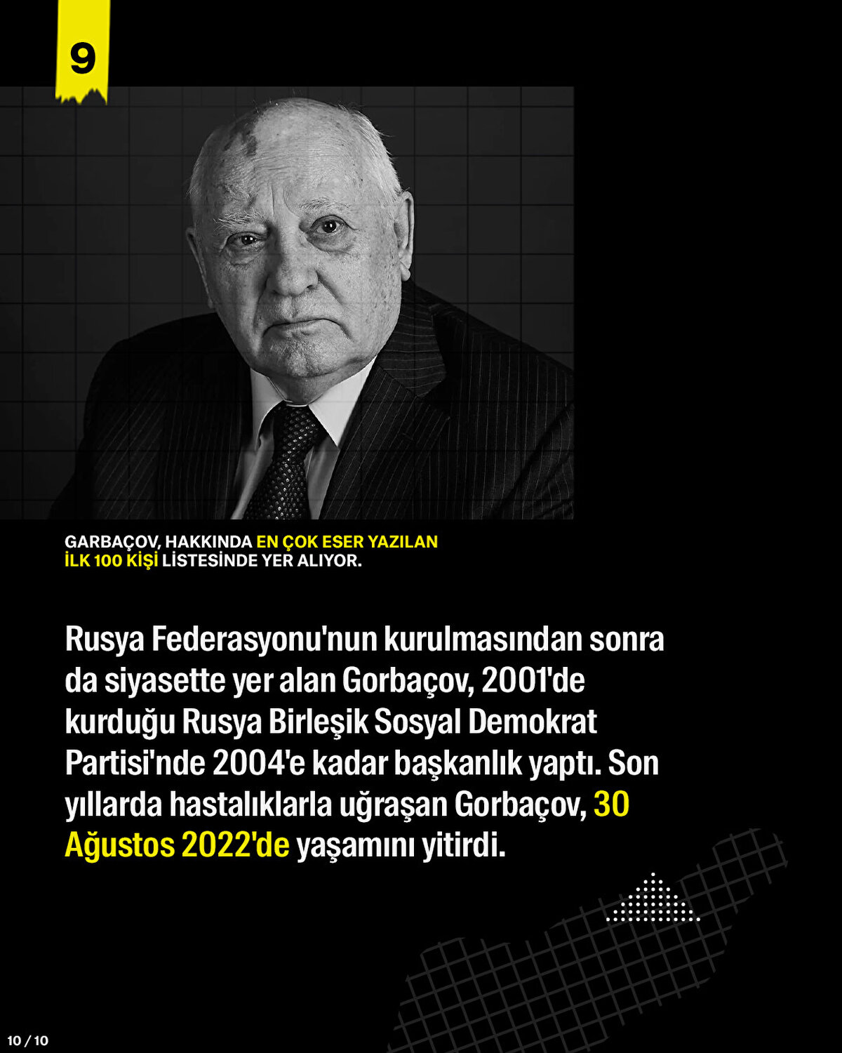 Ekim 1988'de yönetime gelen Gorbaçov, 1991'de Sovyetler Birliği'nin çökmesiyle ülkenin son lideri olarak tarihe geçti. Rusya Federasyonu'nun kurulmasından sonra da siyasete devam etti. Son yıllarda hastalıklarla uğraşan Gorbaçov, 30 Ağustos 2022'de yaşamını yitirdi.