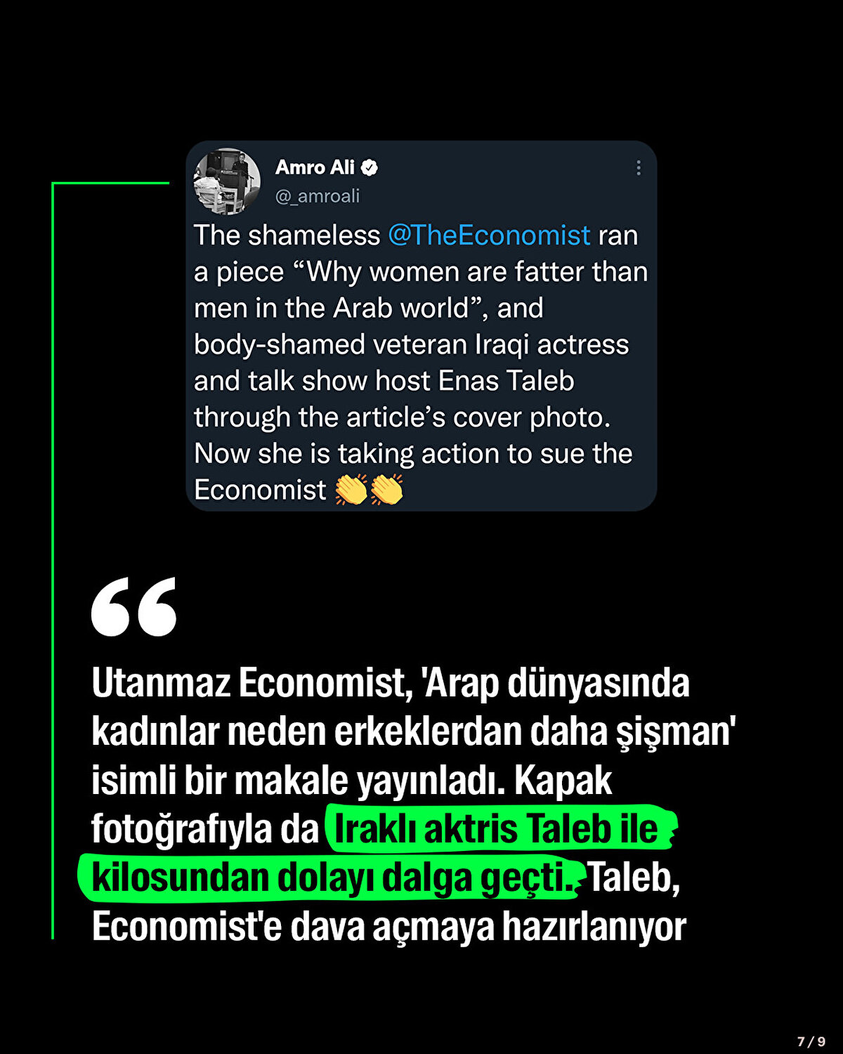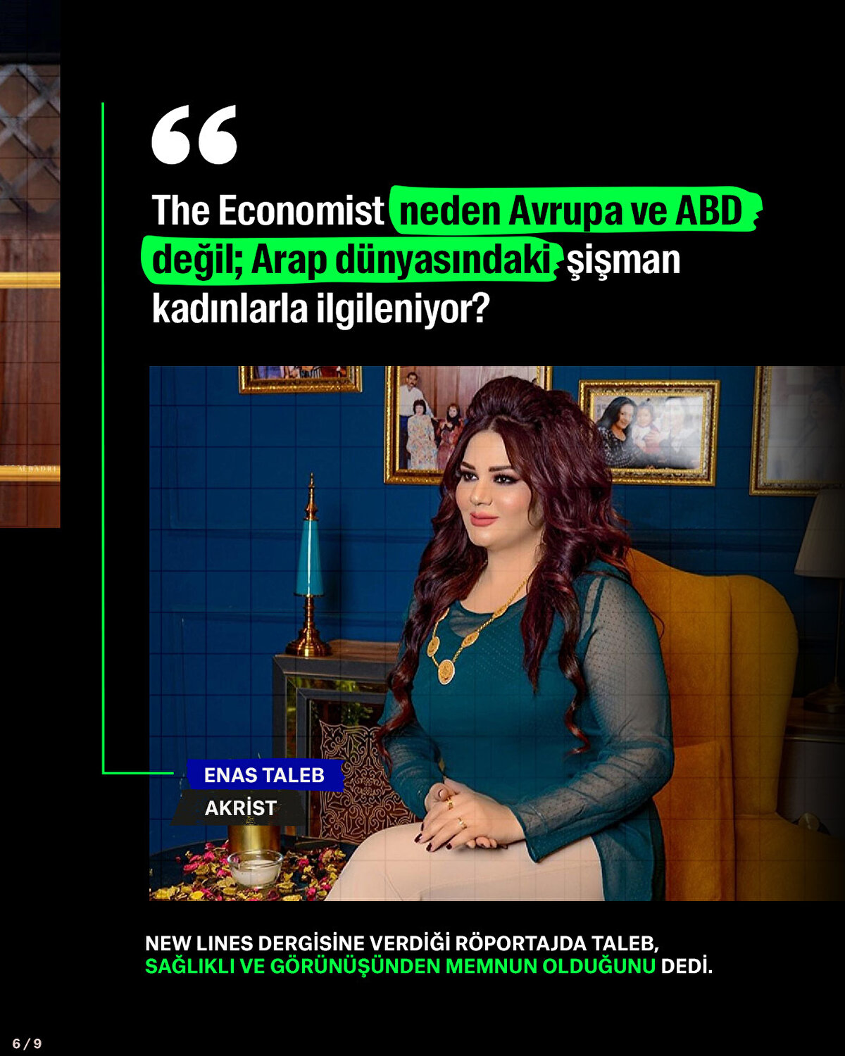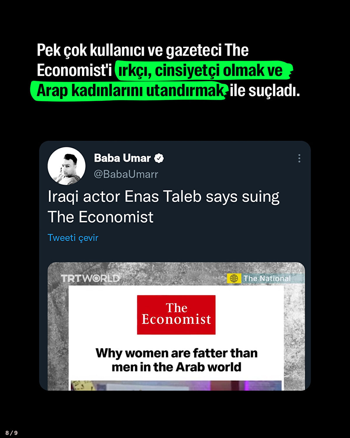 Londra merkezli haber dergisi The Economist, 28 Haziran'da 'Neden Arap dünyasında kadınlar erkeklerden daha şişman' başlıklı bir makale yayınladı. The Economist'in makalesinde, Arap kadınların yoksulluk ve toplumsal baskı nedeniyle evde tutulduğu ve bu yüzden daha kilolu oldukları iddia ediliyordu.