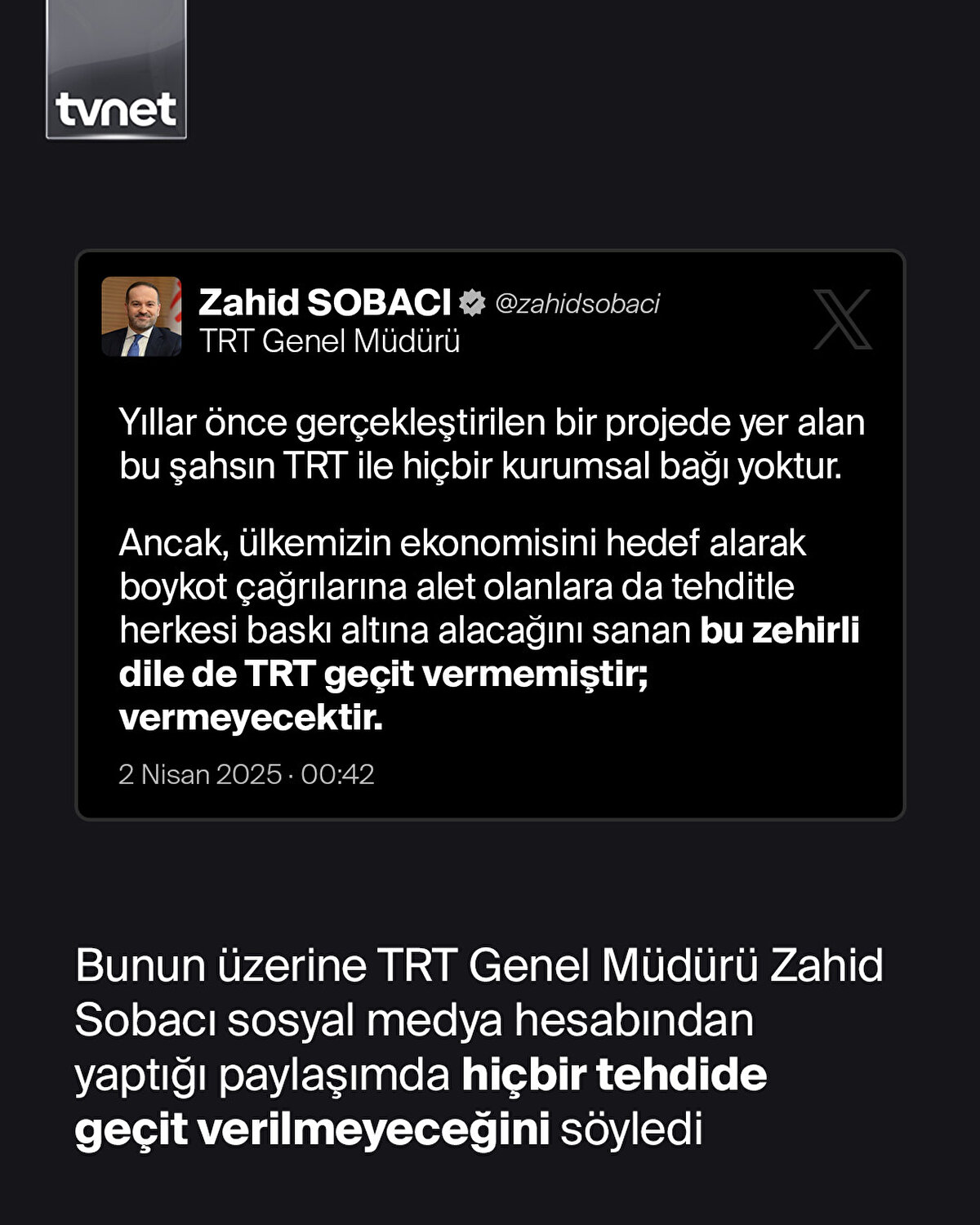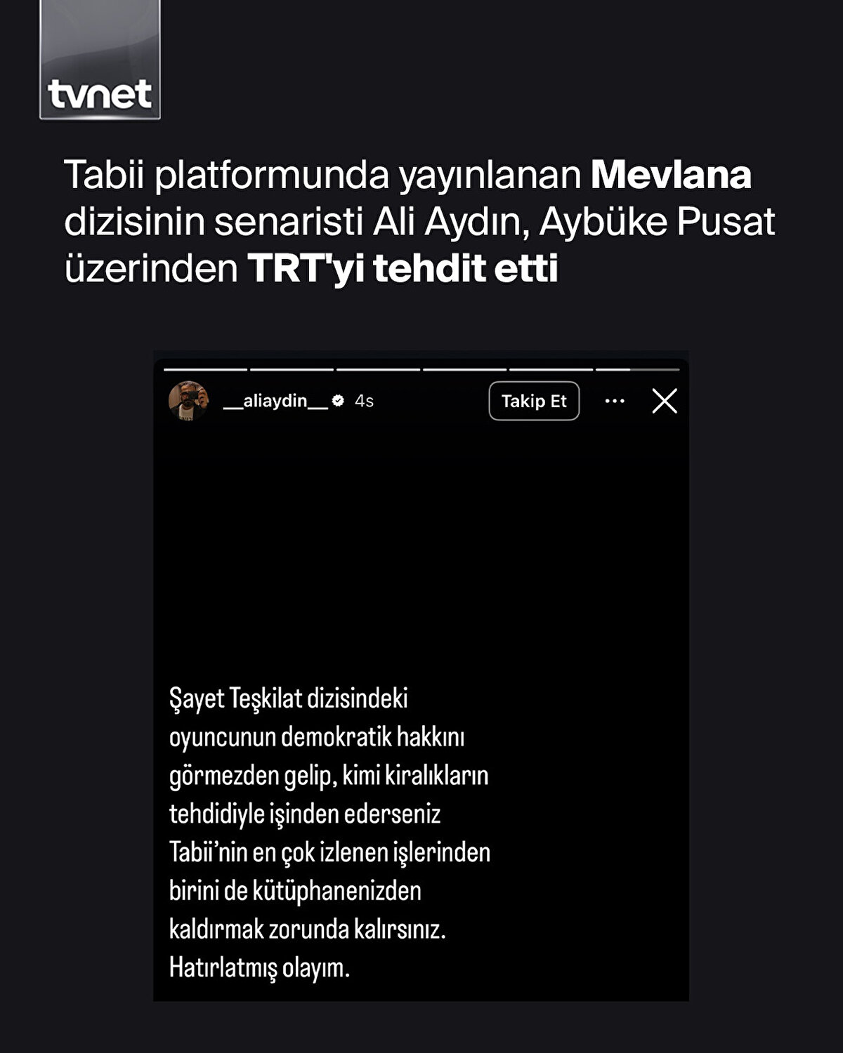 Tabii platformunda yayınlanan Mevlana dizisinin senaristi Ali Aydın, Aybüke Pusat üzerinden TRT'yi tehdit etti. TRT Genel Müdürü Zahid Sobacı sosyal medya hesabından yaptığı paylaşımda hiçbir tehdide geçit verilmeyeceğini söyledi.