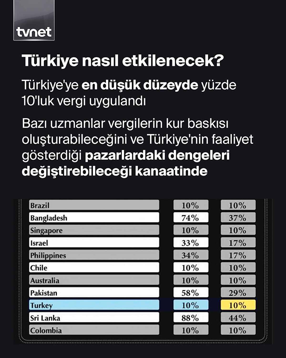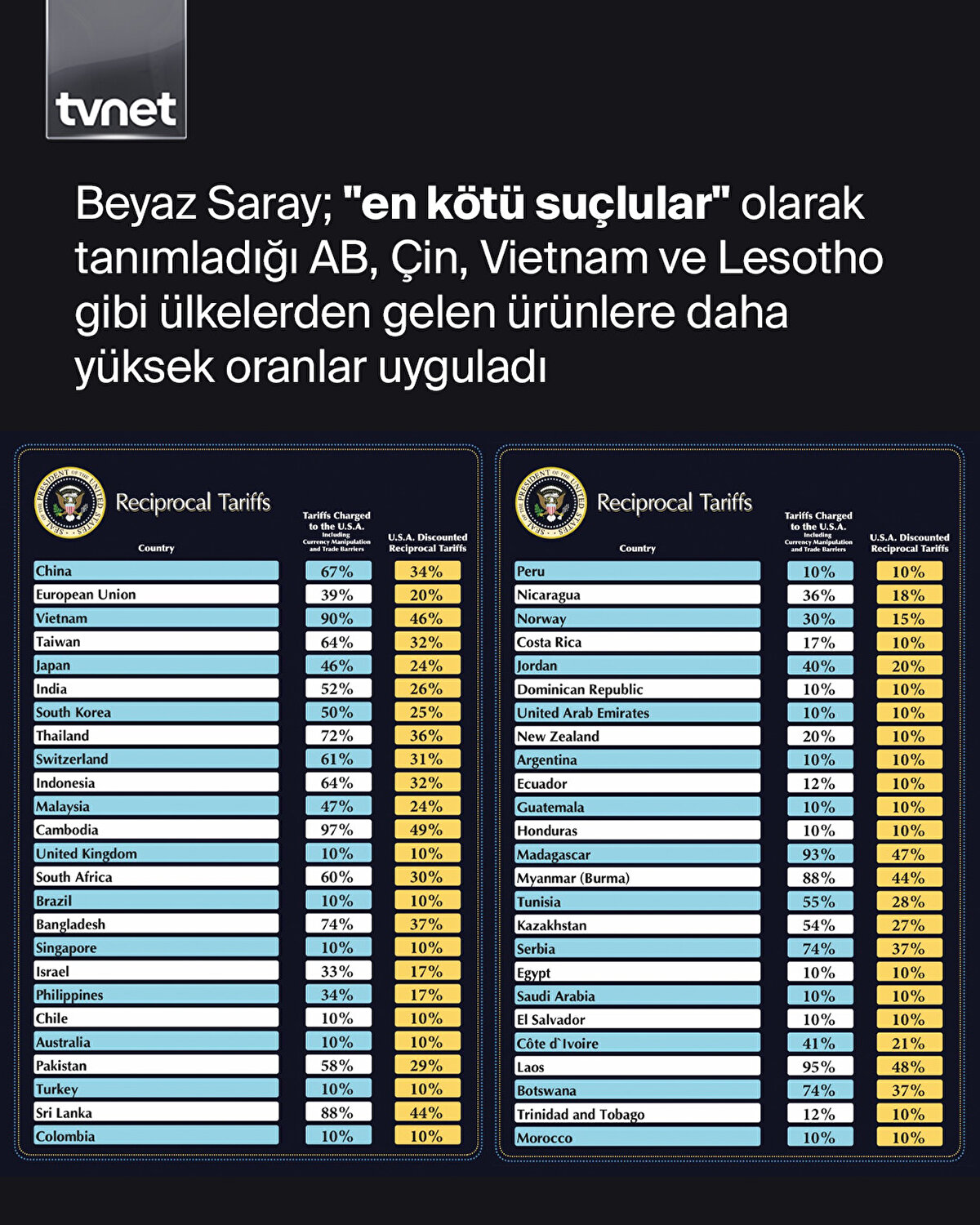 ABD Başkanı Donald Trump, ABD'nin diğer ülkelere karşılıklı tarifeler uygulayacağını, asgari gümrük vergisi oranının yüzde 10 olacağını açıkladı. Her ülke için ayrı tarife oranlarını açıklayan ABD Başkanı Trump, Türkiye'yi yüzde 10 oranında asgari gümrük vergisi uygulanacak ülkeler grubuna dahil etti.