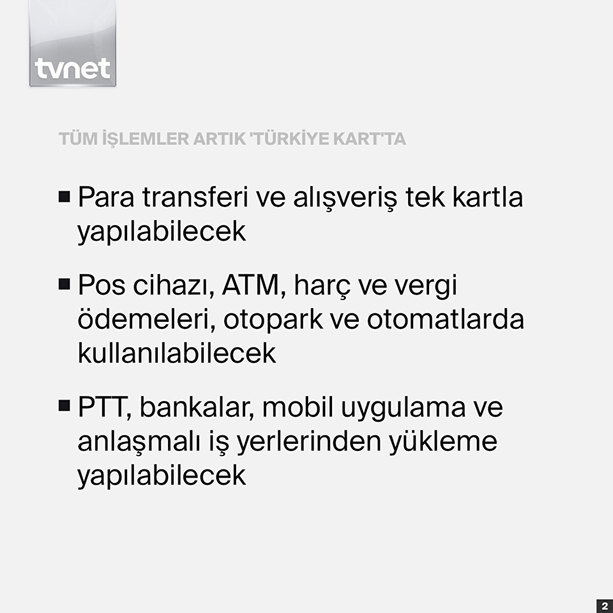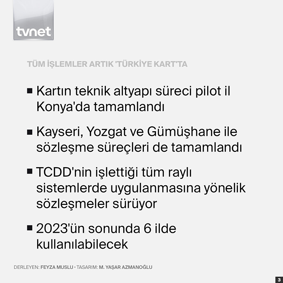 Ulaşımdan alışverişe kadar her alanda kullanılabilecek olan Türkiye Kart tüm Türkiye'de kullanılmak üzere hazırlanıyor. Ulaştırma ve Altyapı Bakanı Abdulkadir Uraloğlu, Türkiye Kart projesinin pilot uygulamasının Konya'da tamamlandığını söyledi.81 ilde yaygın hale getirilmesi için çalışmaların sürdürülen kart 2023'ün sonunda 6 ilde de kullanılabilecek.