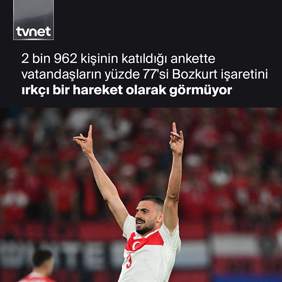 Areda Survey, 4-5 Temmuz'da Türkiye genelinde 2 bin 962 kişiyle anket yaptı. Ankette Merih Demiral'ın Avusturya maçında yaptığı Bozkurt hareketinin ırkçı olmadığı yönünde oy kullanıldı. Vatandaşların yüzde 77'si Bozkurt işaretini ırkçı bir hareket olarak görmezken, yüzde 67'si Batı'da Türklere karşı ırkçı bir tutumun olduğu kanattinde.