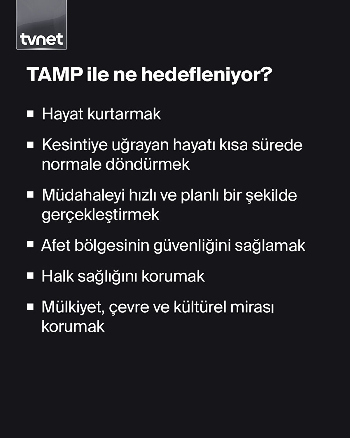 TAMP'nın amacı; afet ve acil durumlara ilişkin müdahale çalışmalarında görev alacak çalışma grupları ve koordinasyon birimlerine ait rolleri ve sorumlulukları tanımlamak ile afet öncesi, sırası ve sonrasındaki müdahale planlamasının temel prensiplerini belirlemek.