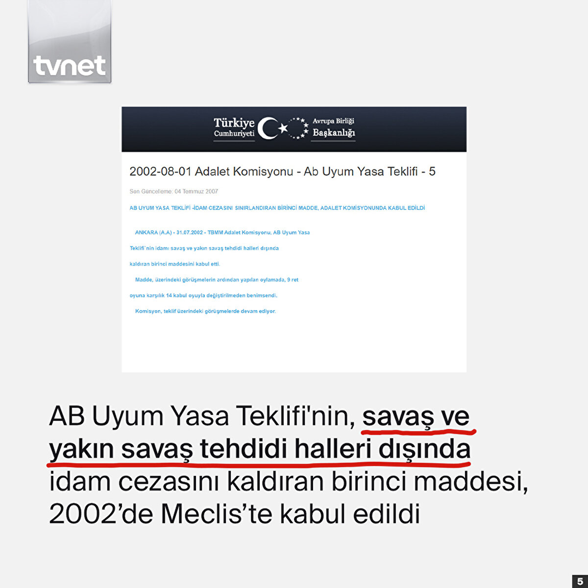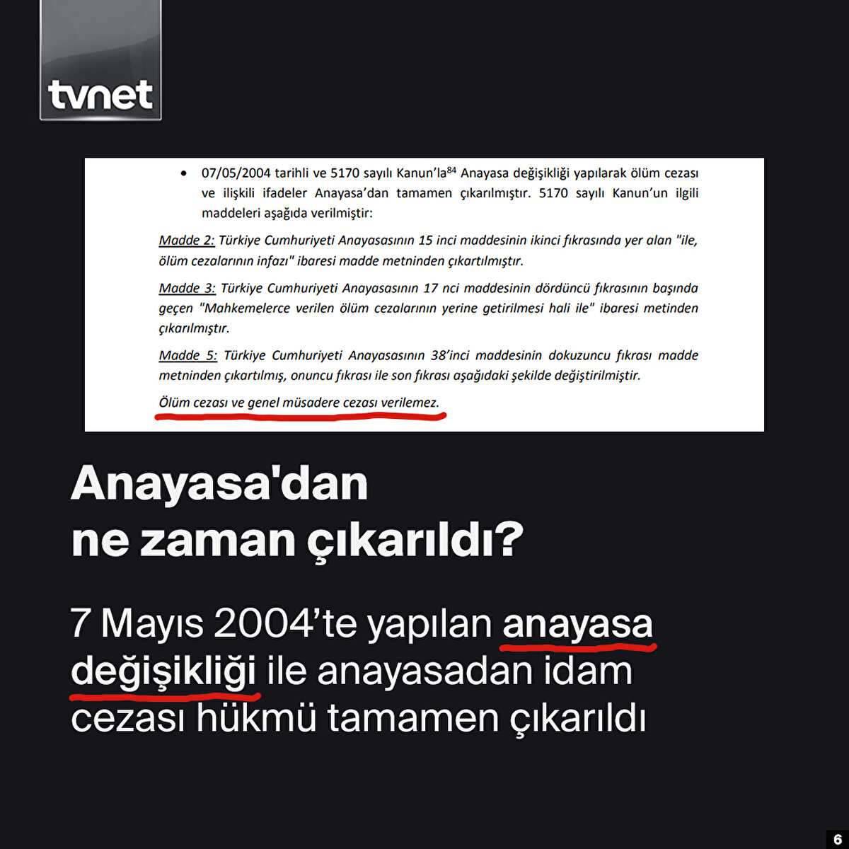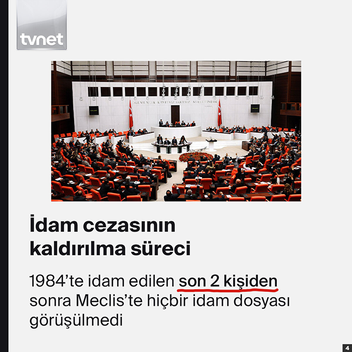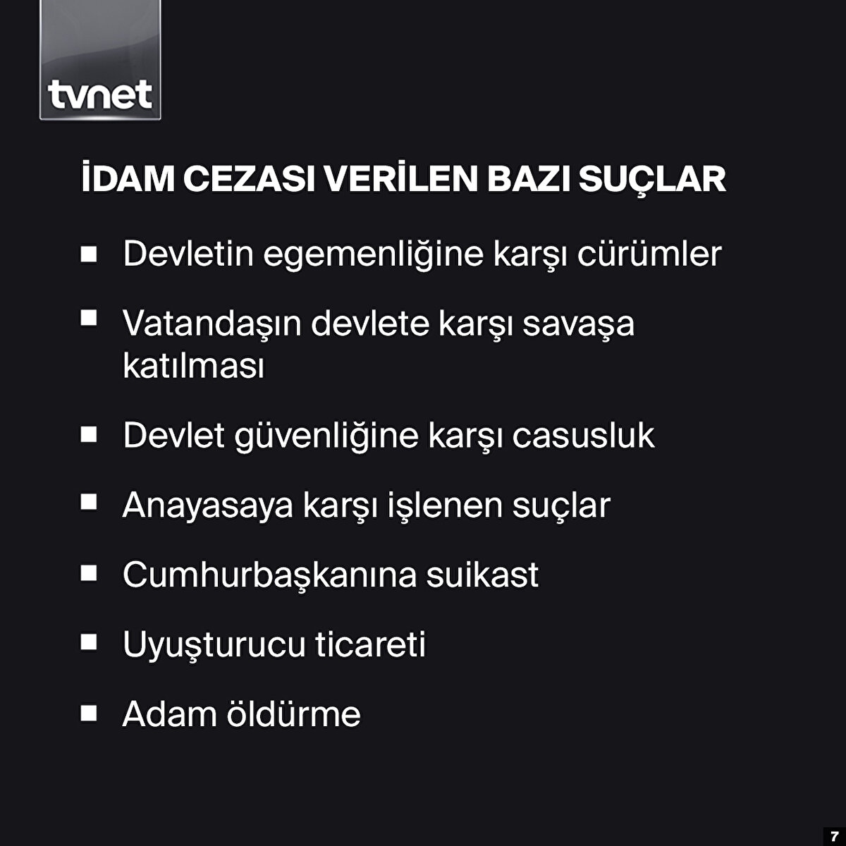 Türkiye'de idam cezası, 1984'ten bu yana uygulanmıyor. 1920 yılından itibaren 64 yıl uygulanan idam cezalarında 15'i kadın olmak üzere toplam 712 kişi idam edildi. 2002'de AB Uyum Yasa Teklifi'nin, savaş ve yakın savaş tehdidi halleri dışında idam cezasını kaldıran birinci maddesi, Meclis'te kabul edildi. 2004'te ise idam cezası uygulaması anayasadan tamamen çıkarıldı.