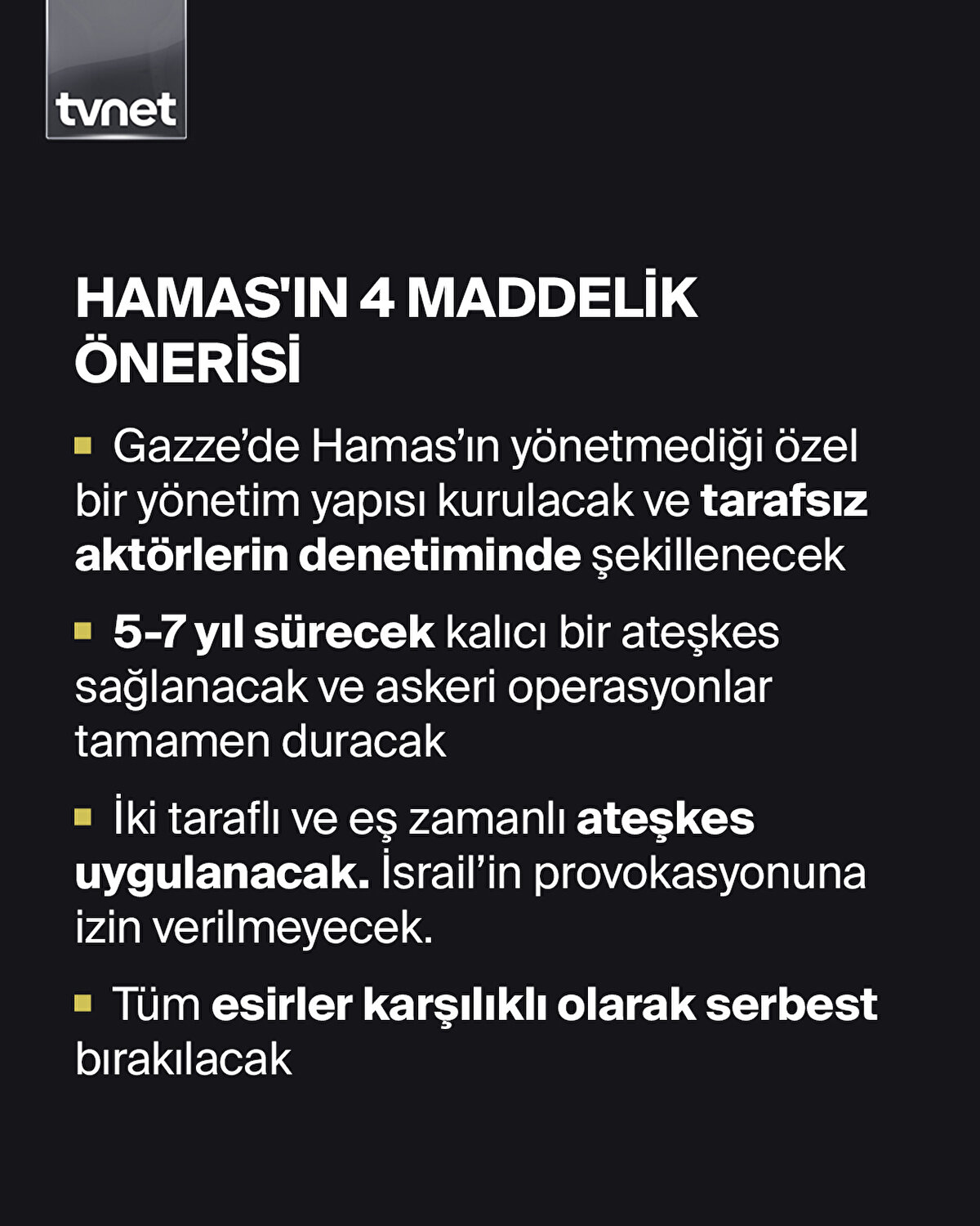 Hamas tarafından hazırlanan 4 maddelik öneri, Dışişleri Bakanı Hakan Fidan tarafından ABD'li yetkililere iletildi. Bu girişimden sonra Hamas, ABD-İsrail vatandaşı Edan Alexander'ı serbest bırakmıştı.