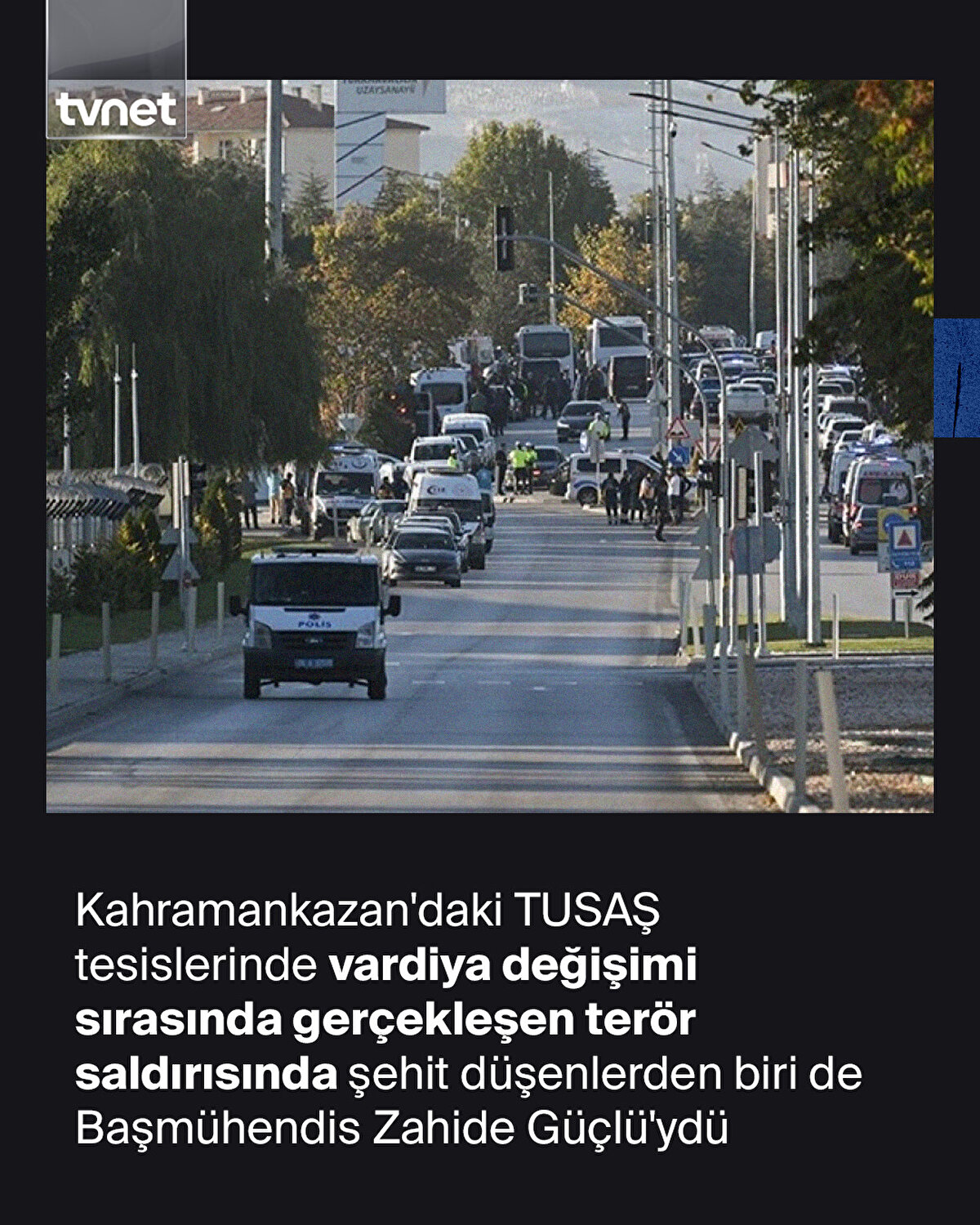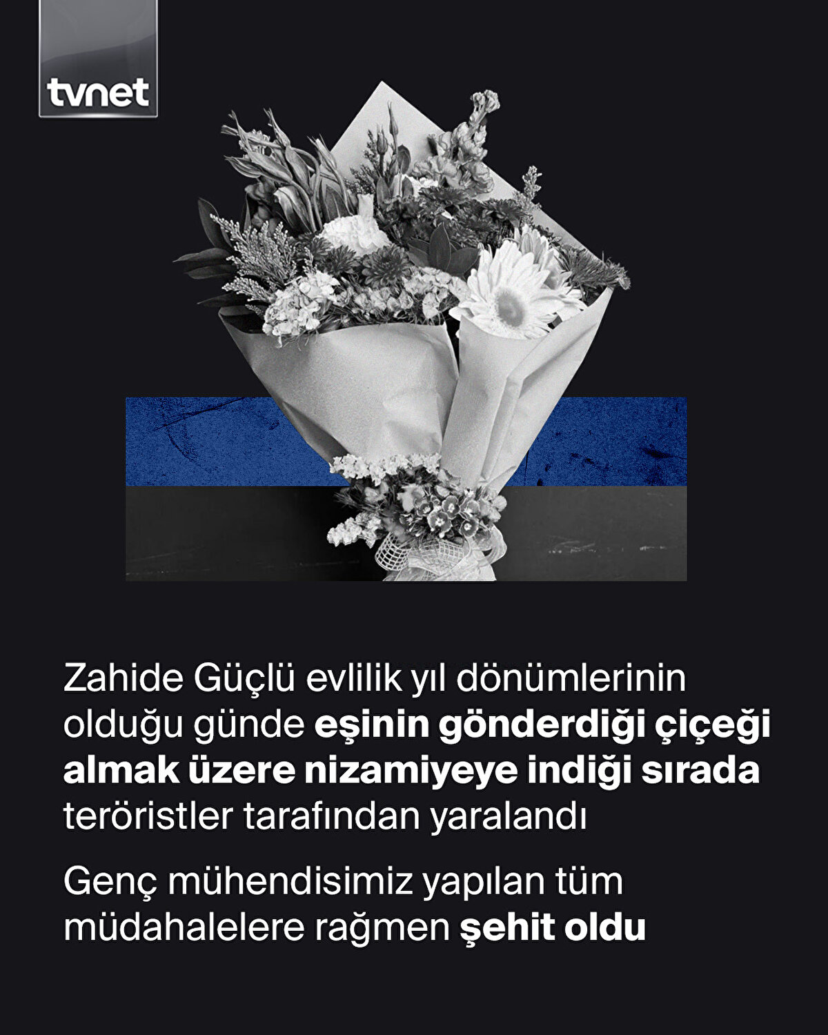 TUSAŞ tesislerinde meydana gelen terör saldırısında 5 vatandaşımız şehit oldu, 22 kişi yaralandı. Biri kadın biri erkek olmak üzere saldırıyı gerçekleştiren teröristler etkisiz hale getirildi. Şehit olanlardan biri de Başmühendis Zahide Güçlü'ydü. Eşi ile evlilik yıl dönümlerinin olduğu gün kendisine gönderilen çiçeği almaya gittiği sırada teröristler tarafından vurulan Güçlü, kaldırıldığı hastanede hayatını kaybetti.