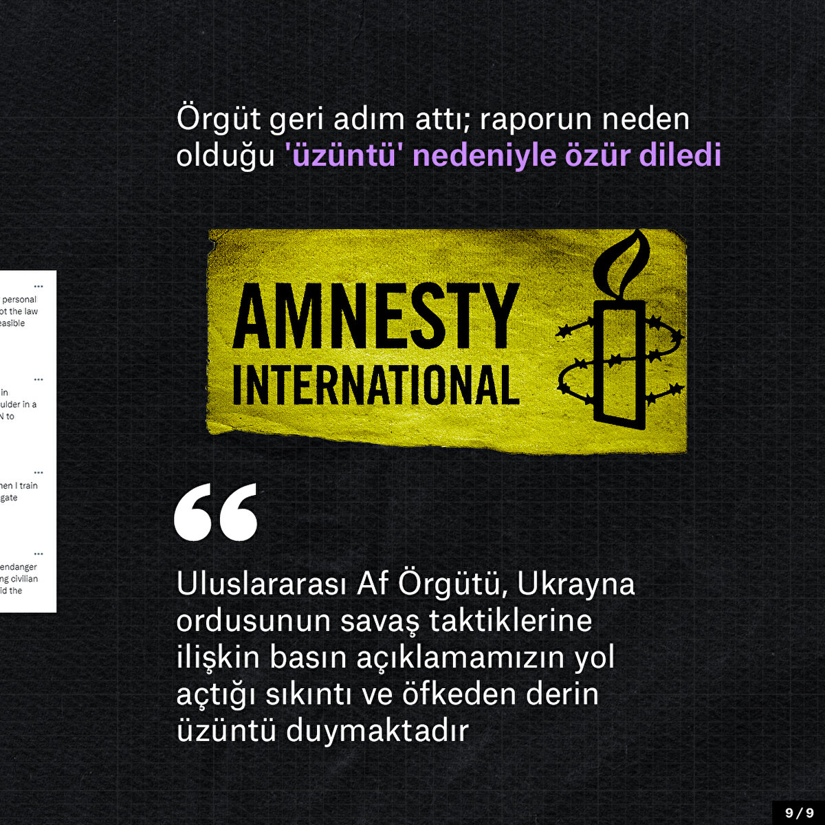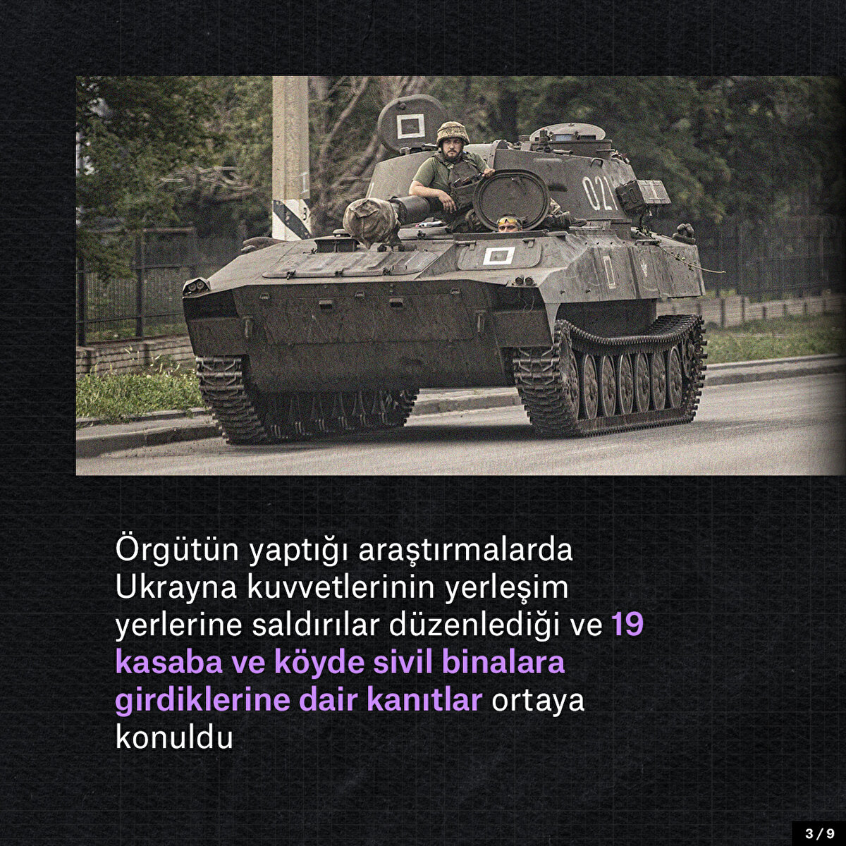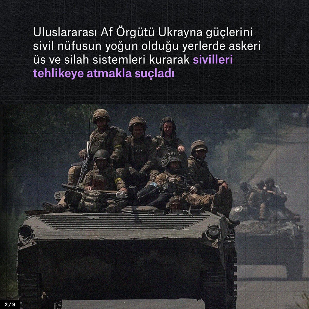 Uluslararası Af Örgütü Ukrayna güçlerini sivil nüfusun yoğun olduğu yerlerde askeri üs ve silah sistemleri kurarak sivilleri tehlikeye atmakla suçladı. Zelenski ve batılı ülke üst düzey yöneticilerinden gelen tepki nedeniyle Af Örgütü özür diledi