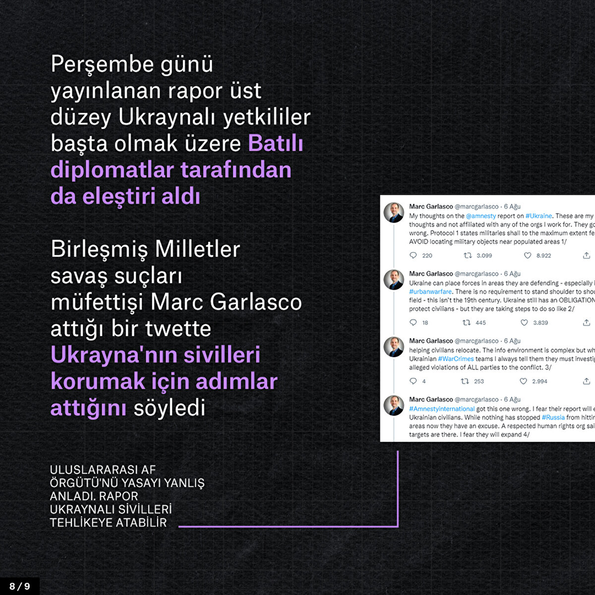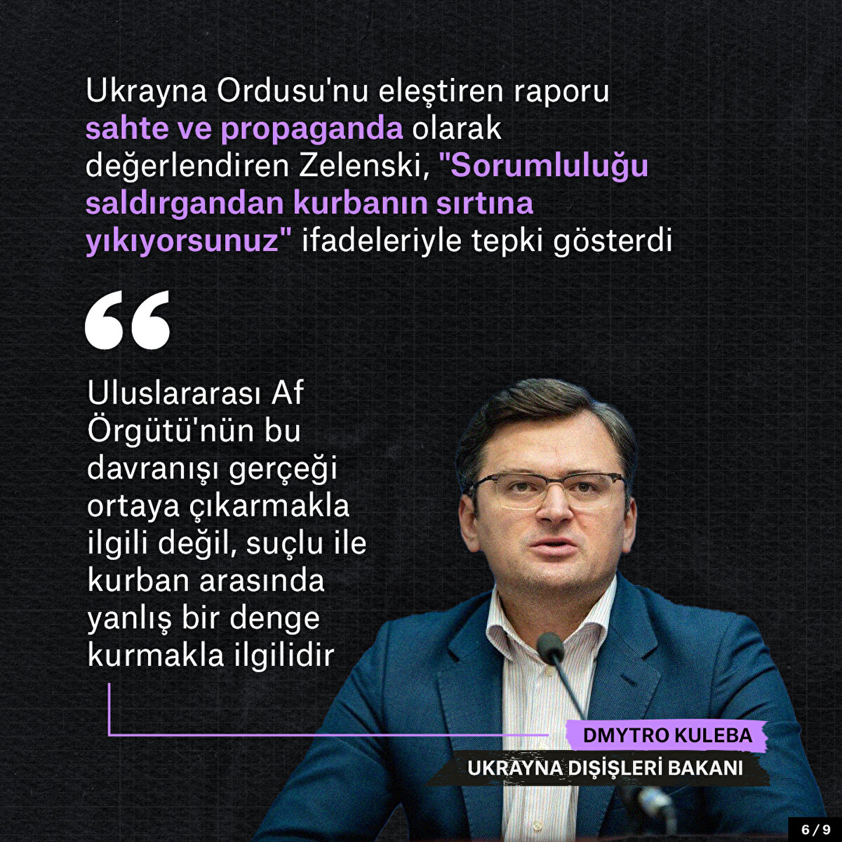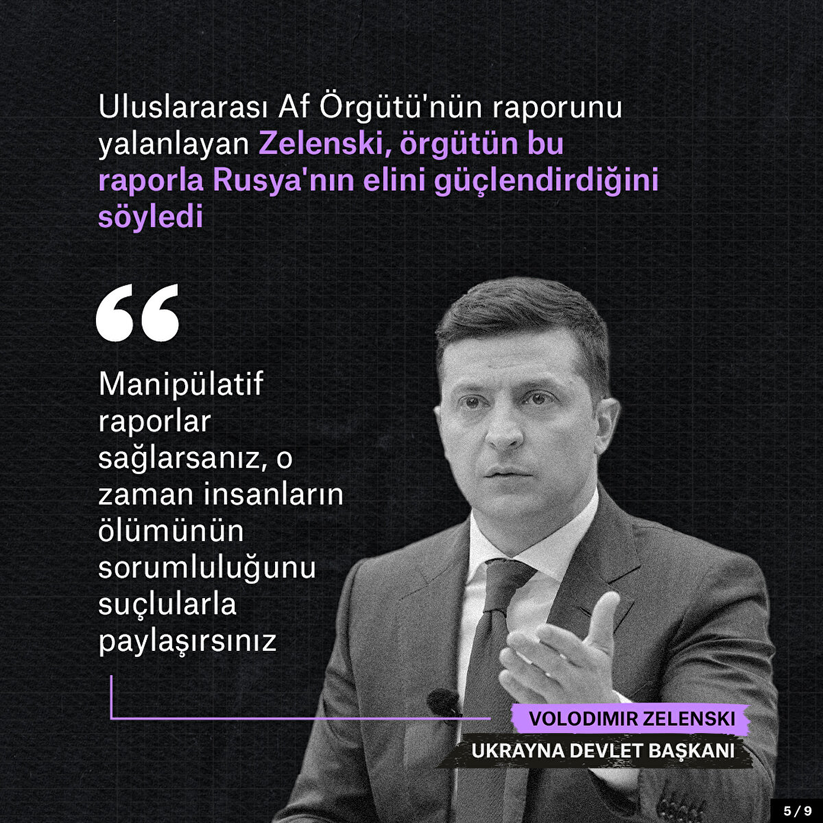Uluslararası Af Örgütü Ukrayna güçlerini sivil nüfusun yoğun olduğu yerlerde askeri üs ve silah sistemleri kurarak sivilleri tehlikeye atmakla suçladı. Zelenski ve batılı ülke üst düzey yöneticilerinden gelen tepki nedeniyle Af Örgütü özür diledi