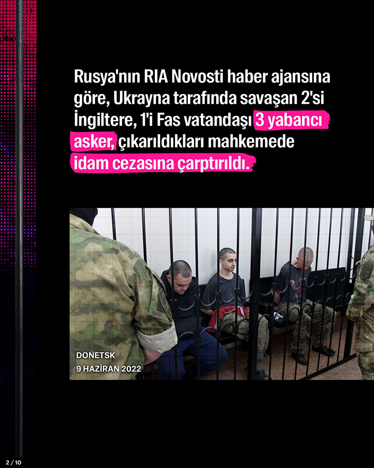 Rusya'nın RIA Novosti haber ajansına göre, Ukrayna tarafında savaşan 2'si İngiltere, 1'i Fas vatandaşı 3 yabancı asker, çıkarıldıkları mahkemede idam cezasına çarptırıldı. İdamı istenen İngiliz Aiden Aslin, daha önce PKK/YPG saflarında yer almıştı.