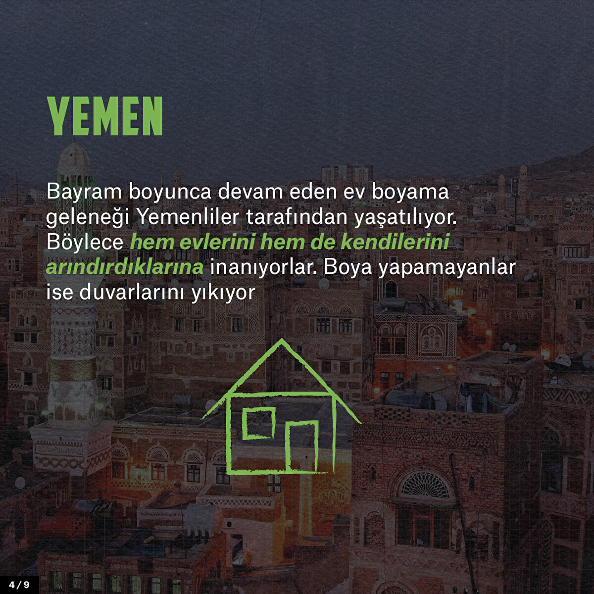 Yemen, Endonezya, Güney Afrika ve Türkiye... Ramazan ayının bitmesine yakın bazı ülkelerde bayram telaşı başlıyor. Kimi ülkeler bayramı en renkli etkinliklerle kutlarken kimileri de evlerini boyayarak kendilerini arınmış hissediyorlar. Bu bayram gelenekleri halk tarafından uzun yıllar boyu her sene yaşatılıyor