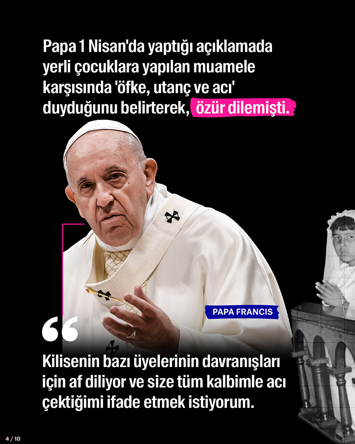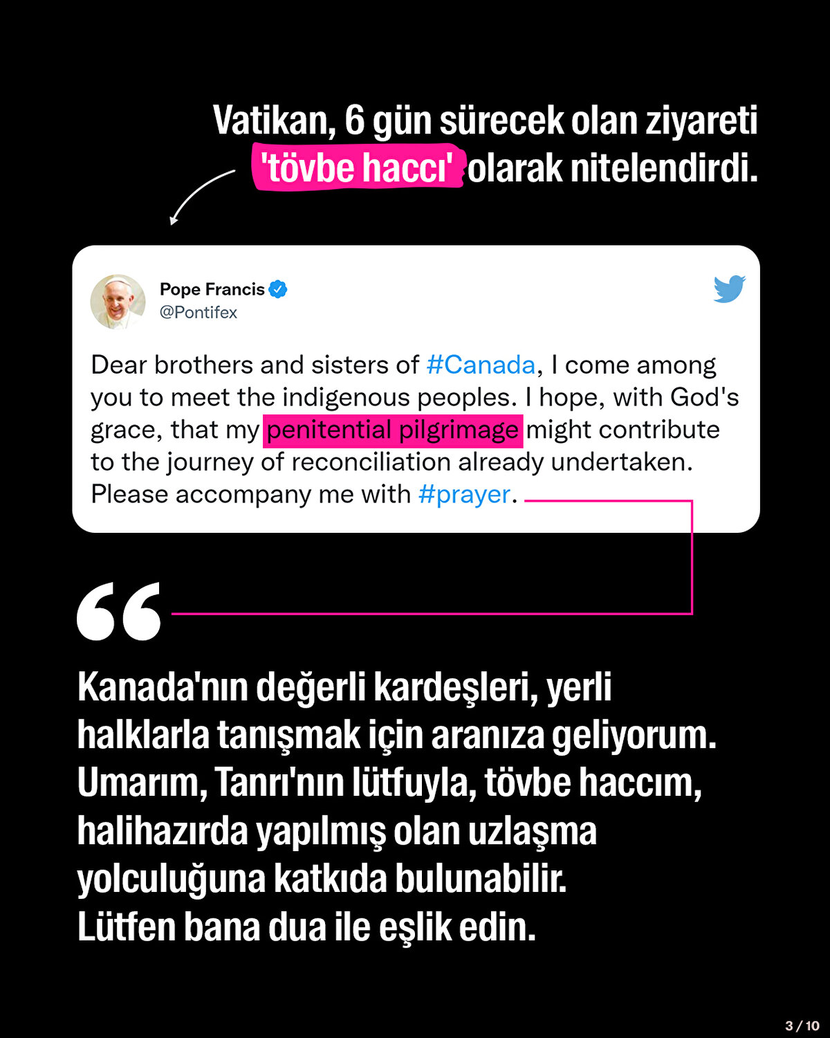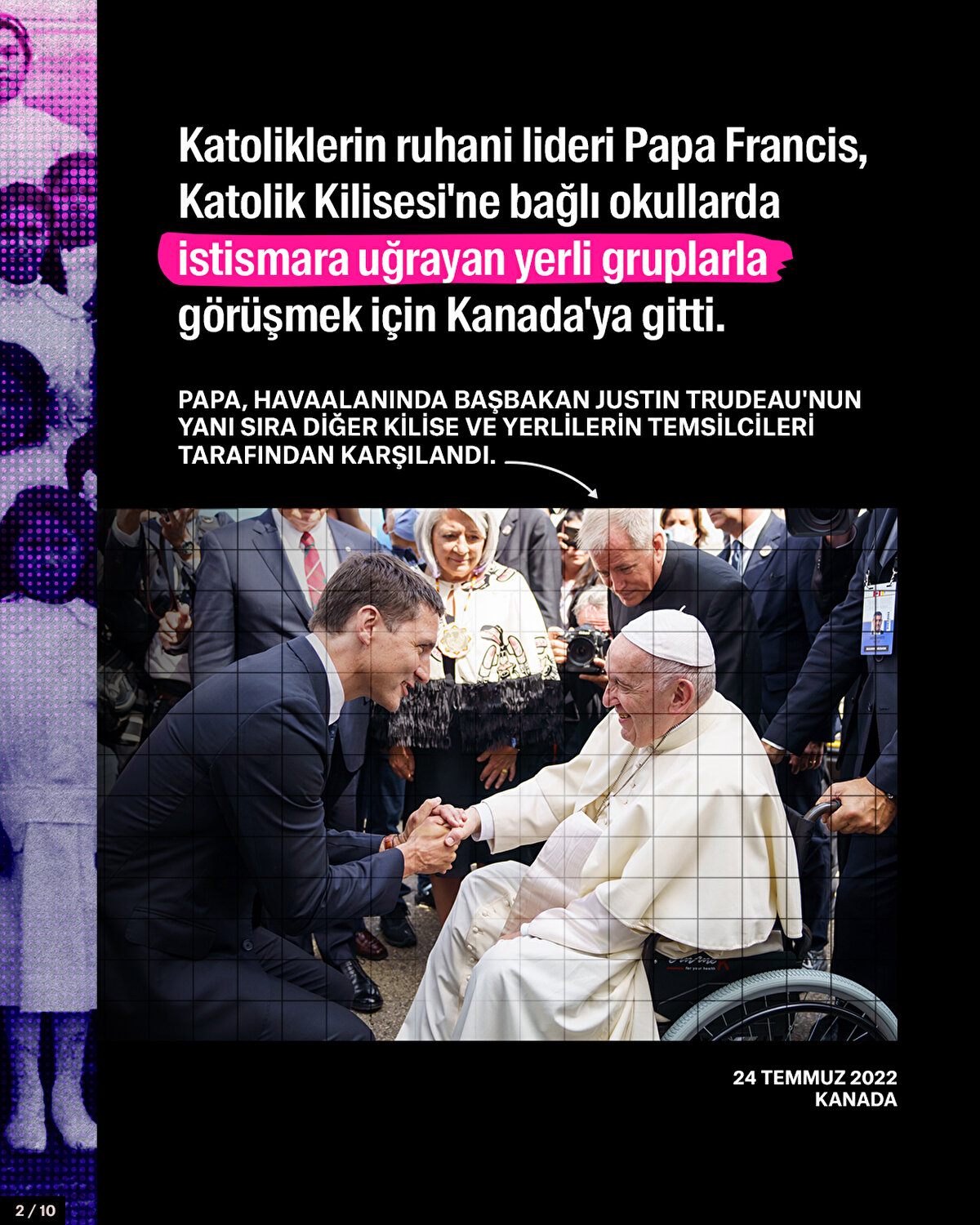 Katoliklerin ruhani lideri Papa Francis, Katolik Kilisesi'ne bağlı okullarda istismara uğrayan yerli gruplarla görüşmek için Kanada'ya gitti. Vatikan, 6 gün sürecek olan ziyareti 'tövbe haccı' olarak nitelendirdi. 1863'ten 1998'e kadar 150 binden fazla yerli çocuk ailelerinden zorla alınarak Katolik Kilisesi tarafından yönetilen okullara yerleştirildi. Amaç onların dilini, kültürünü ve inançlarını değiştirmekti. Yerli çocuklar bu okullarda tecavüze uğradı, fiziksel ve psikolojik şiddet gördü, açlığa maruz bırakıldı. Geçen sene Kanada'da bu okulların bahçesinde binlerce isimsiz çocuk mezarı bulundu. Katolik Kilisesi'nin çocuk istismarı vakaları bununla bitmiyor. Vatikan, kendisine bağlı kiliselerin bulunduğu çok sayıda ülkede rahipler hakkındaki cinsel taciz iddialarının üstünü örterek, binlerce çocuğun istismara uğramasına göz yummakla suçlanıyor.