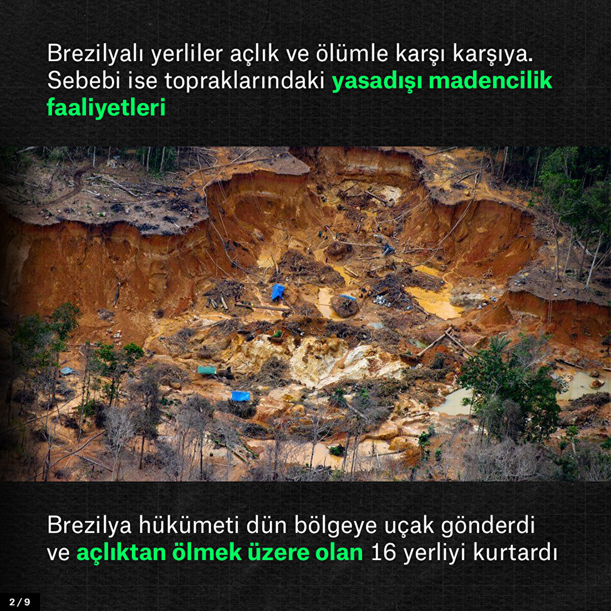 Brezilyalı yerliler açlık ve ölümle karşı karşıya. Sebebi ise topraklarındaki yasadışı madencilik faaliyetleri. Brezilya hükümeti dün bölgeye uçak gönderdi ve açlıktan ölmek üzere olan 16 yerliyi kurtardı. Amazon ormanlarının kuzeyinde yaşayan Yanomami kabilesi, yasadışı madenciliğin yıkıcı etkileri altında hayatta kalma mücadelesi veriyor